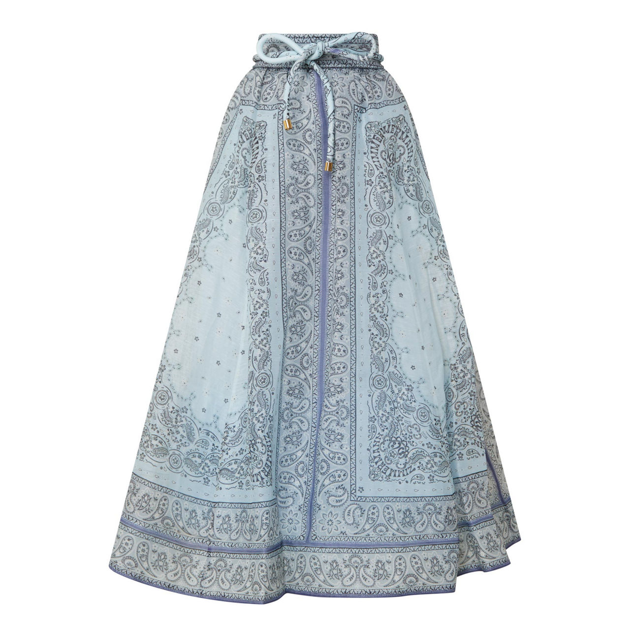 Zimmermann's SS24 collection showcases breathable, airy styles in a hue of watercolour gradients. Take this skirt; sitting high-rise on the waist, it features a thick tie-fastening belt and is covered in a swirl of paisley designs in a light wash colour. Fitted with handy slit pockets, it falls to a flared, midi-length finish and is secured by a back zip-fastening closure. Team with matching shirt for a coordinated ensemble.
