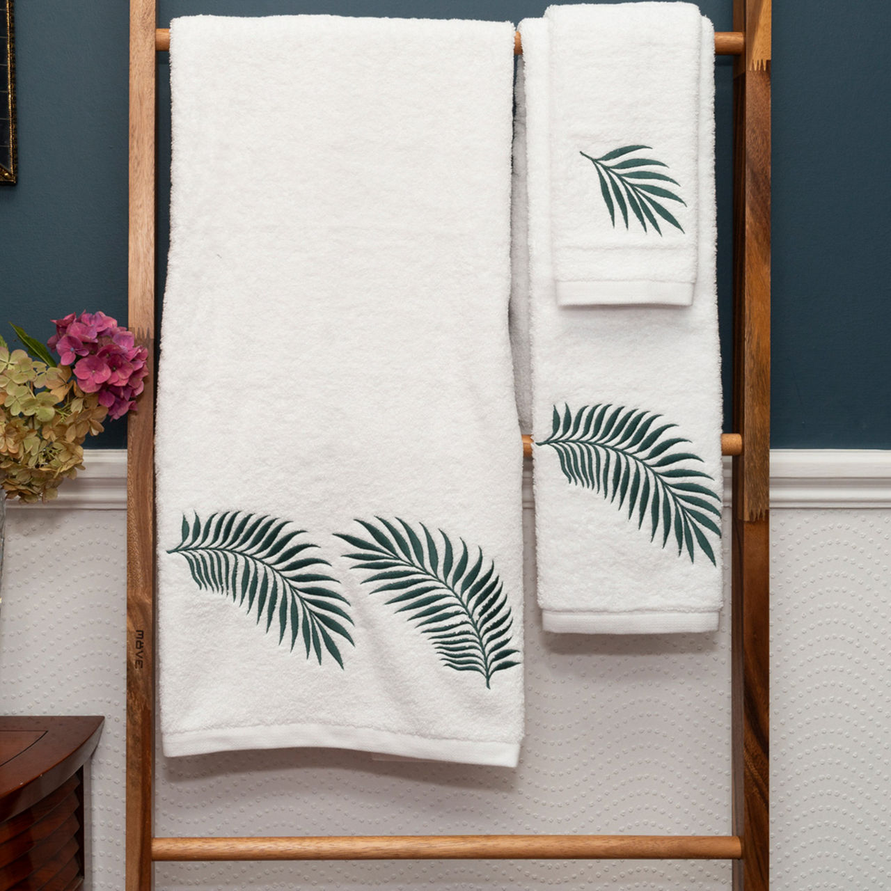 Piubelle have been making beautiful embroidered towels in Portugal for over 40 years. The new 'Palms' towel collection has a fine teal green embroidered motif on super soft deep pile 100% cotton terry.