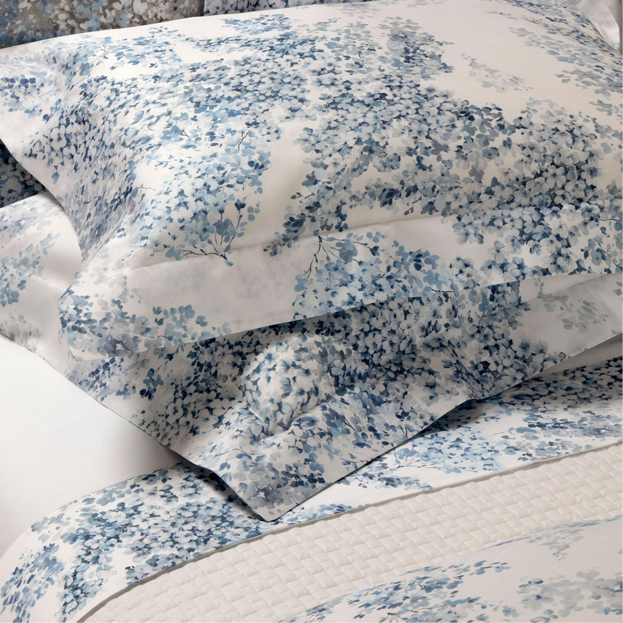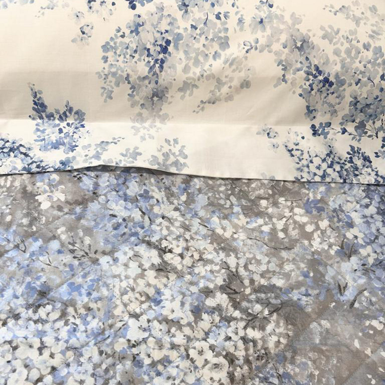 One of Italy's finest bedlinen brands, Dea create beautiful bedlinens and bedspreads in exquisite cotton sateen. 'Glicine', in gorgeous shades of pastel blues, suggests a haze of dreamy florals with a fresh snow white backround. Dea bedlinen is incredibly soft to touch creating a wonderfully comfortable sleeping experience. The duvet cover has button closing whilst the pillowcases have a smooth oxford border on 4 sides. The coordinating lightweight bedspread looks fabulous folded at the end of bed, or can be opened up to cover the bed completely to the floor, a wonderful option for warmer summer nights. The boudoir cushions will dress the bed in inimitable Italian style.