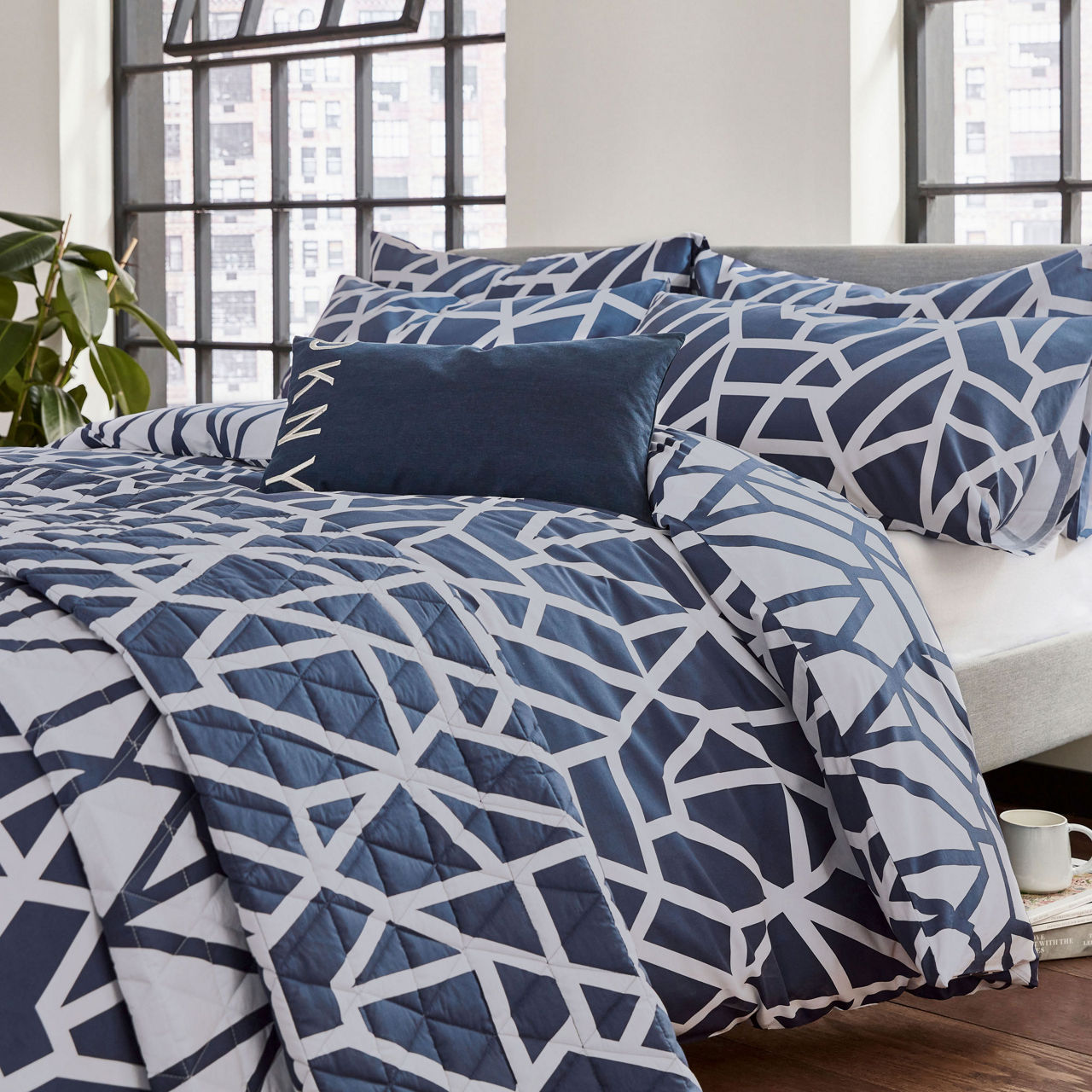 Settle into sleep with this eye-catching design from DKNY, featuring a striking geometric pattern in cool navy and grey tones, printed on 180 thread count cotton percale for a soft, relaxed feel. Available in Single, Double, King and Super King size sets which include standard pillowcase(s). A large quilted throw is great to add warming layers on colder Winter nights and is sold separately. A signature DKNY completes the look.