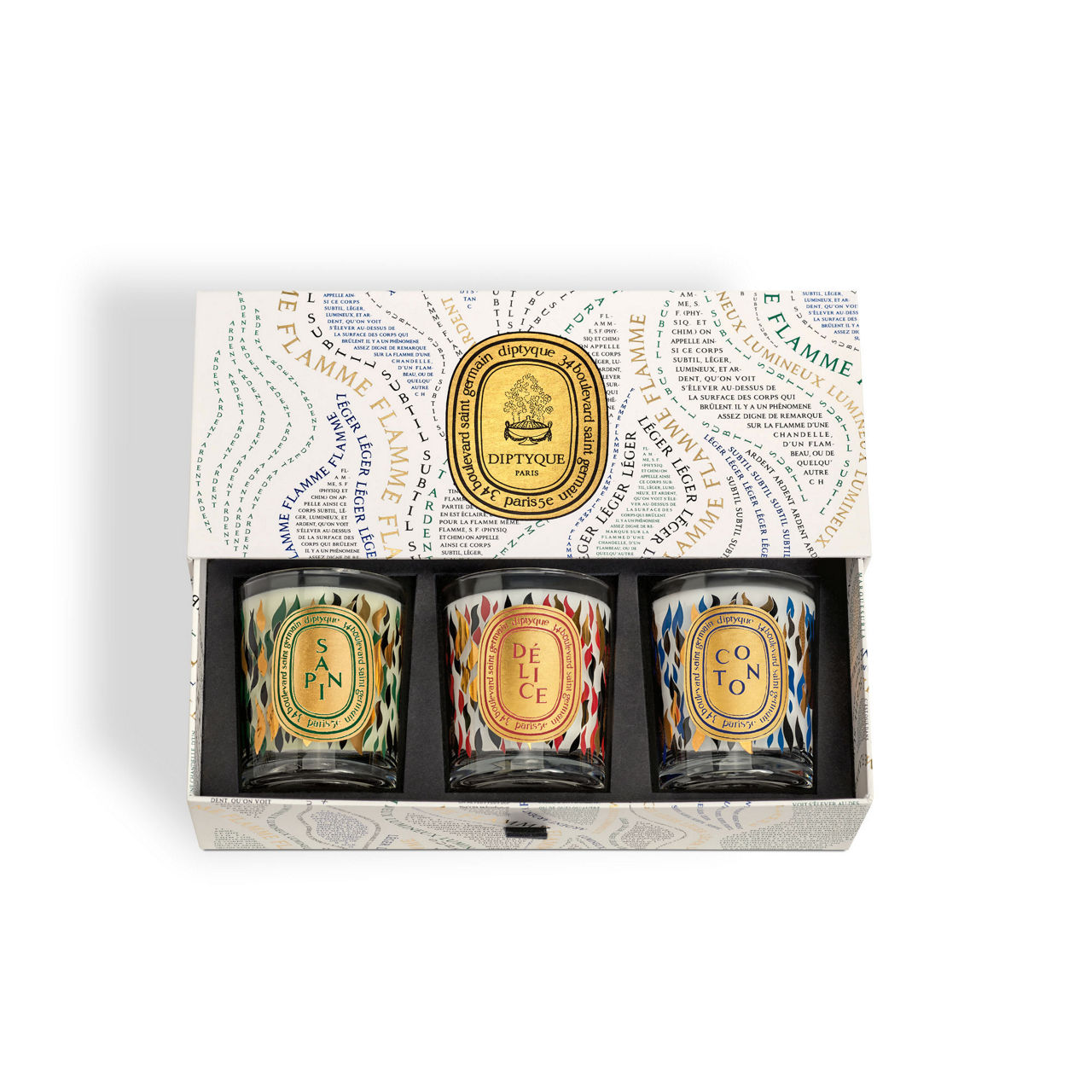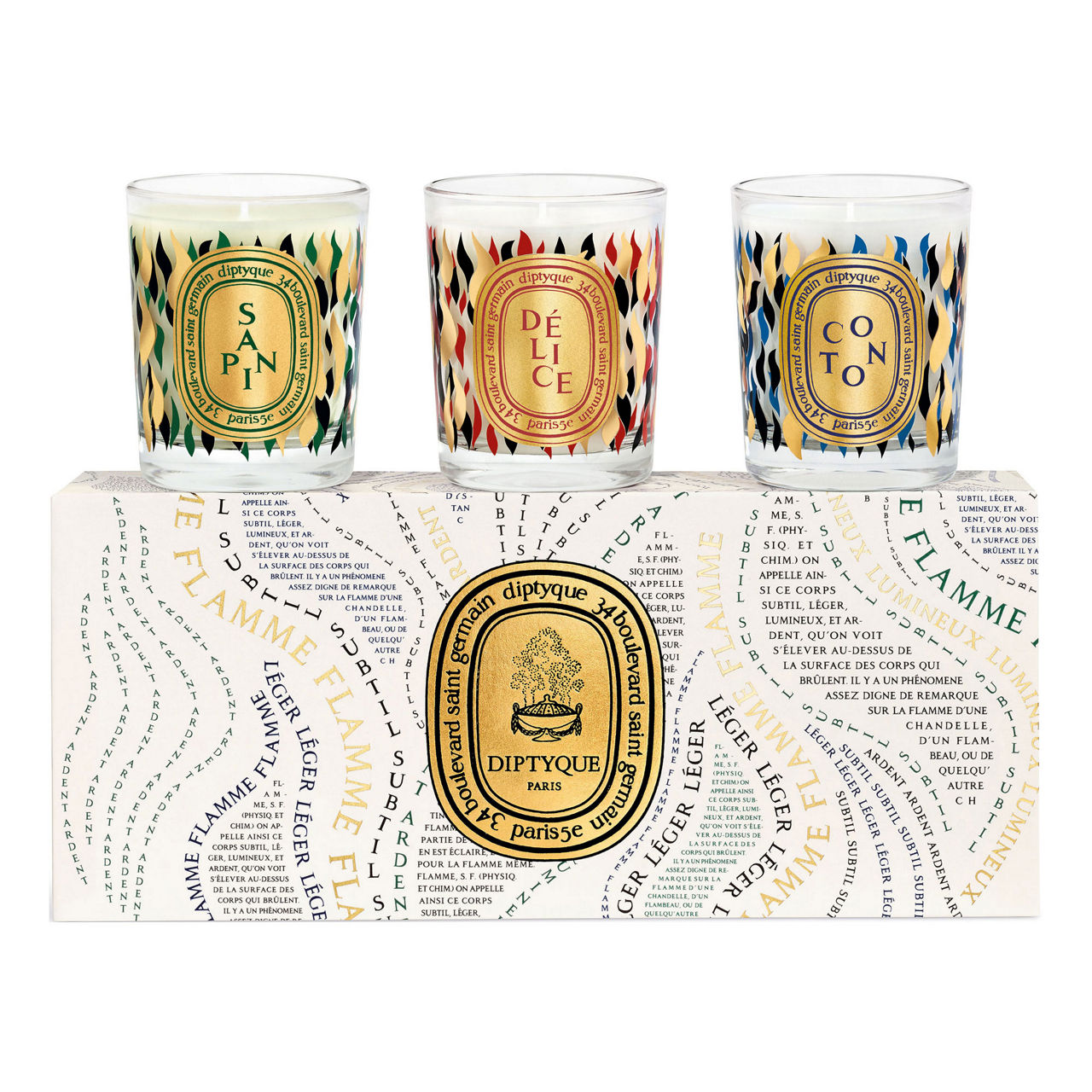 To celebrate the holiday season, Diptyque is showcasing the magic of the flame in a unique manner. In the form of a calligram inspired by the poetic definition found in the Encyclopédie des Lumières, "flame" becomes the central motif of a special collection. A warm, festive ambiance is assured with these new candles – the perfect gift for anyone who loves the year's end festivities and happy moments illuminated by dancing flames. Sapin (Pine Tree), Délice (Delight), Coton (Cotton): small candles with winter scents, together in a limited edition gift set to celebrate the holiday season.