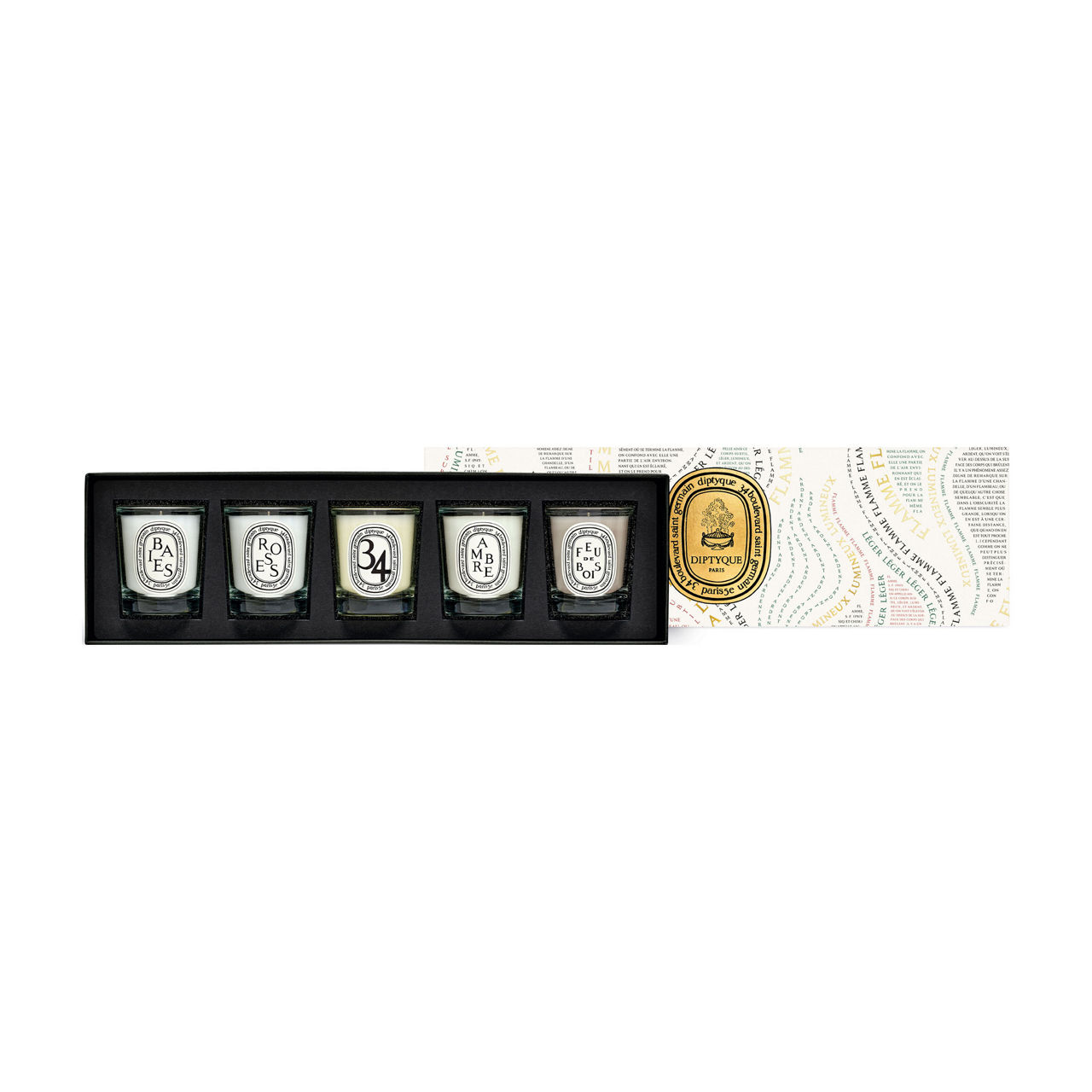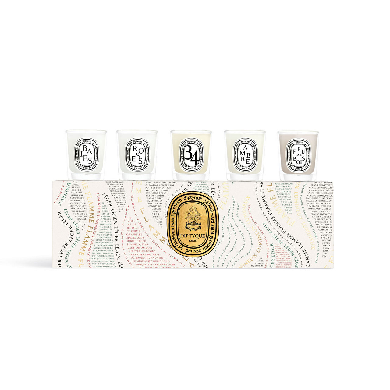 To celebrate the holiday season, Diptyque is showcasing the magic of the flame in a unique manner. In the form of a calligram inspired by the poetic definition found in the Encyclopédie des Lumières, "flame" becomes the central motif of a special collection. The flames that dance above these five candles symbolise conviviality, and are sure to weave their spell over your guests. The perfect gift and an ideal introduction to the Maison's iconic scents. A welcome addition to any festivities: five small candles – Baies (Berries), Roses, 34 Boulevard Saint-Germain, Ambre (Amber) and Feu de Bois (Wood Fire) – in a limited edition gift set.