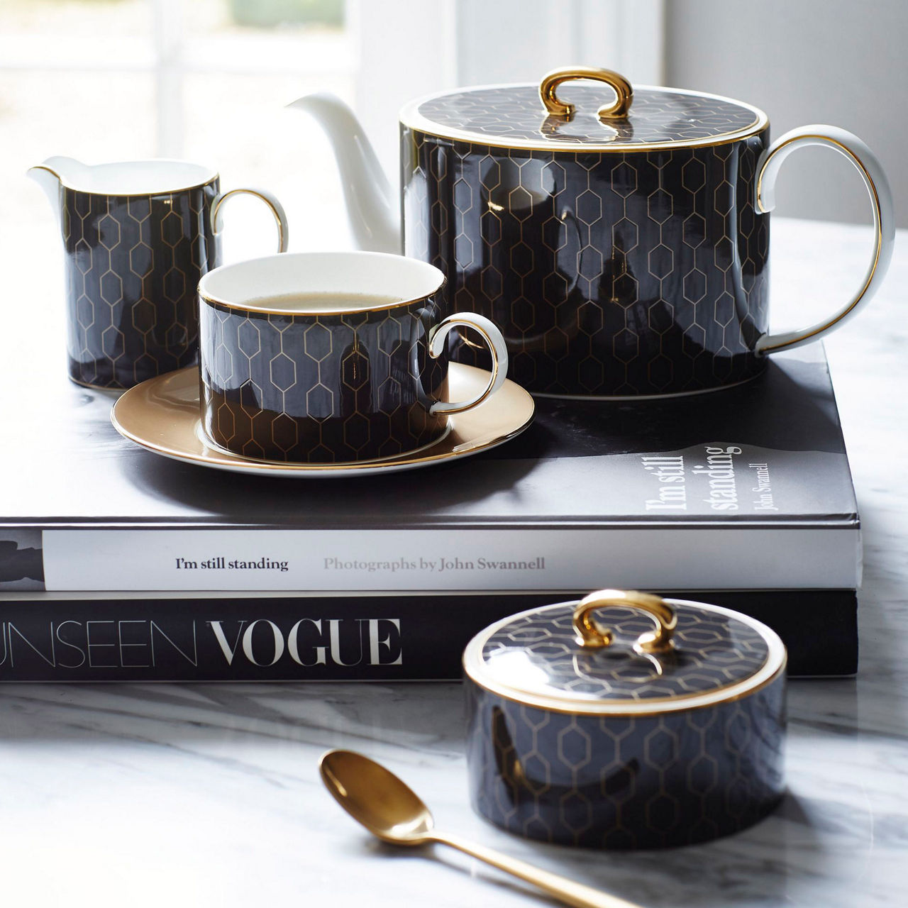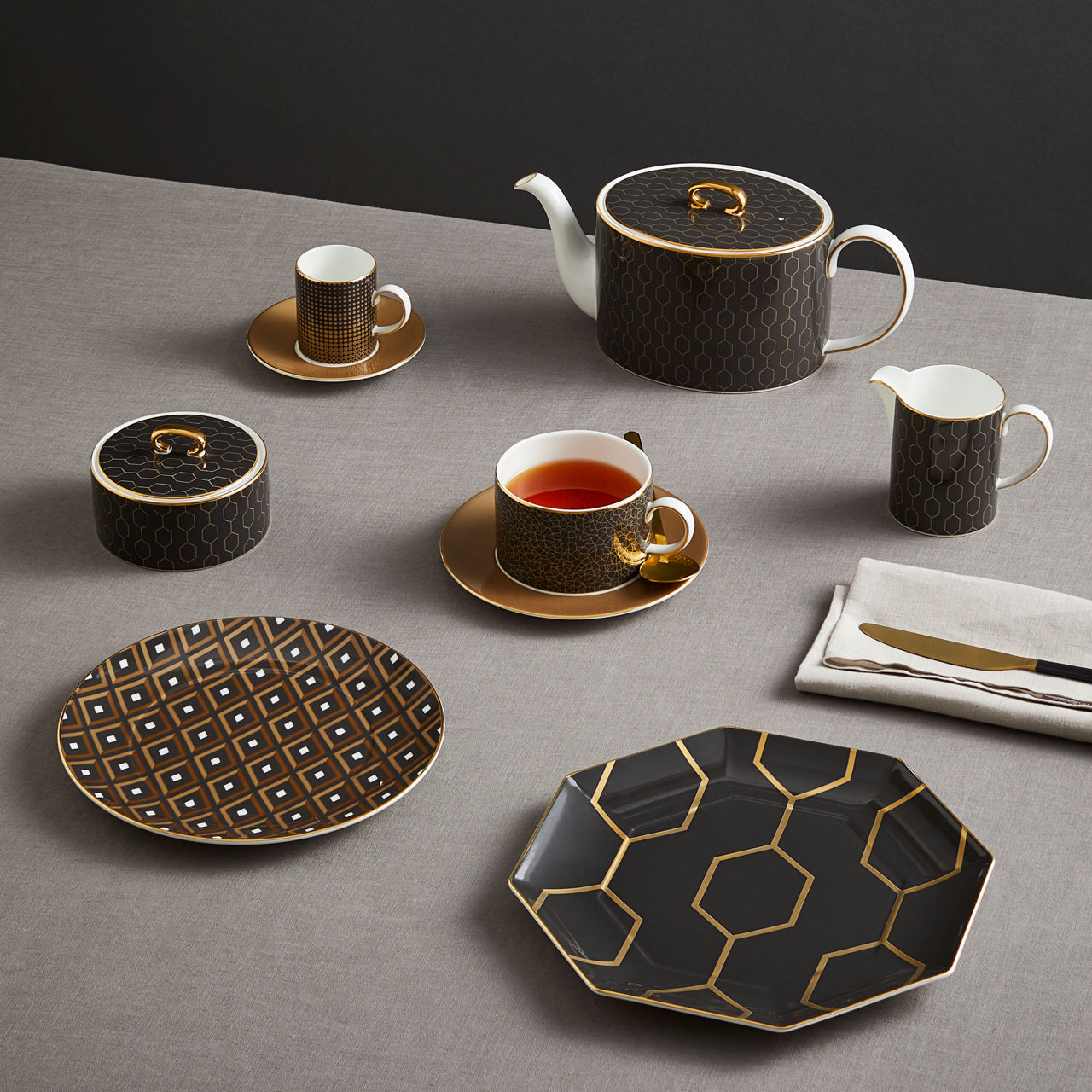 Gio Gold offers a gilded collection of sophisticated ceramics. With geometric shapes, charcoal black, pure white and gold accents, this distinctive range of Wedgwood delivers a sharp, modern style. Innovative shapes and block colours ensure the service makes an impact whatever the situation – from coffee with friends to dining á deux. Designed by experts at Stoke-in-Trent in England, Gio Gold lets you design your own collection, gold piece by gold piece.