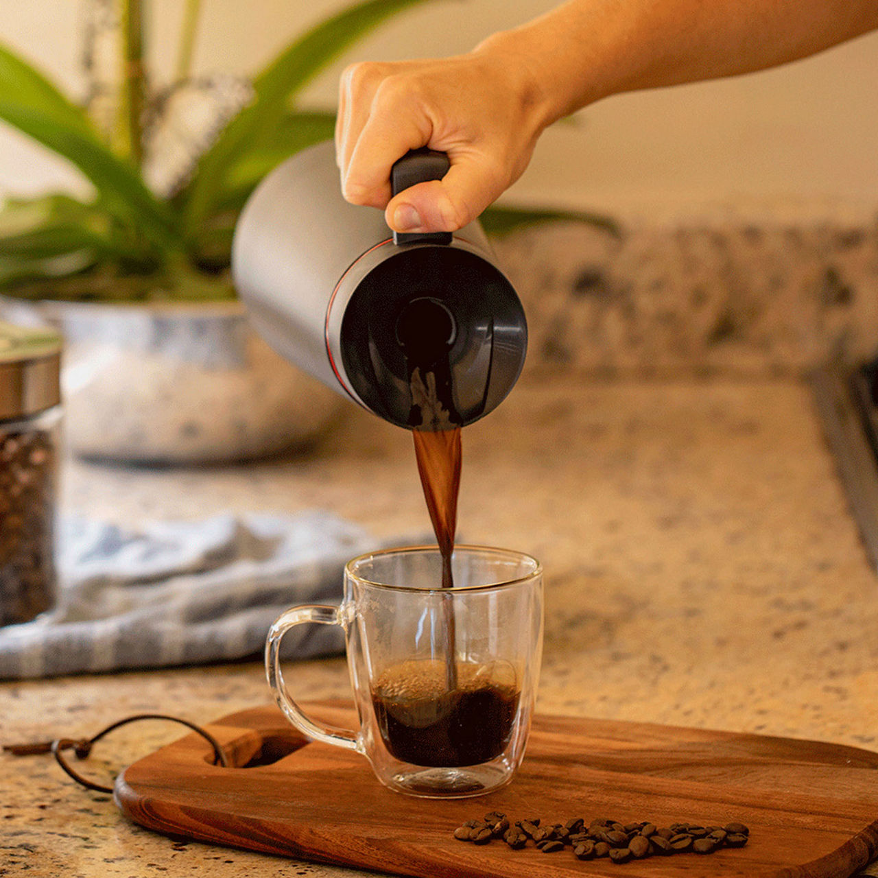- Keeps beverages cold for 9 hours and hot for 12, ergonomic handle for comfort, fingerprint-proof design, screw top lid to ensure a drip-free pour, interior glass container