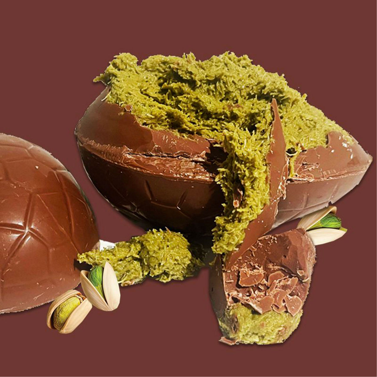 Creamy milk chocolate with pistachio cream & kataifi pastry filling, rich and smooth texture, indulgent and crunchy bite.