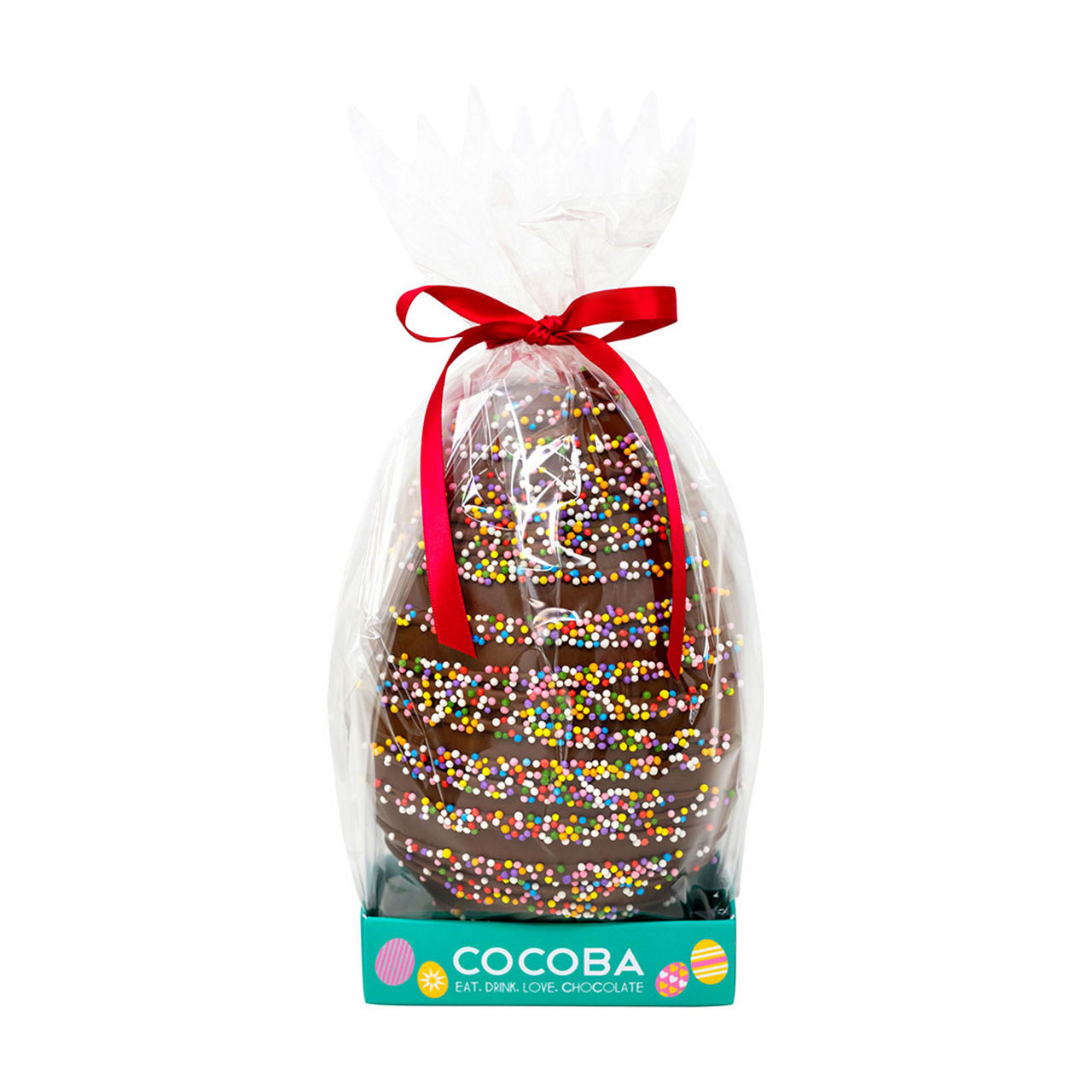 A Bright Easter Egg Made Of Belgian Milk Chocolate, with colourful sprinkles generously added on top.