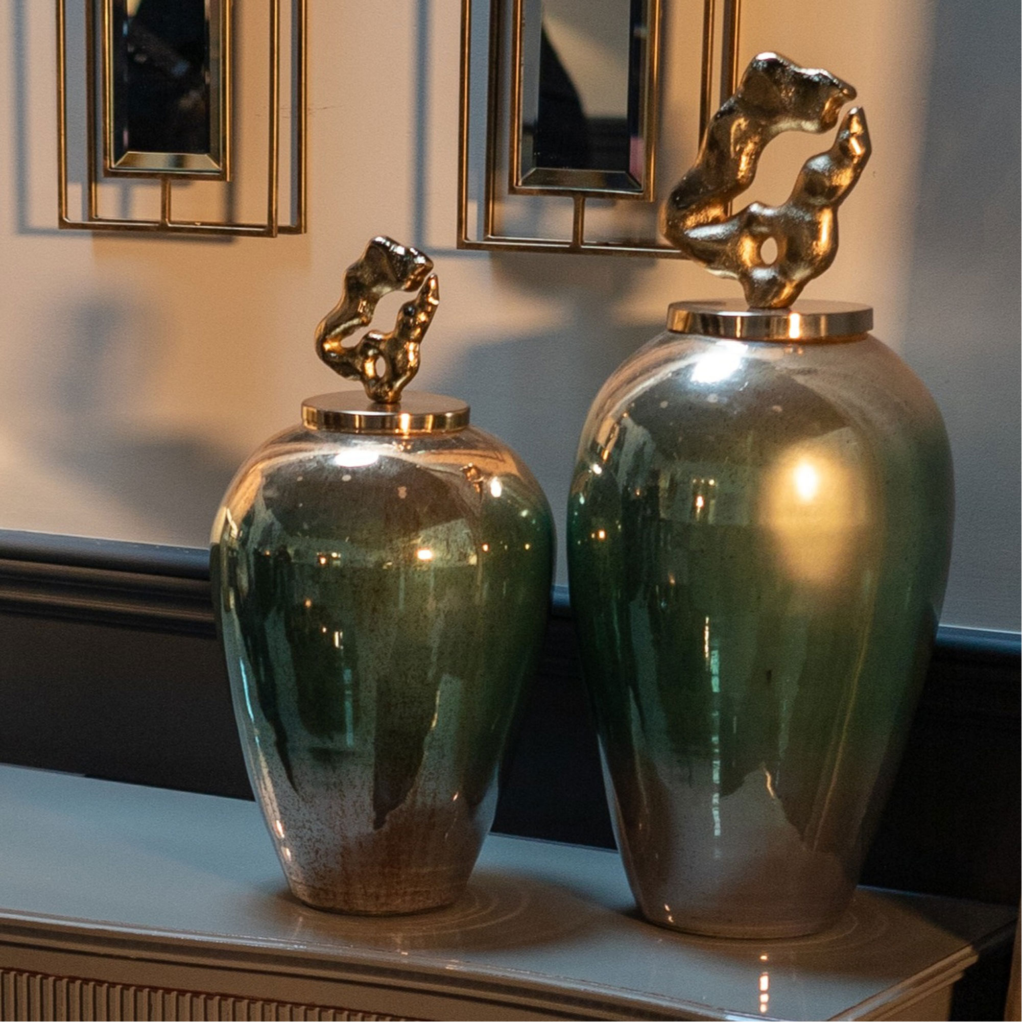 The Betany jars from Mindy Brownes , presented in a trio of sizes, stand as the epitome of perfection for discerning connoisseurs of elegance. Embellished with a resplendent three-color ombre effect, showcasing opulent shades of gold, green, and white, these jars are crowned with a gilded, almost art-like sculpture lid. Immerse yourself in the world of ultimate luxury with these exquisite styling accessories.