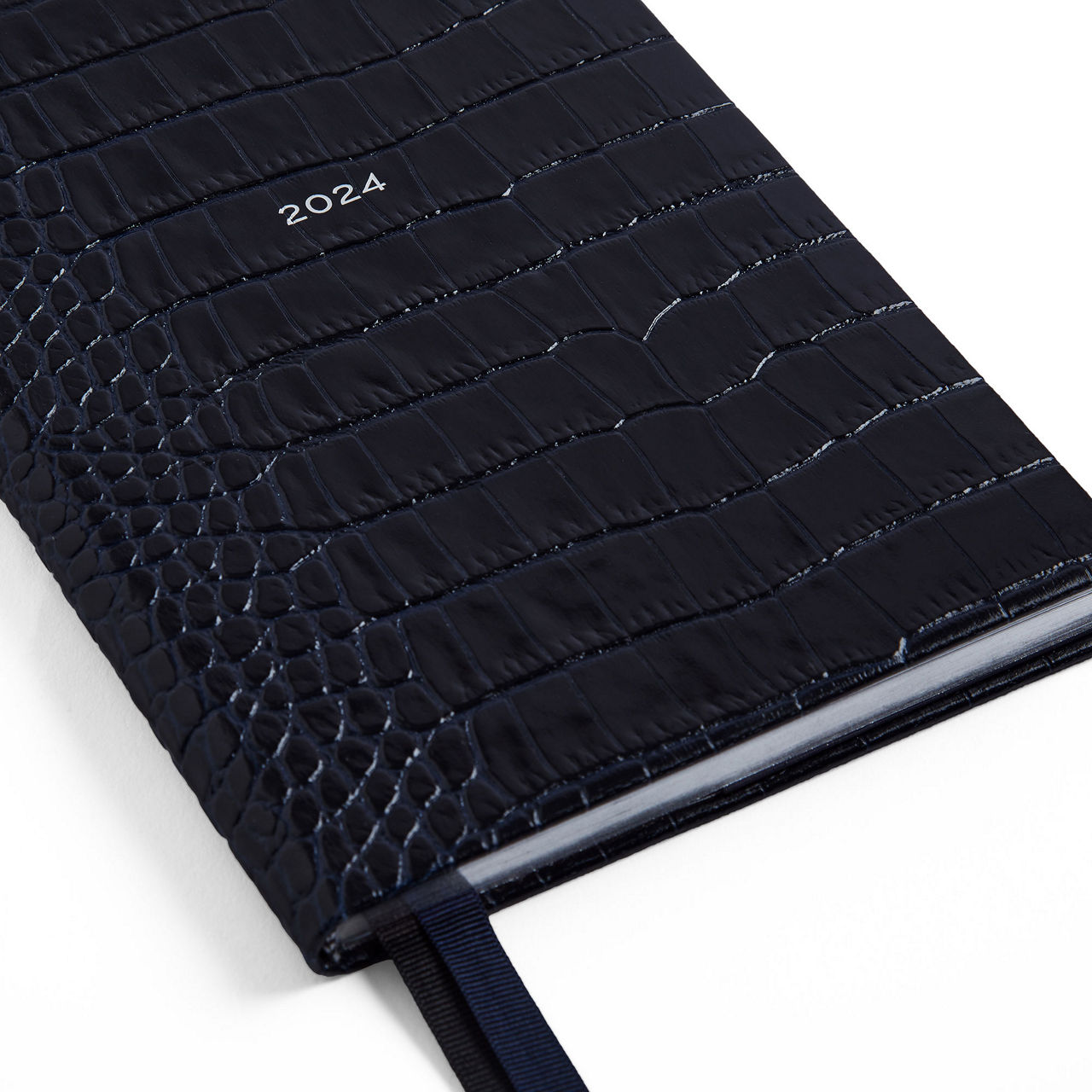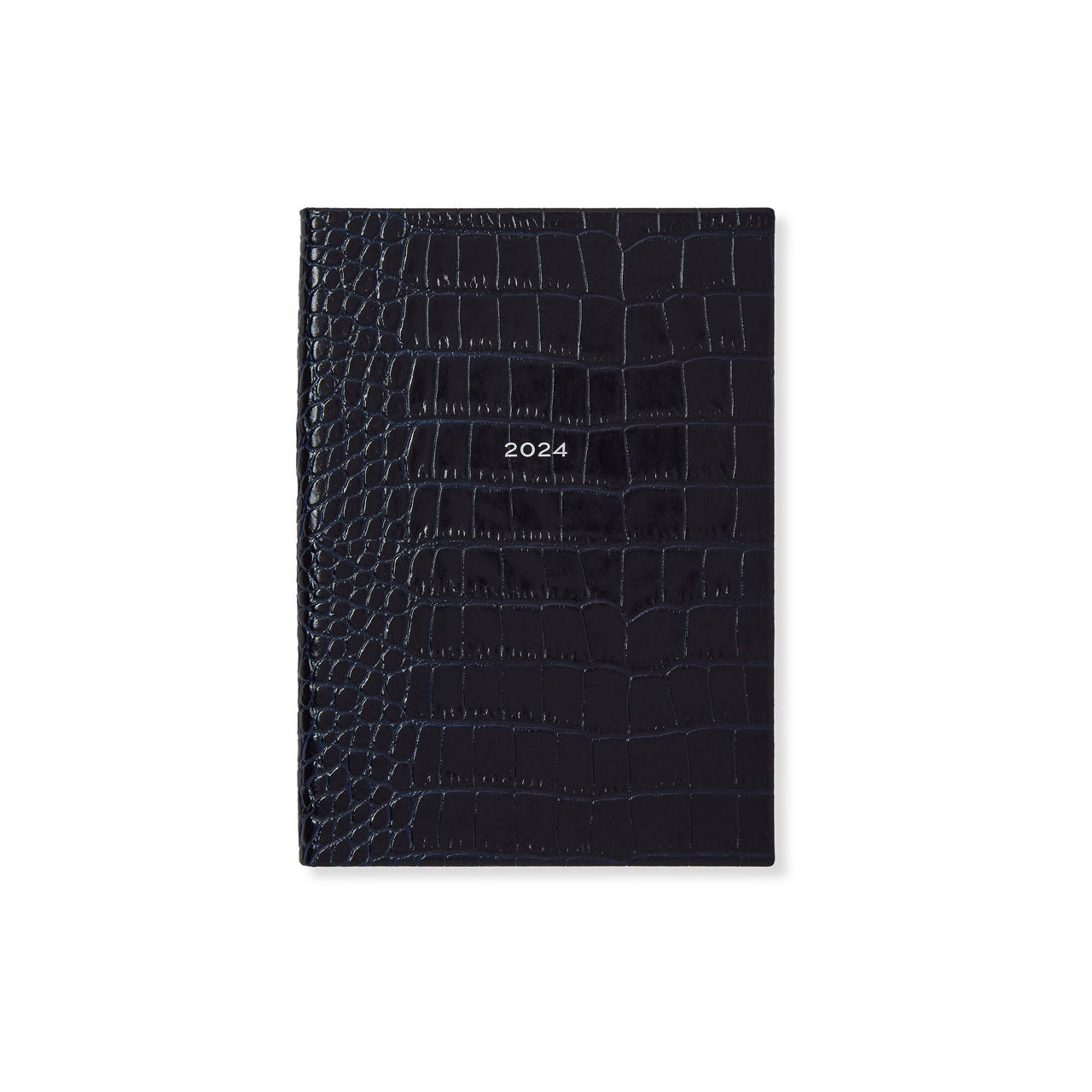 - Week-to-view layout, gilt-edged, pale blue Featherweight paper, slip pocket, croc-embossed finish, silk lined, runs from Monday 13th November 2023 to Sunday 19th January 2025