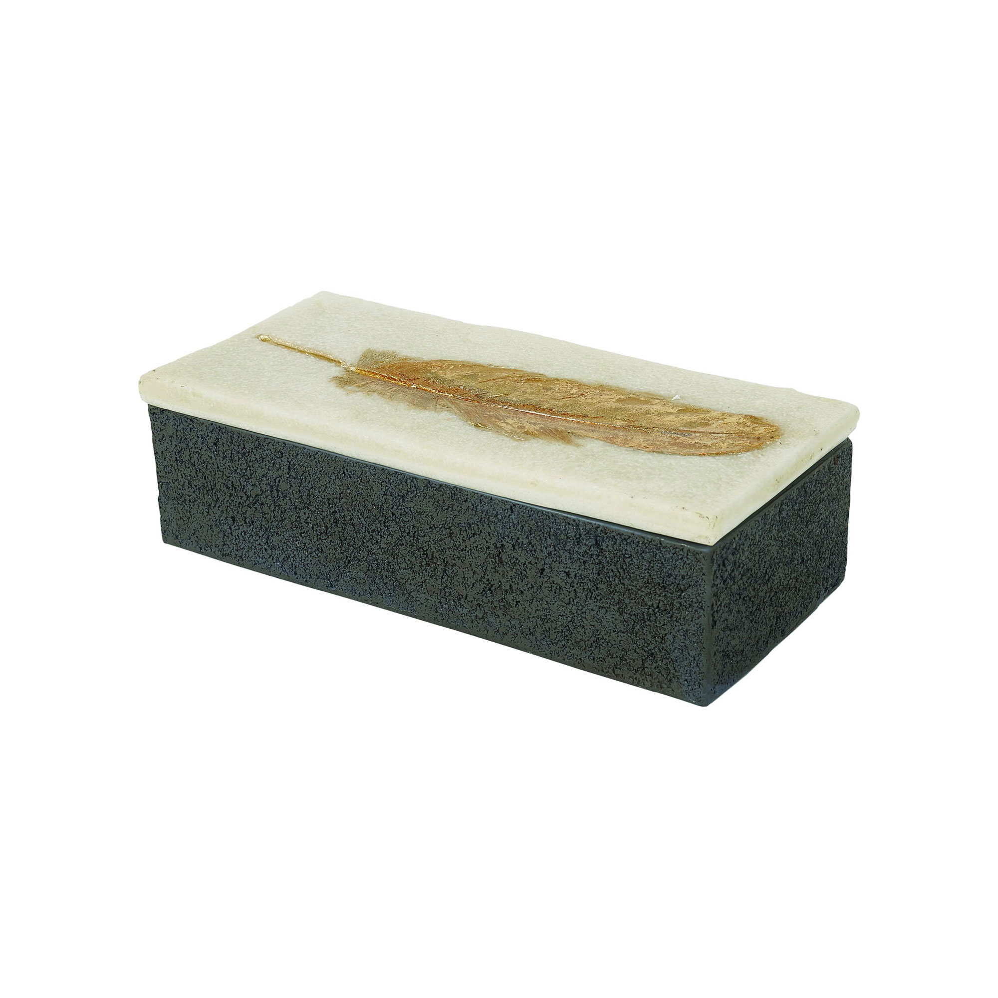 A faux granite inspired box from Mindy Brownes with embossed gold feather, ideal for shelf styling or the perfect coffee table accessory.