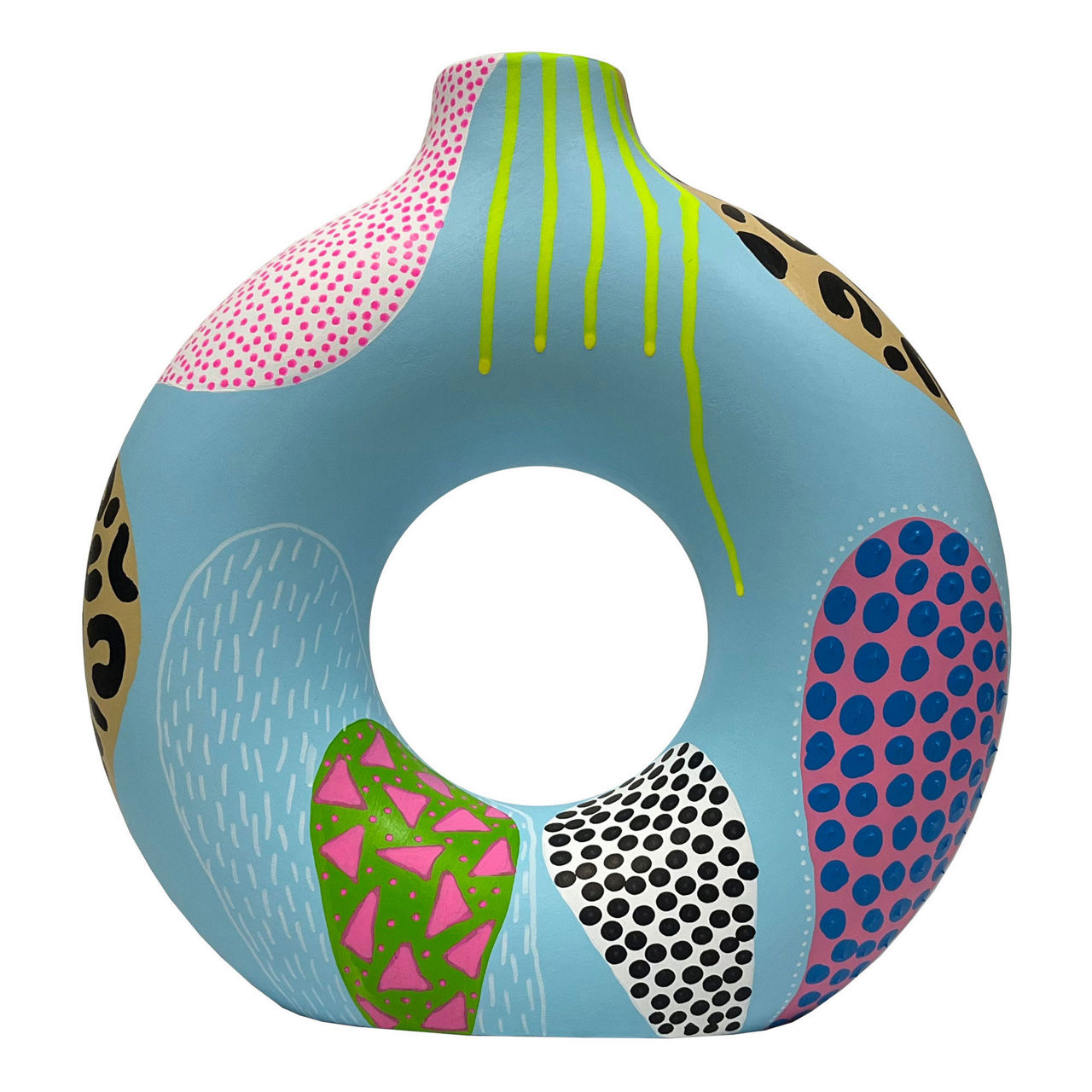 Irish contemporary artist Ciara O'Neill draws inspiration from Aboriginal art and artist Andy Warhol in the creation of her original artwork, seen adorning this vase. Crafted from ceramic to a large donut shape, it is finished with vibrant hand-painted details. This playful design is the perfect gift and is sure to brighten up any space.