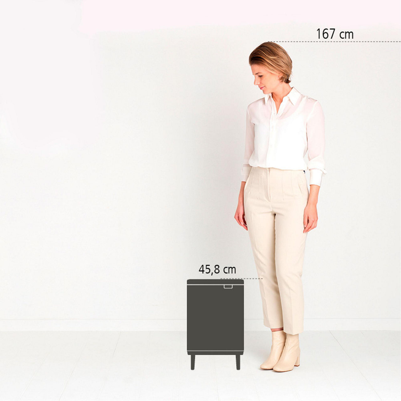 - Space efficient - S volume (12L).Easy to use - lid can be opened manually from left, right and front.Smooth - soft closing lid.Hygienic - removable plastic inner bucket.Easy to move - transport grip.Perfect match - sample pack of Brabantia PerfectFit bin bags enclosed (code C).Problem-free use - 10 year guarantee and service.Planet friendly - Cradle-to-Cradle® Certified, Bronze level.More sustainable choice - made from 47% recycled material and 98% recyclable after use.