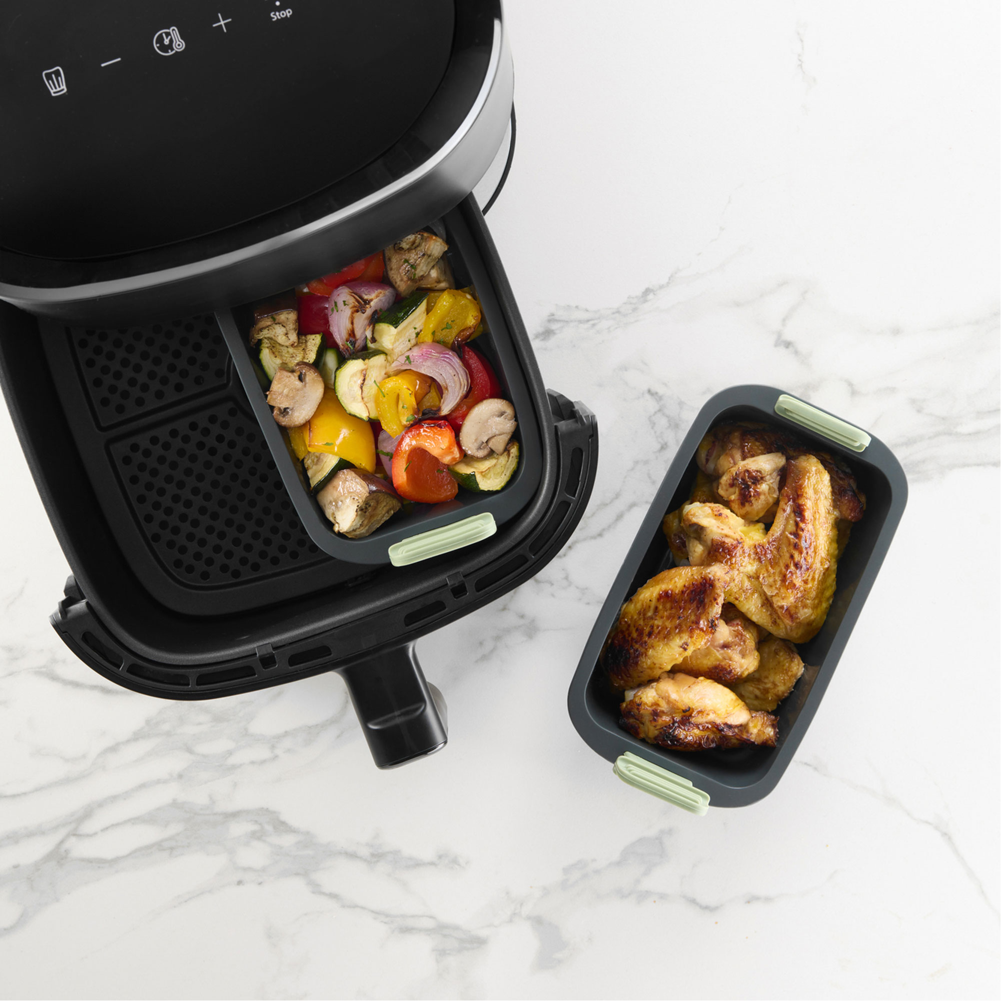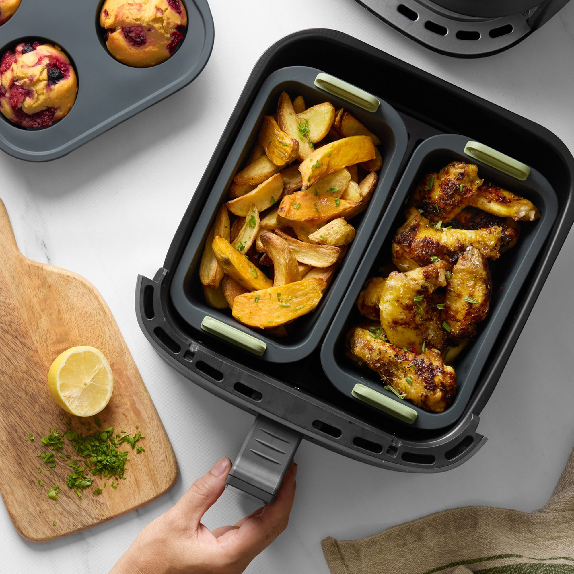 Enjoy easier and cleaner cooking with this platinum silicone air fryer basket featuring extendable non-slip handles for comfortable use and the ability to cook two dishes at once without mixing flavours.