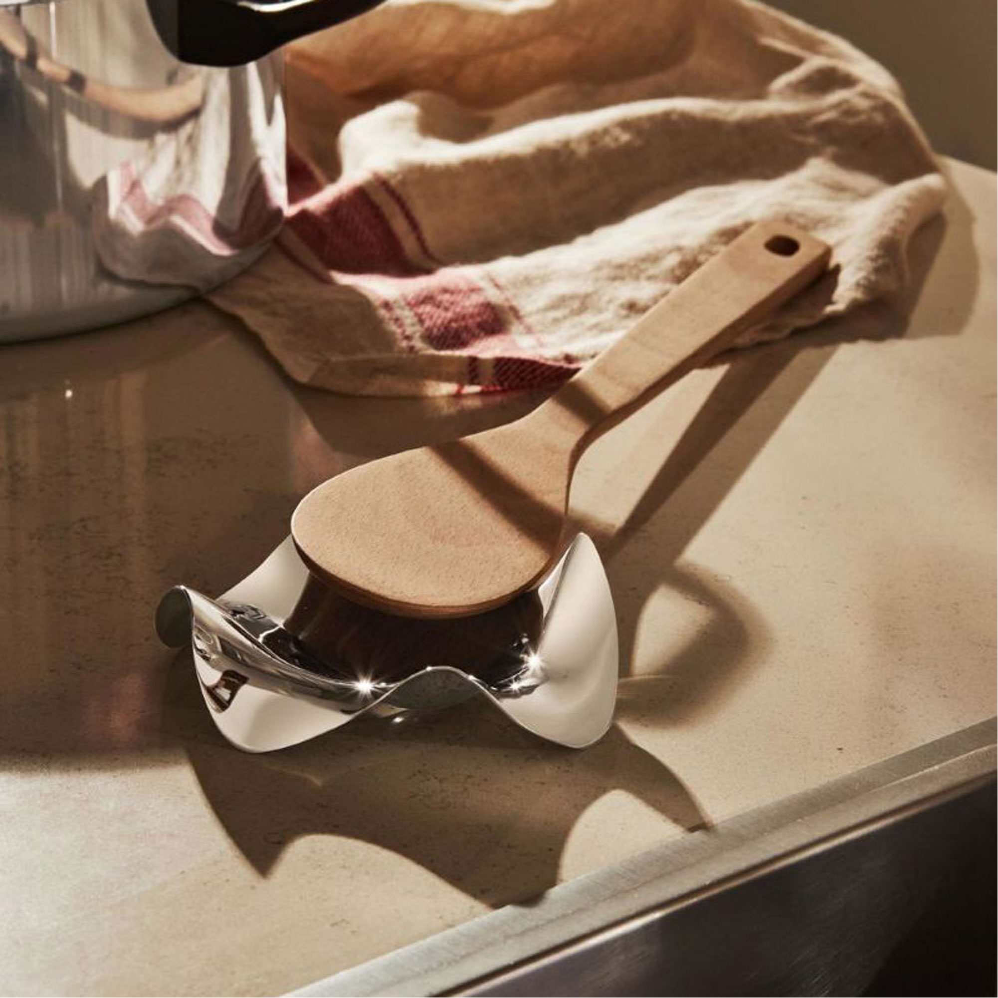 Designed by Paolo Gerosa for Alessi. The name “BLIP” alludes to the wave from a drop in water. The form is made from a thin sheet of steel and is cleverly resolved to cradle spoons and ladles of different lengths and sizes. Lightweight, formally discreet but also elegant and precious.