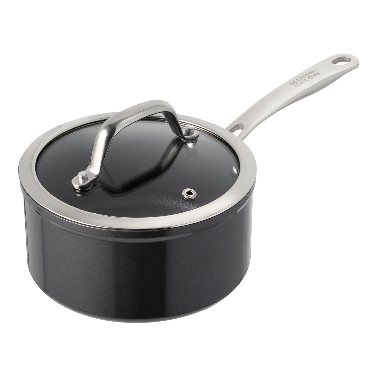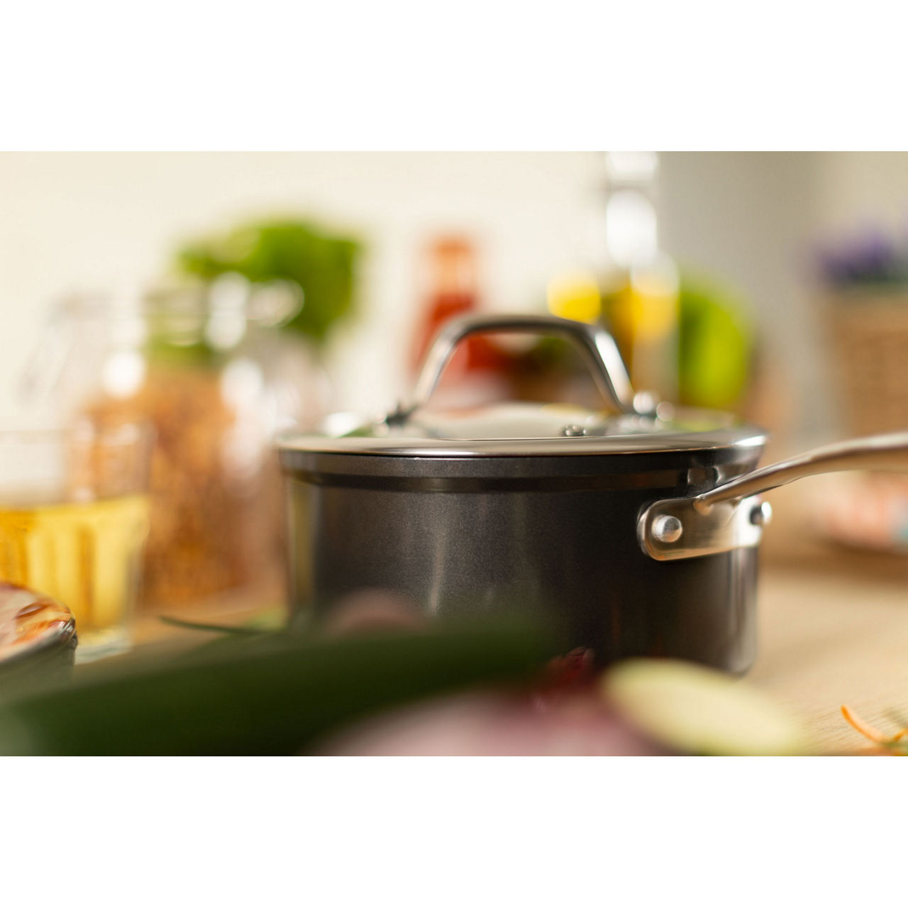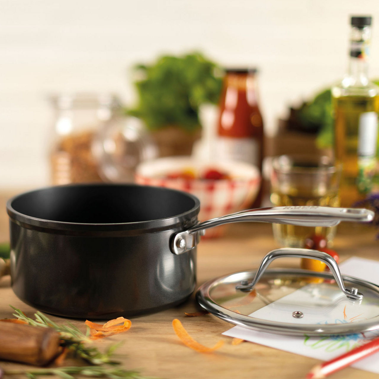 - Aluminium saucepan with even heat distribution, glass lid for full-view cooking, three-layer non-stick coating reinforced with titanium particles, durable, ergonomic stay-cool handle, easy to clean