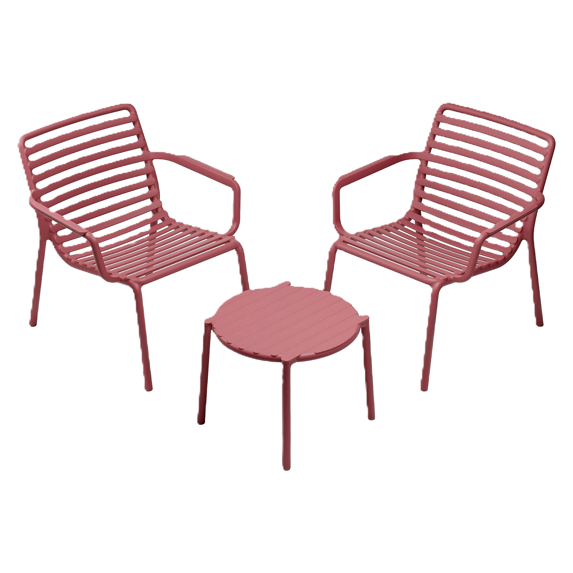 The Doga Garden Bistro Set features two low relaxed armchairs and a low round table, designed for outdoor use. Made from fibreglass resin, this lightweight set features a contemporary slatted design and is stackable, handy to move, and easily sanitised.
