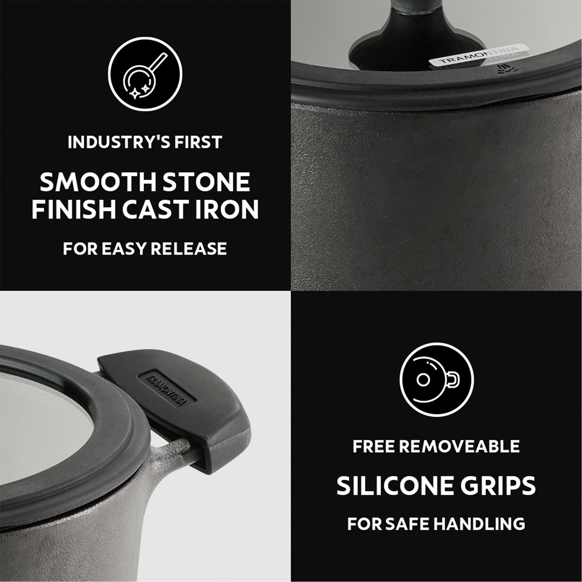 - Composition and Care: Cast iron, glass lid with silicone rim, and handles with silicone grips. Hand wash with soap and a soft sponge, a dishwasher will remove the seasoning and likely cause rust