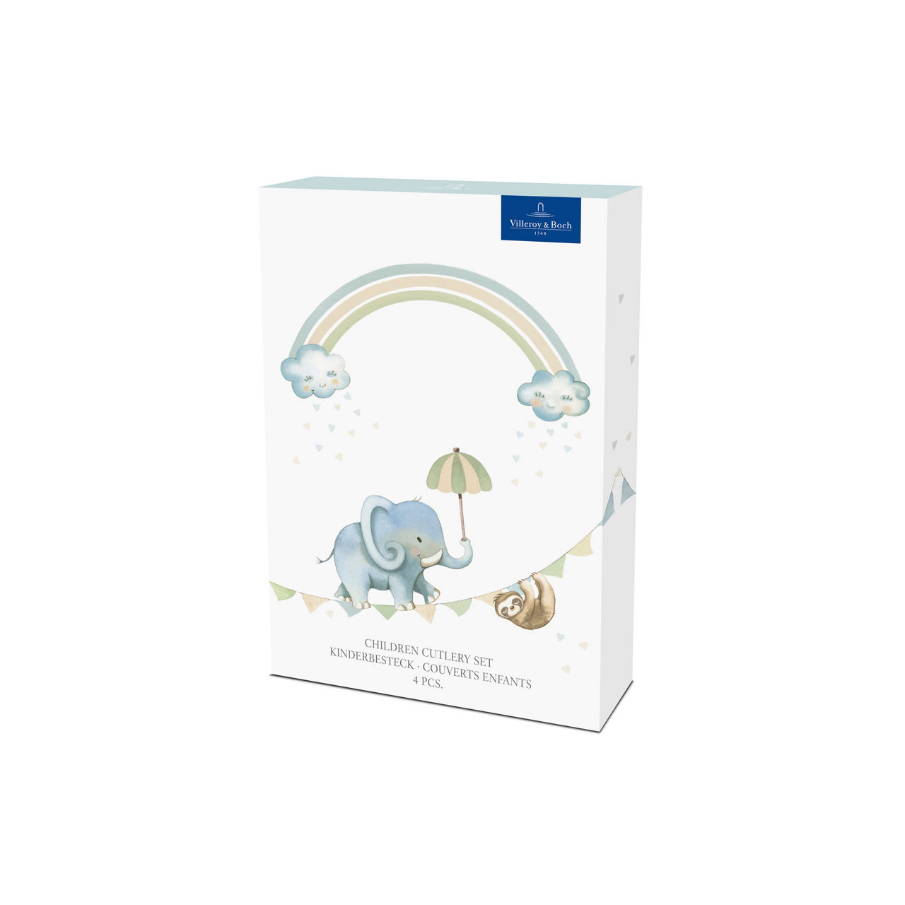 • 4-piece set, includes one fork, one knife, one spoon, one teaspoon, child-friendly designs, stainless steel finish, elephant and sloth engraved details