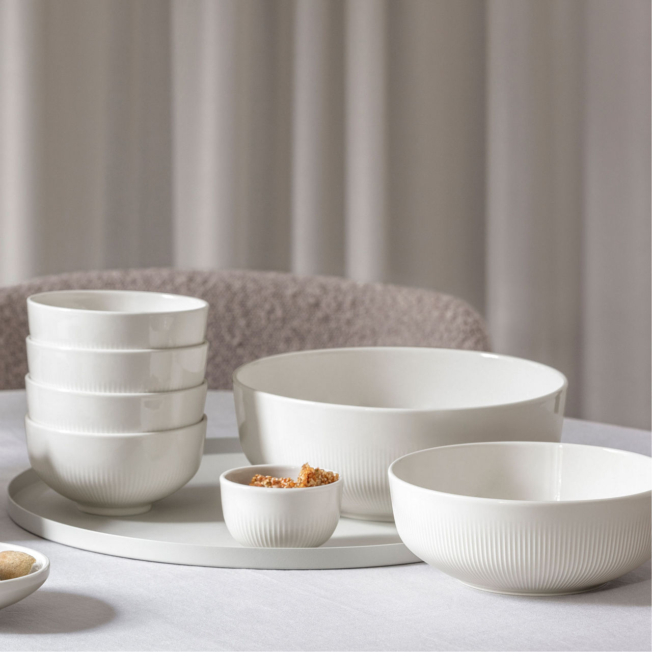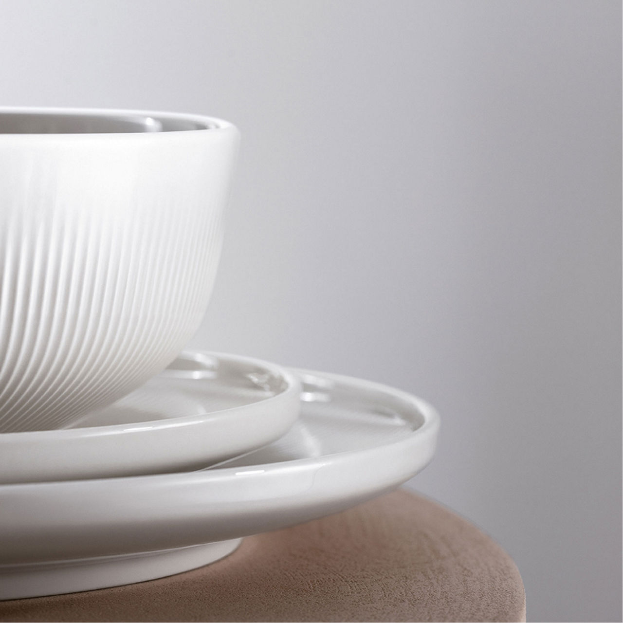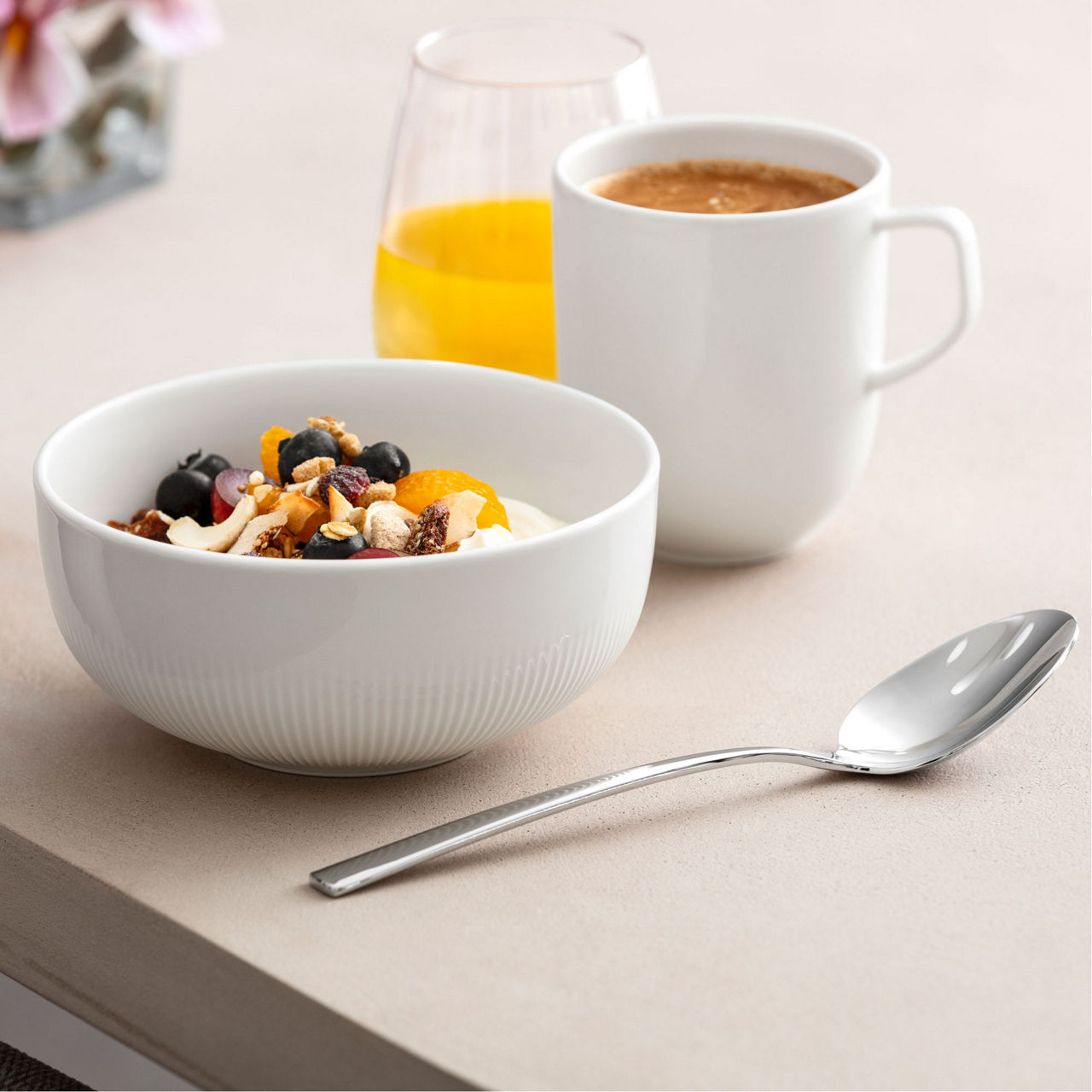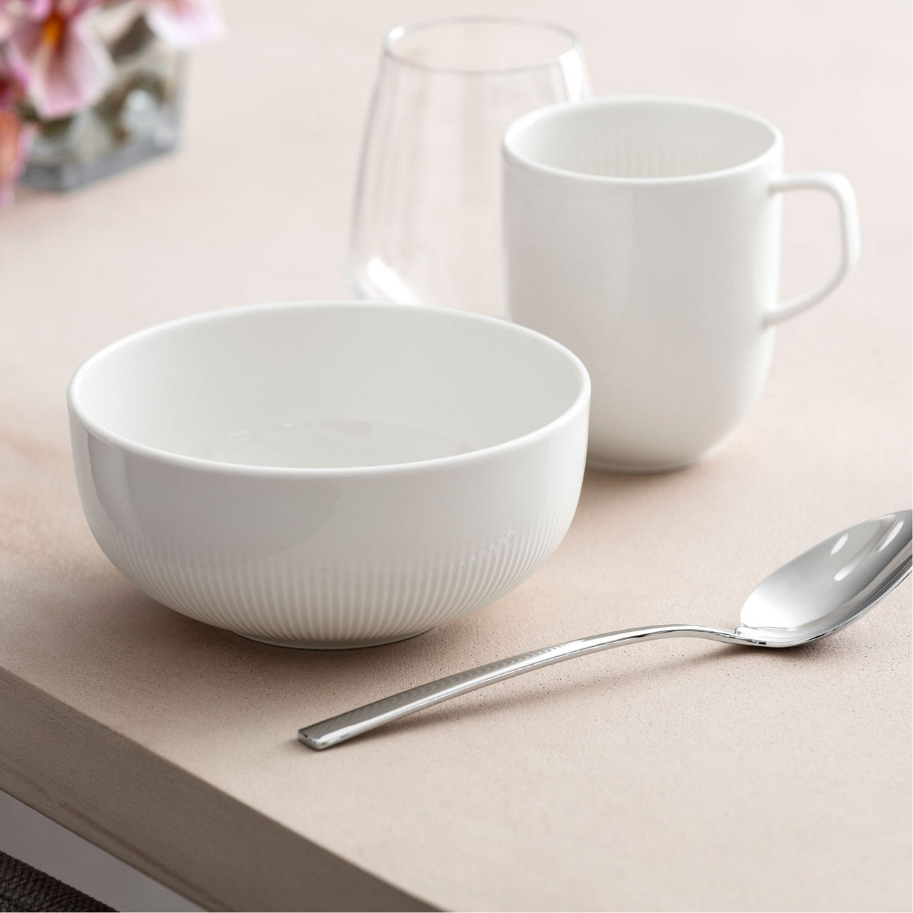 The Afina tableware collection from Villeroy & Boch is inspired by the lifestyle trend of sophisticated taste. The clear shapes come together with fine details to create a modern coupe shape with a raised rim. Inspired by concentric rays of sunshine, it features a fascinating ring-shaped relief that creates an exquisite tactile experience. The special floating appearance is emphasised by a carefully concealed base area. With its generous dimensions and versatile design, this bowl from the collection is perfect for serving muesli, yoghurt, fruit and other delicious bowl foods.