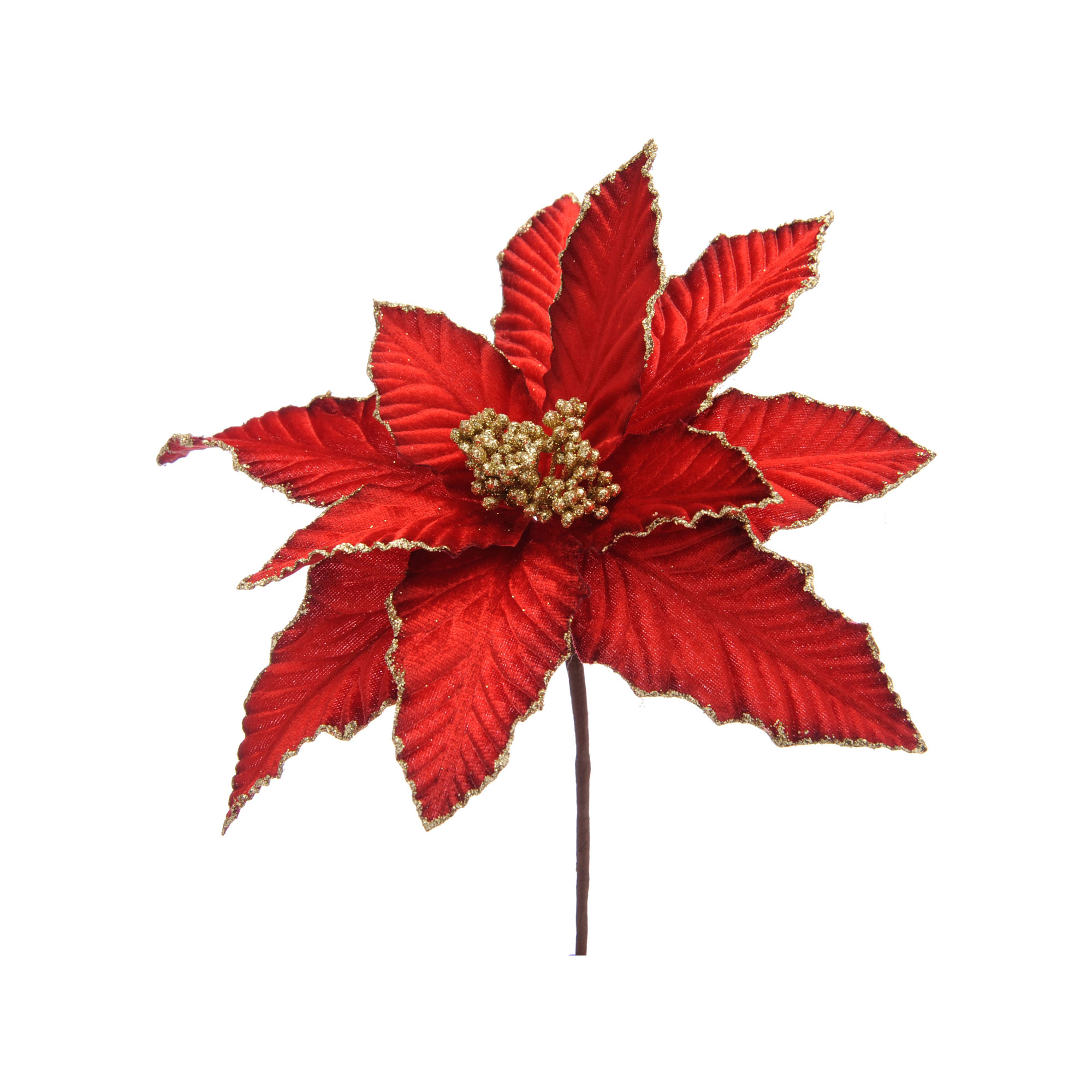 - Poinsettia stem, gold glitter edging, bold festive colours, perfect for adding dramatic flair to wreaths, garlands, vases, or Christmas tree arrangements