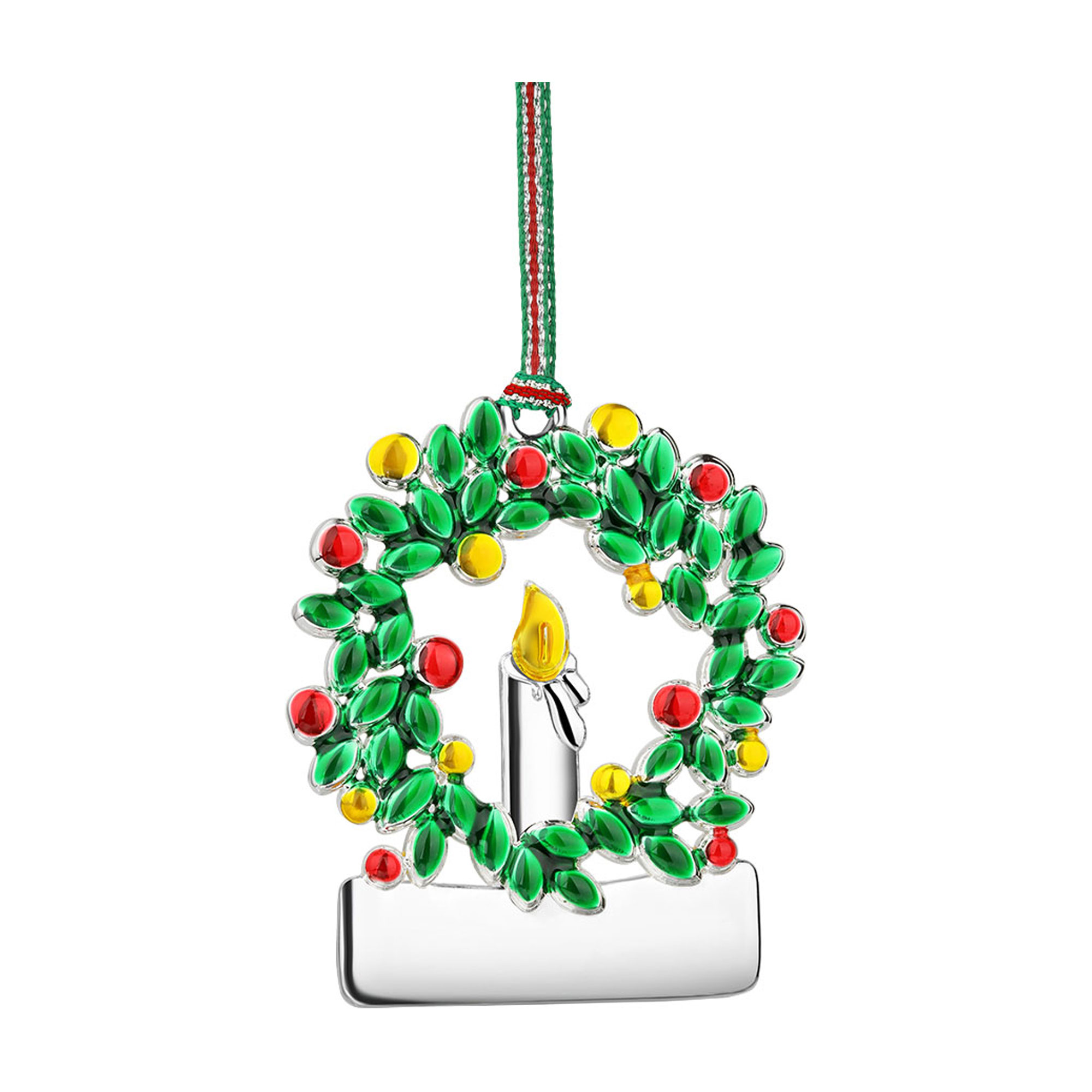 • Silver-plated, protective anti-tarnish layer, 'Wreath with Candle' design, enamel detailing, festive hanging ribbon, presented in Newbridge Silverware Christmas Collection packaging