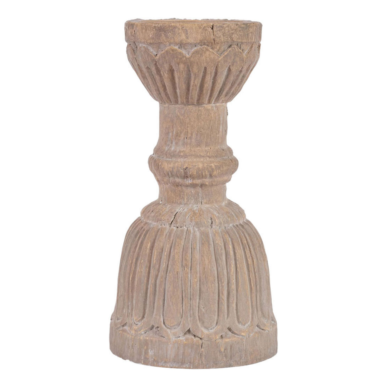 Elevate your home décor with this elegantly handcrafted pillar candle holder from Mindy Brownes. Featuring a beautifully carved design with intricate fluted details, this piece exudes rustic charm.