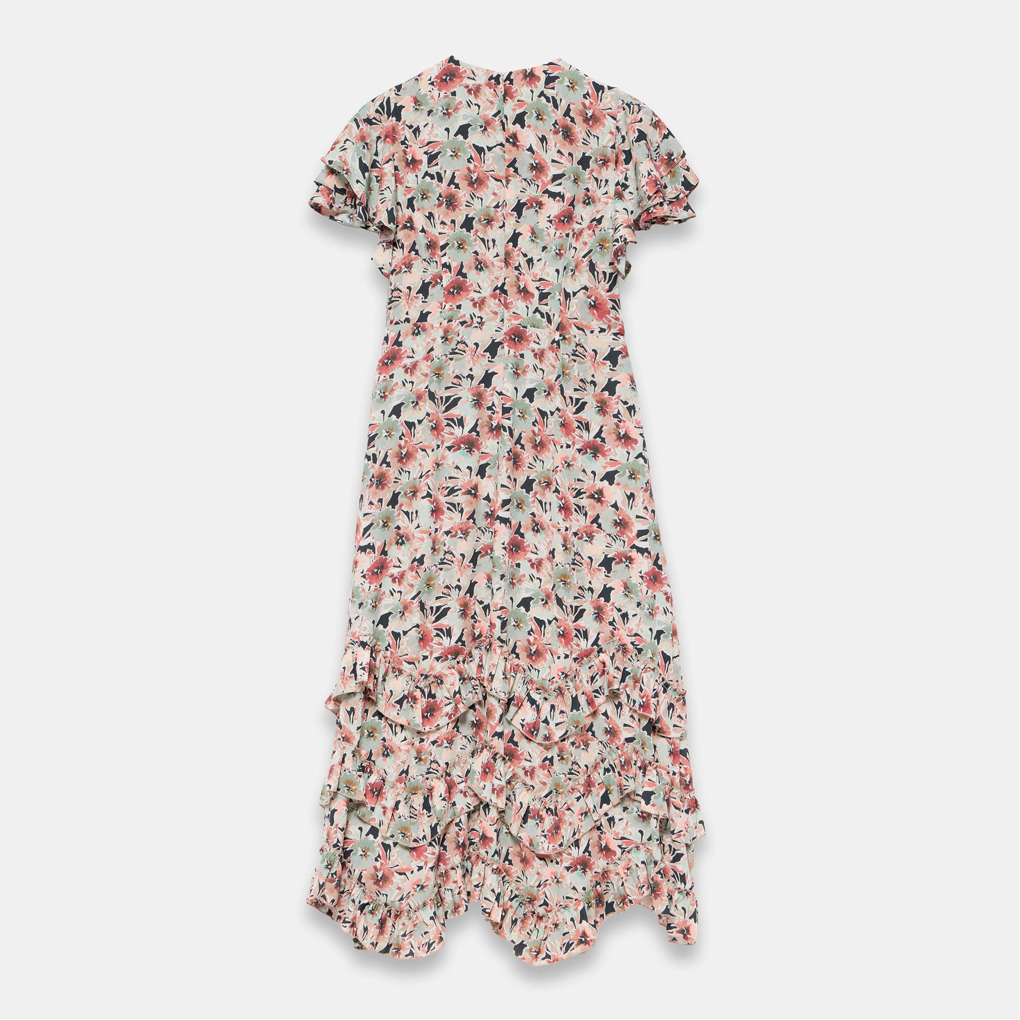 - Floral print, maxi silhouette, gathered crew neckline, short ruffle sleeves, layered ruffle hemline, zip back fastening, logo detail