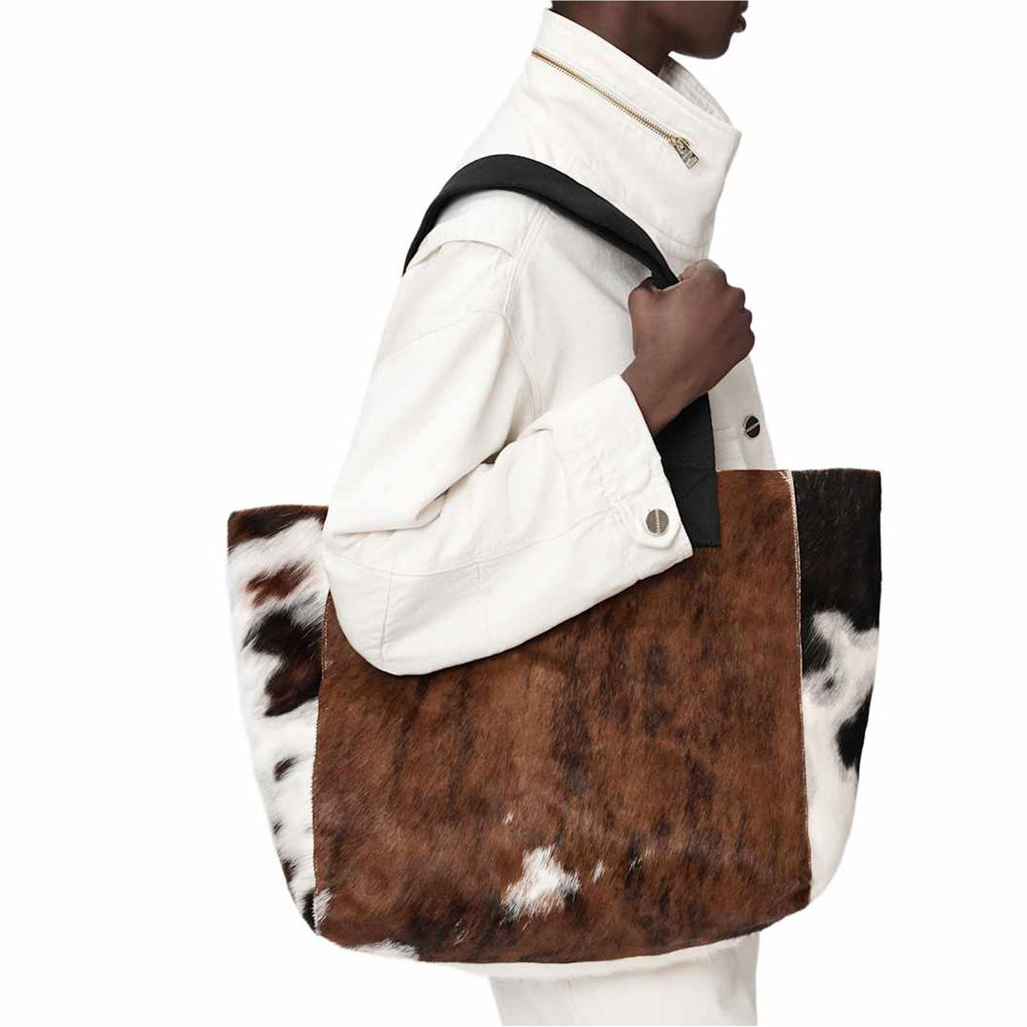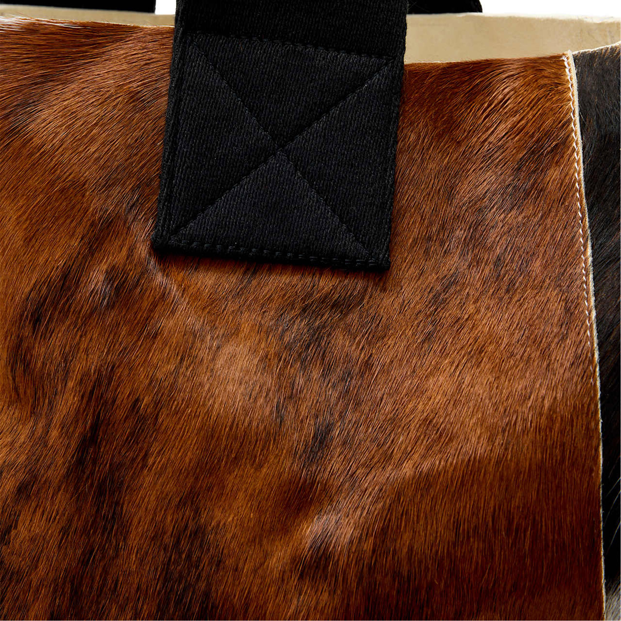 - Leather, tote style, webbing handles, cow leather finish, pony hair texture