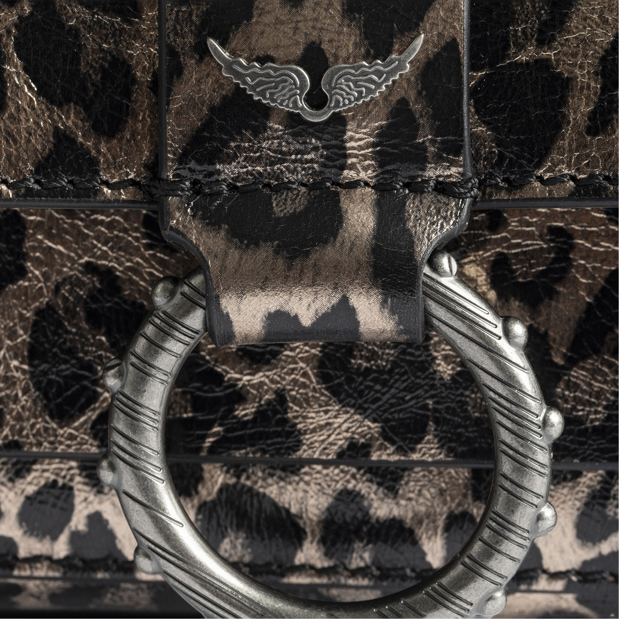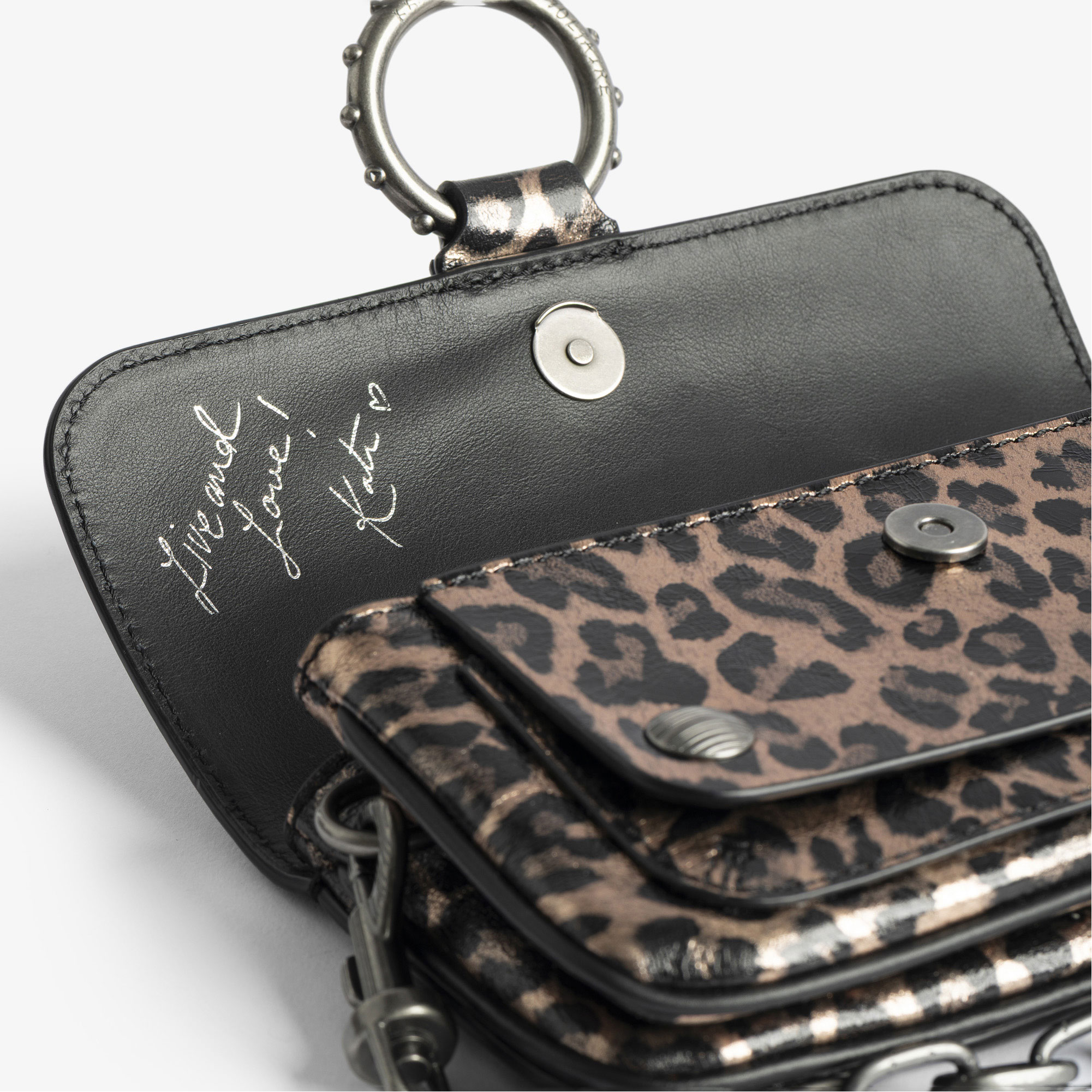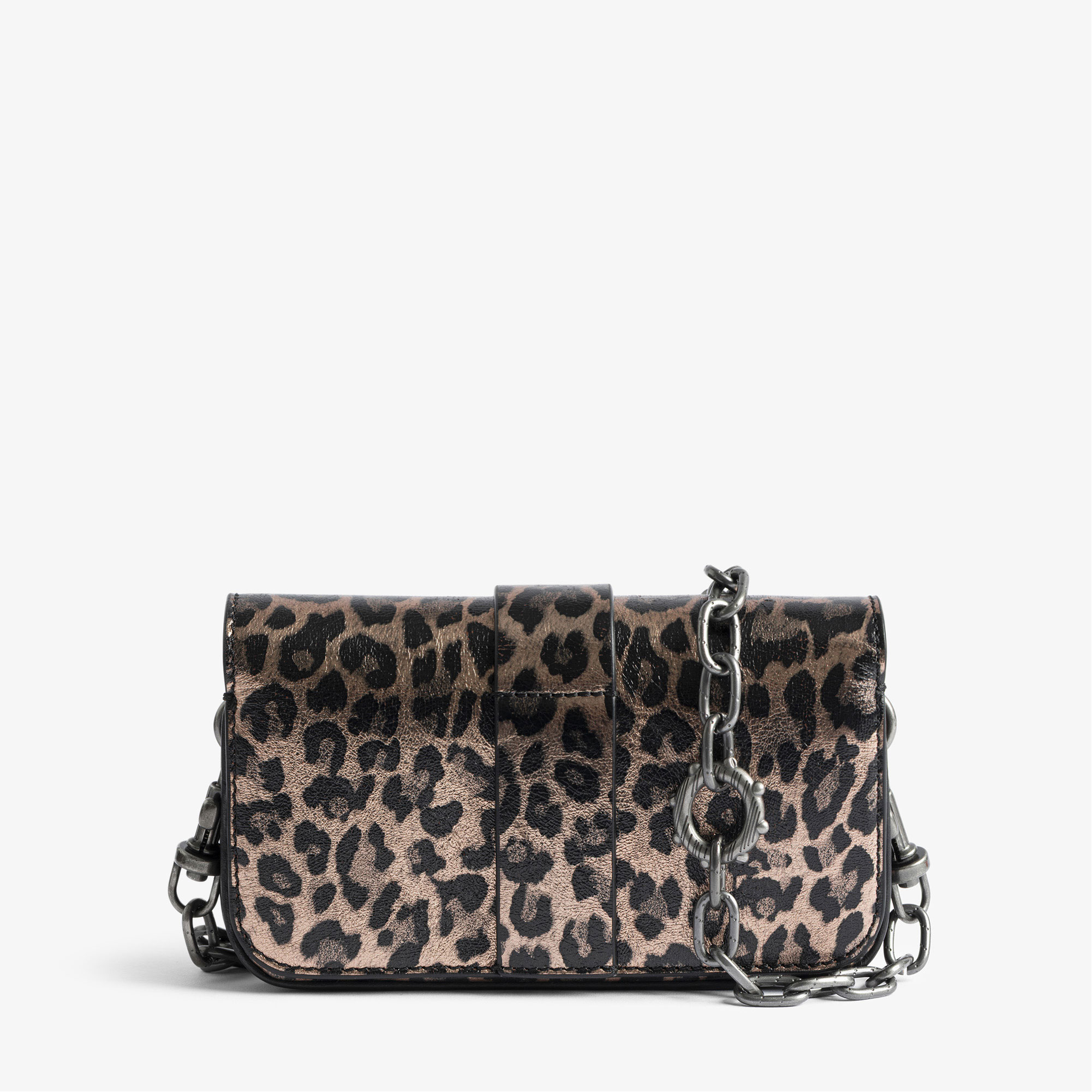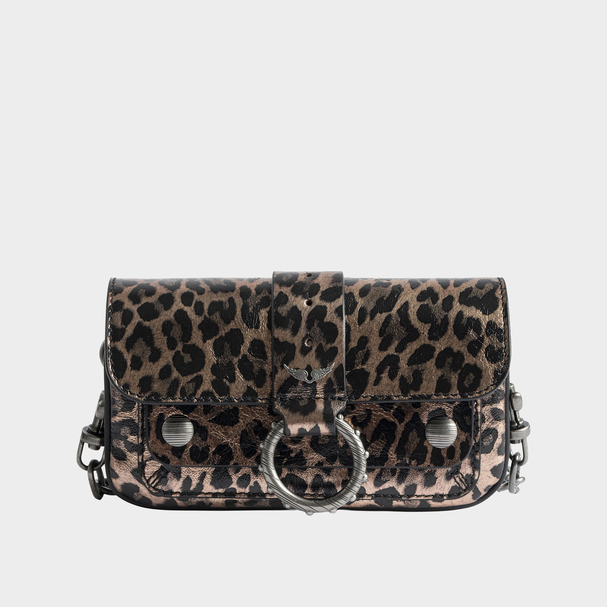 - Mini size, metallic leather leopard-effect, ring and metal chain