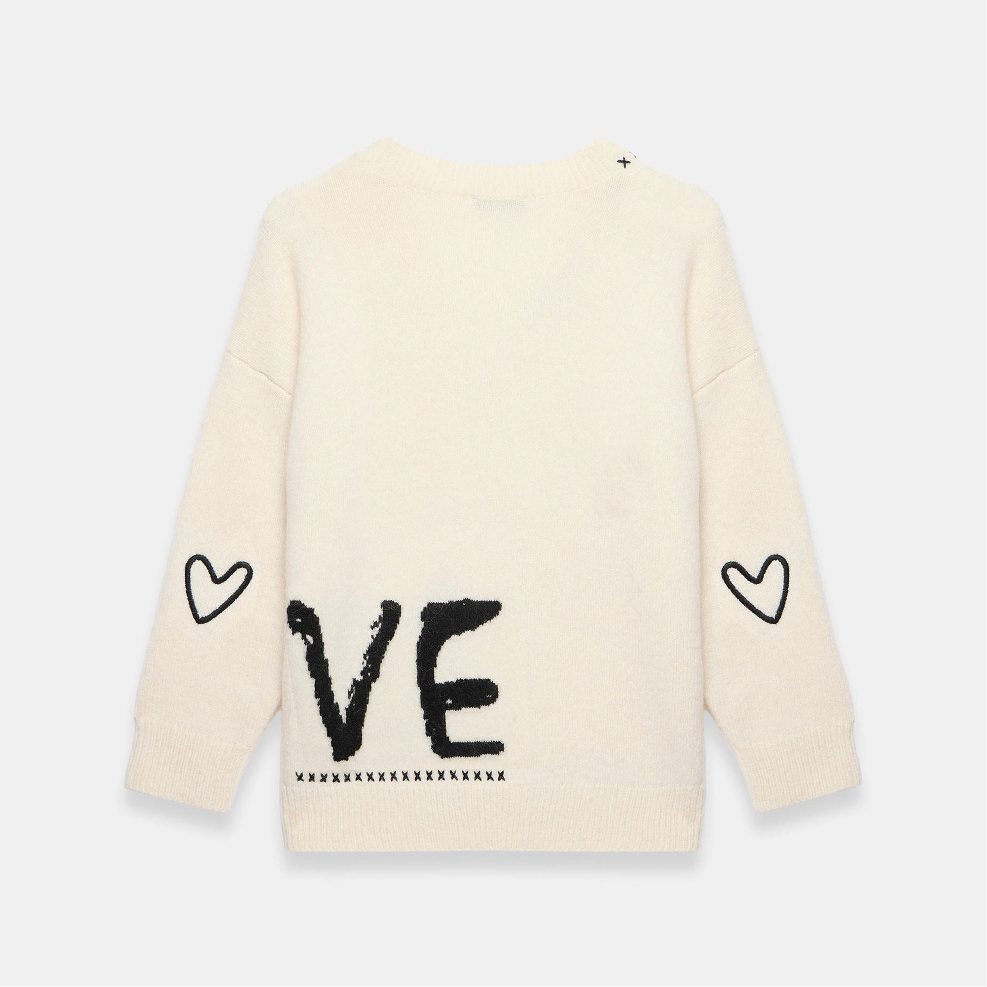 - Ribbed V-neckline, long sleeves, ribbed cuffs, heart and stitch detailing, graphic motif