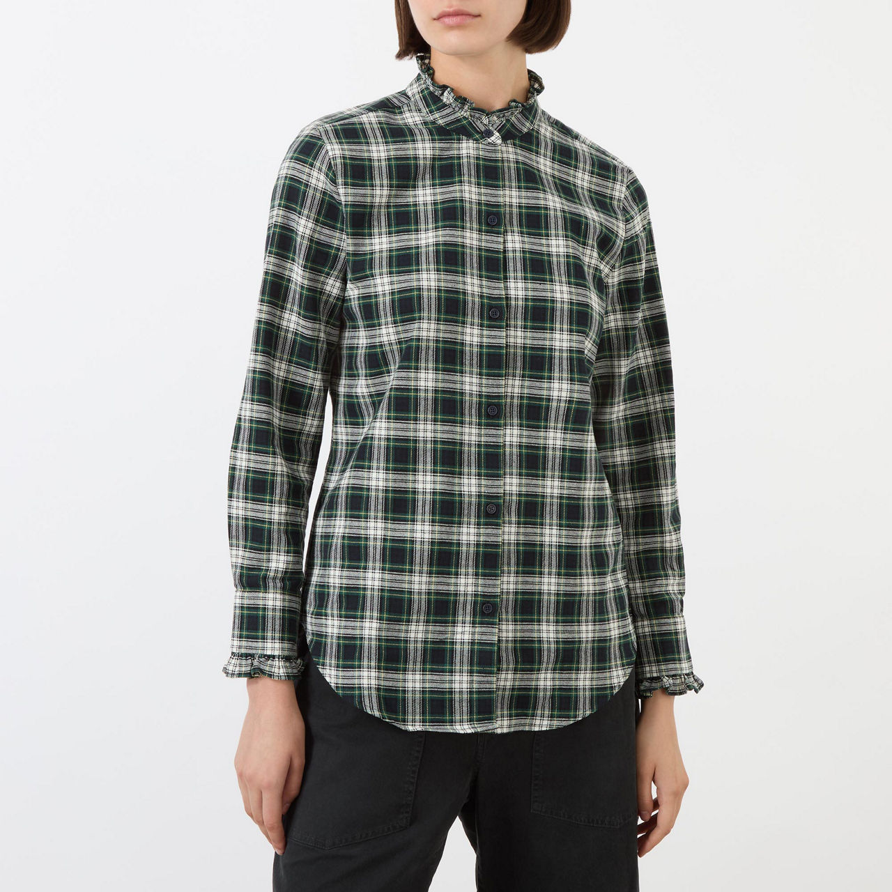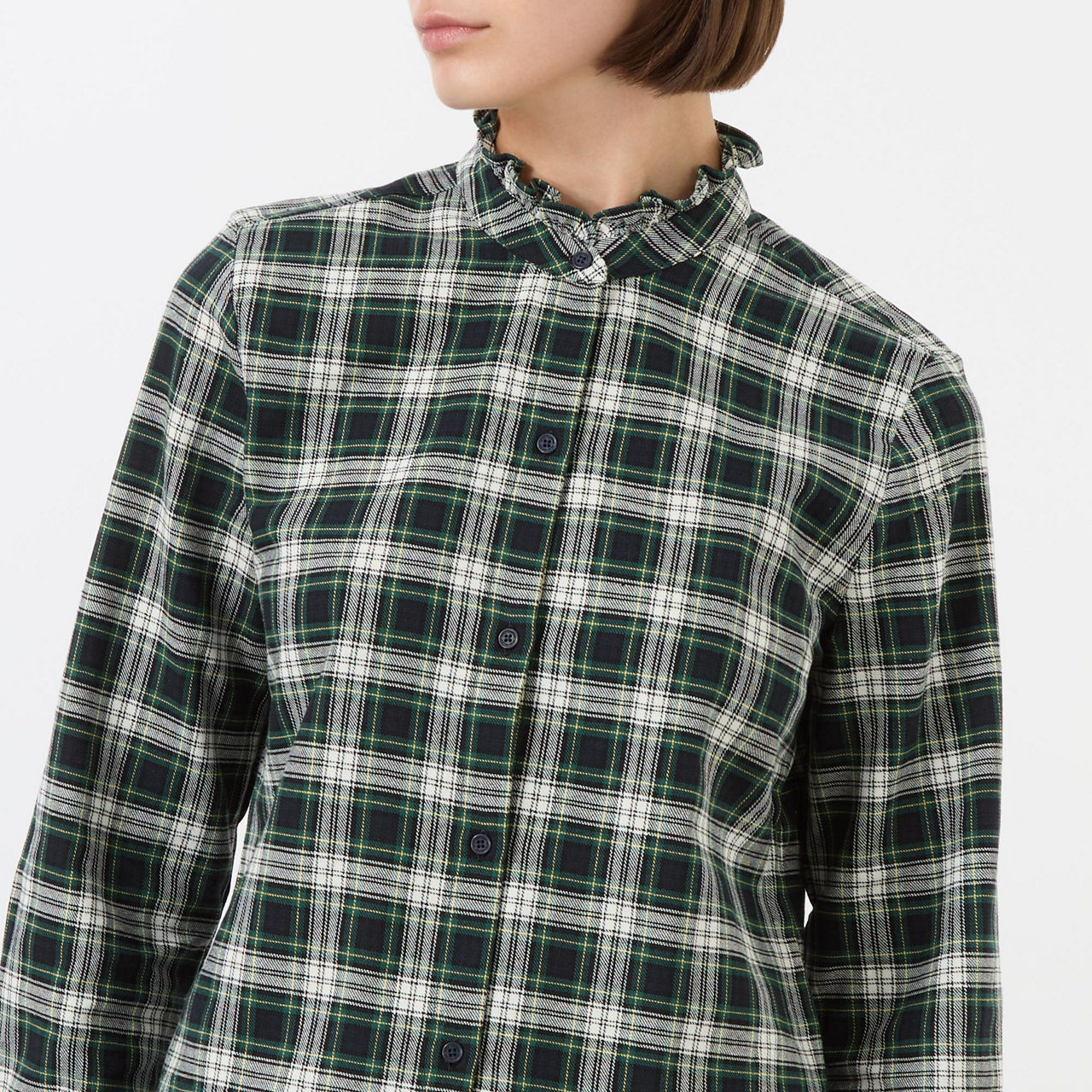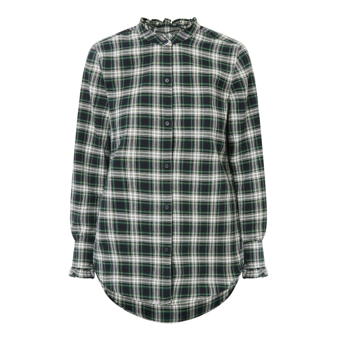 - Ruffle collar, button fastening, long sleeve, curved hemline, check pattern