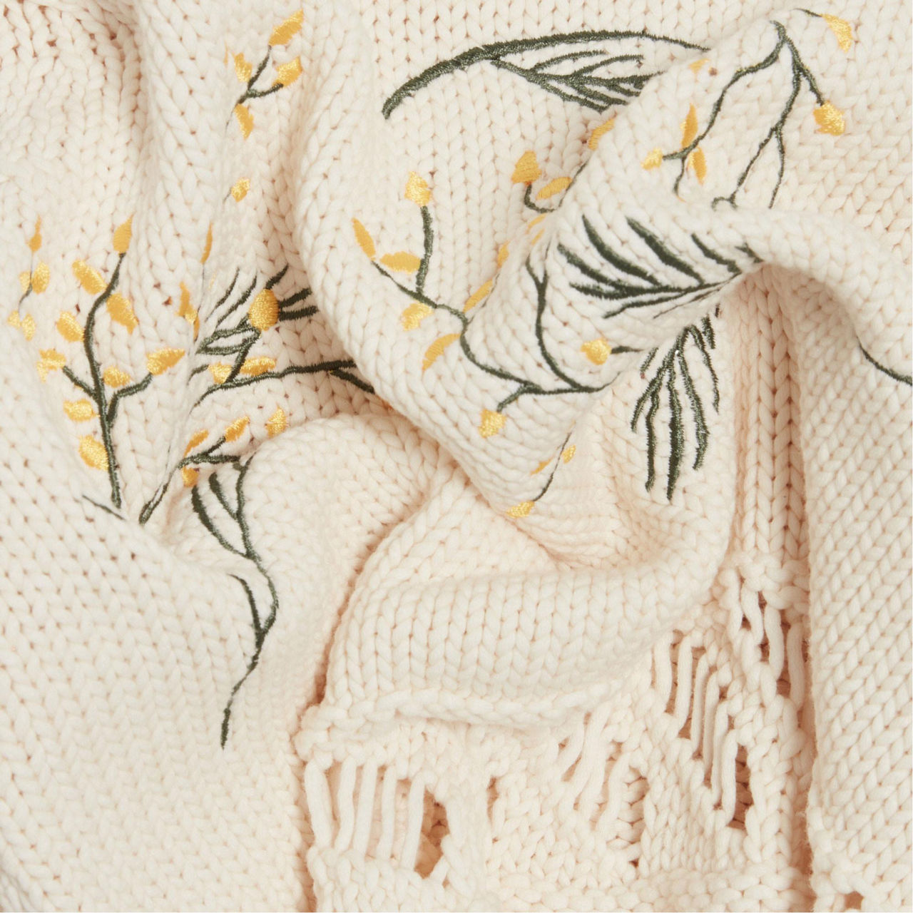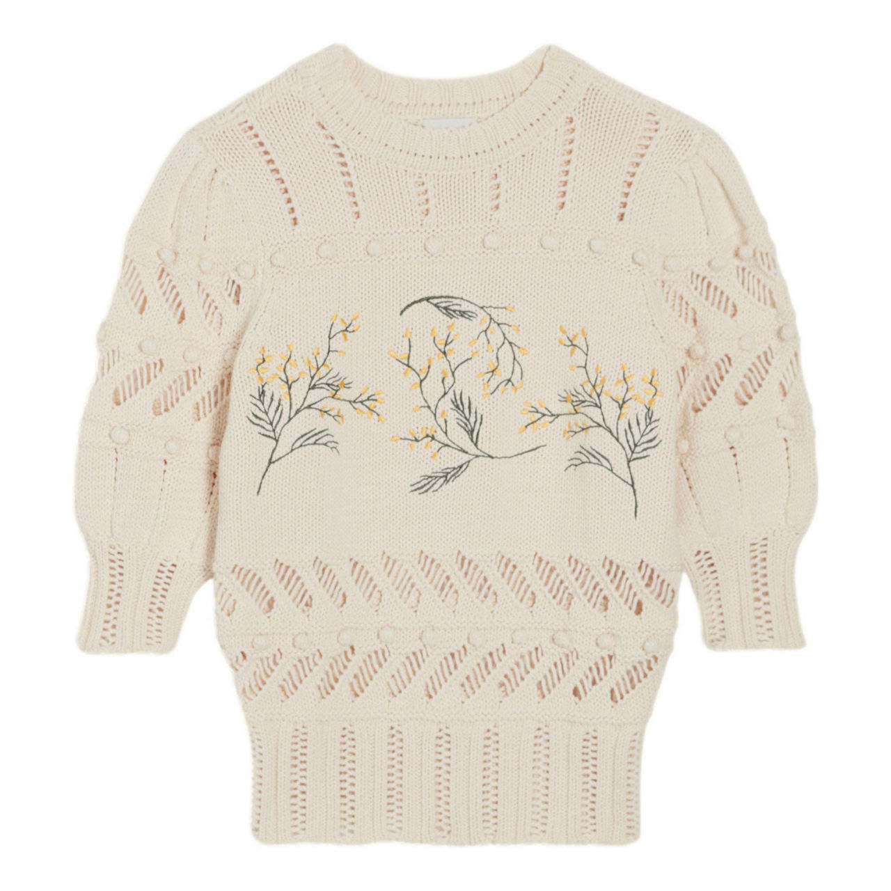 - Thick off-white openwork knit jumper, crocheted and embroidered mimosa motifs, round neckline, slightly baggy 3/4 sleeves, straight cut