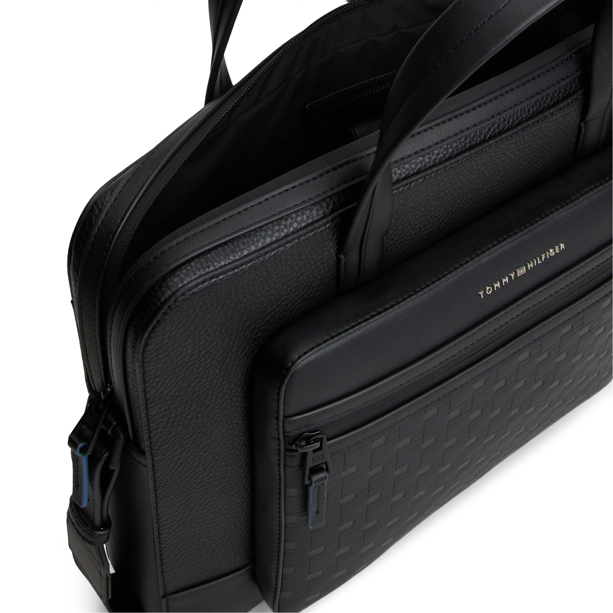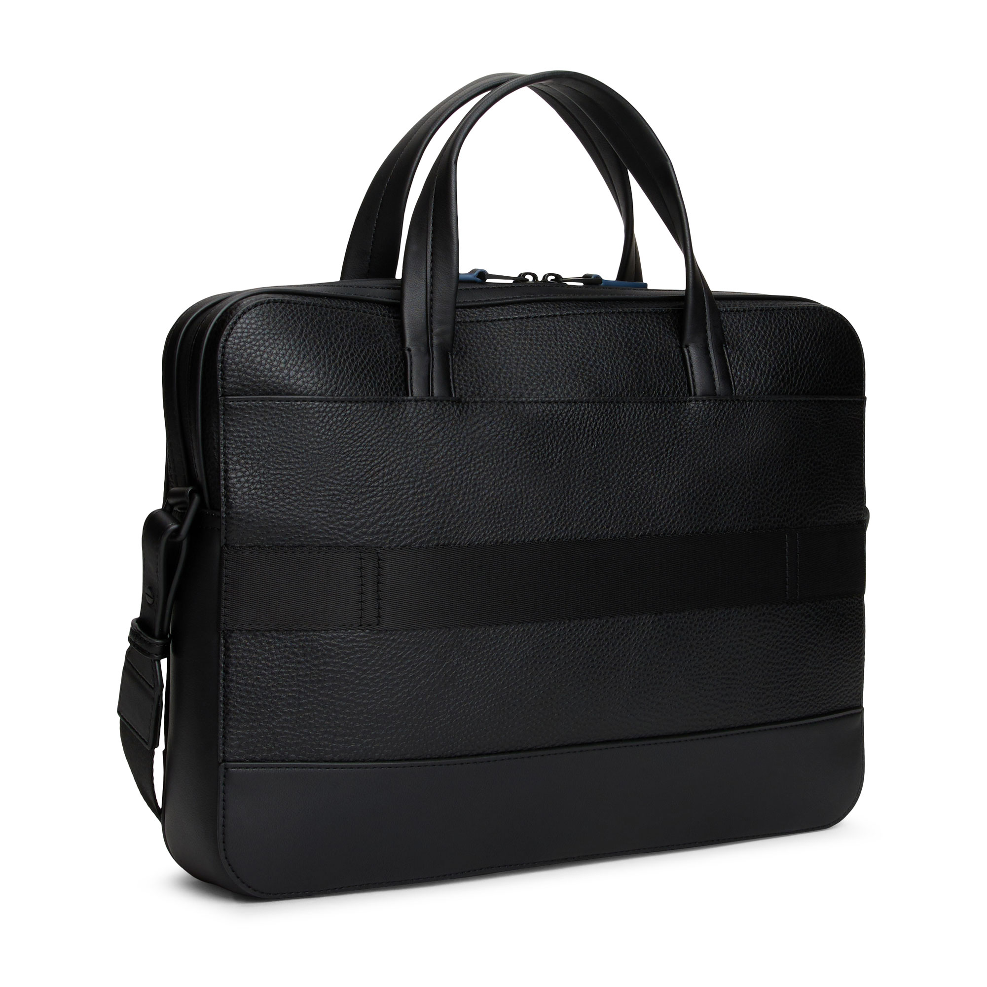 - Mixed texture panels, built-in laptop sleeve, double zip closure, two top handles, shoulder strap, trolley strap on back, one exterior zipped pocket, d-ring hook, logo detail