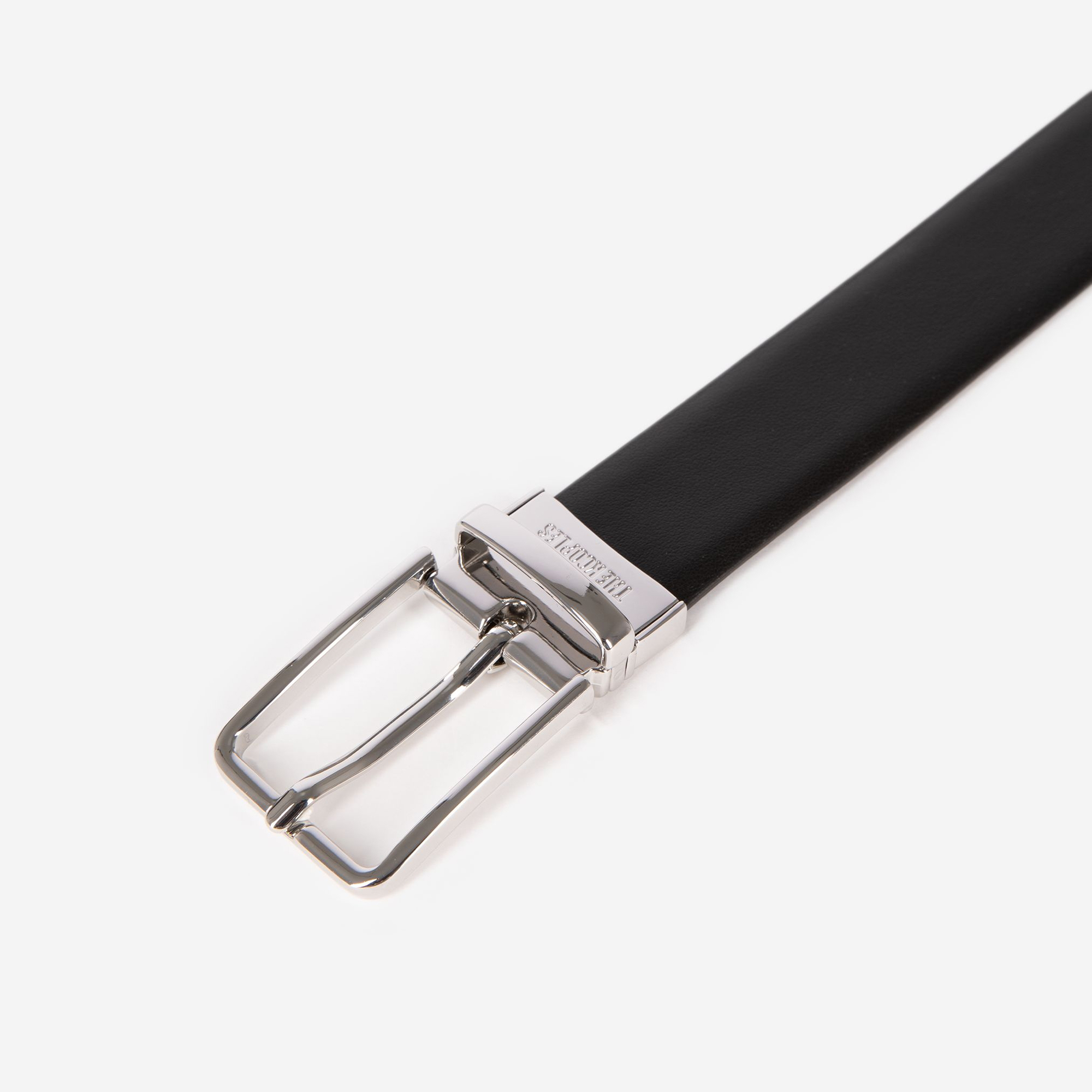 - Adjustable buckle fastening, reversible design, silver-tone hardware, smooth and grained leather finish