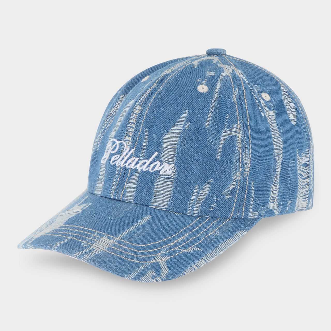 - Curved visor, six-panel design, embroidered eyelets, distressed details, front logo embroidery, contrasting top stitching, adjustable back fastening, denim finish