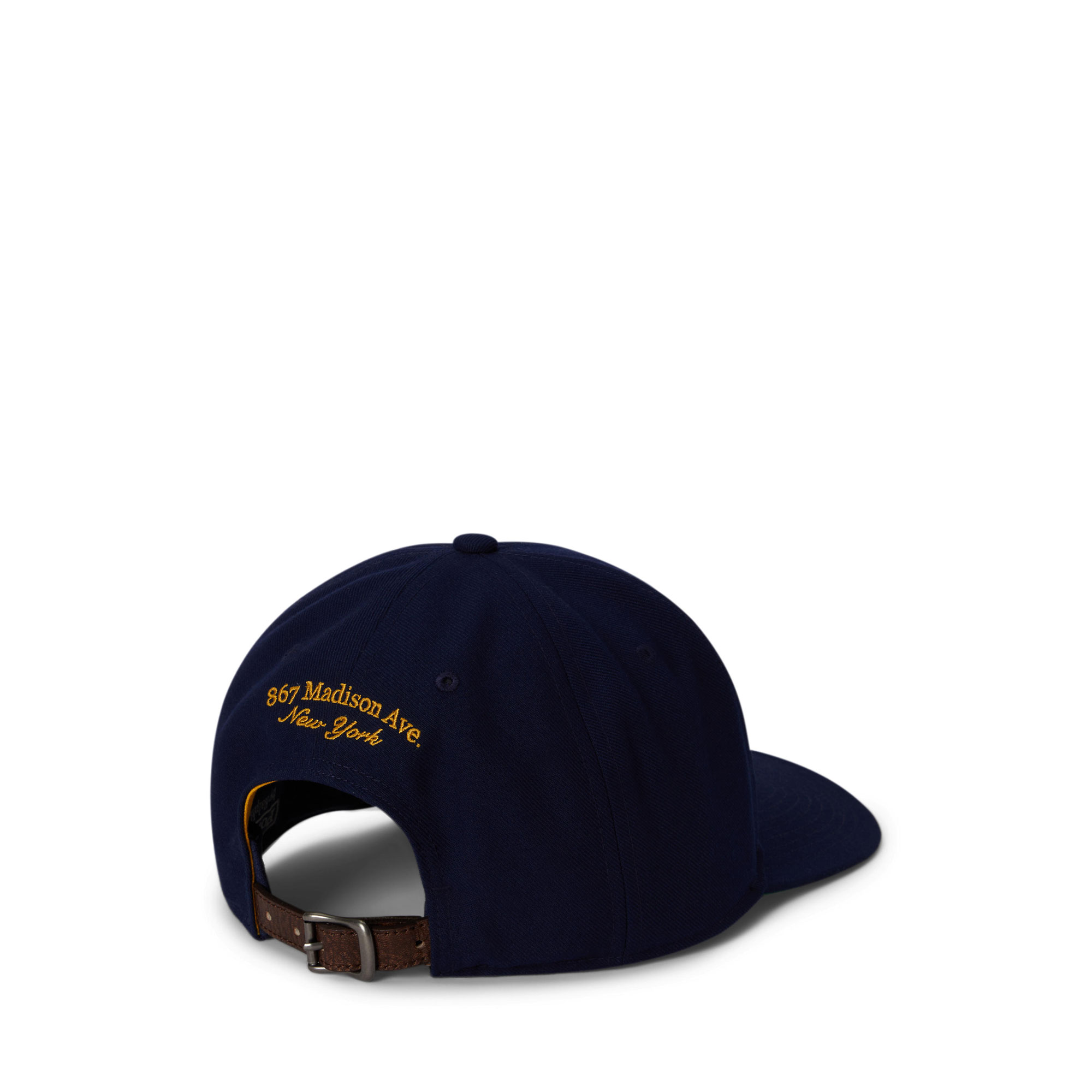 • Embroidered Polo logo crest, twill fabric, high-crown silhouette, leather strap with buckle fastening, embroidery details, seamed bill, six-panel construction, ventilating embroidered eyelets, mesh sweatband, front panel lining