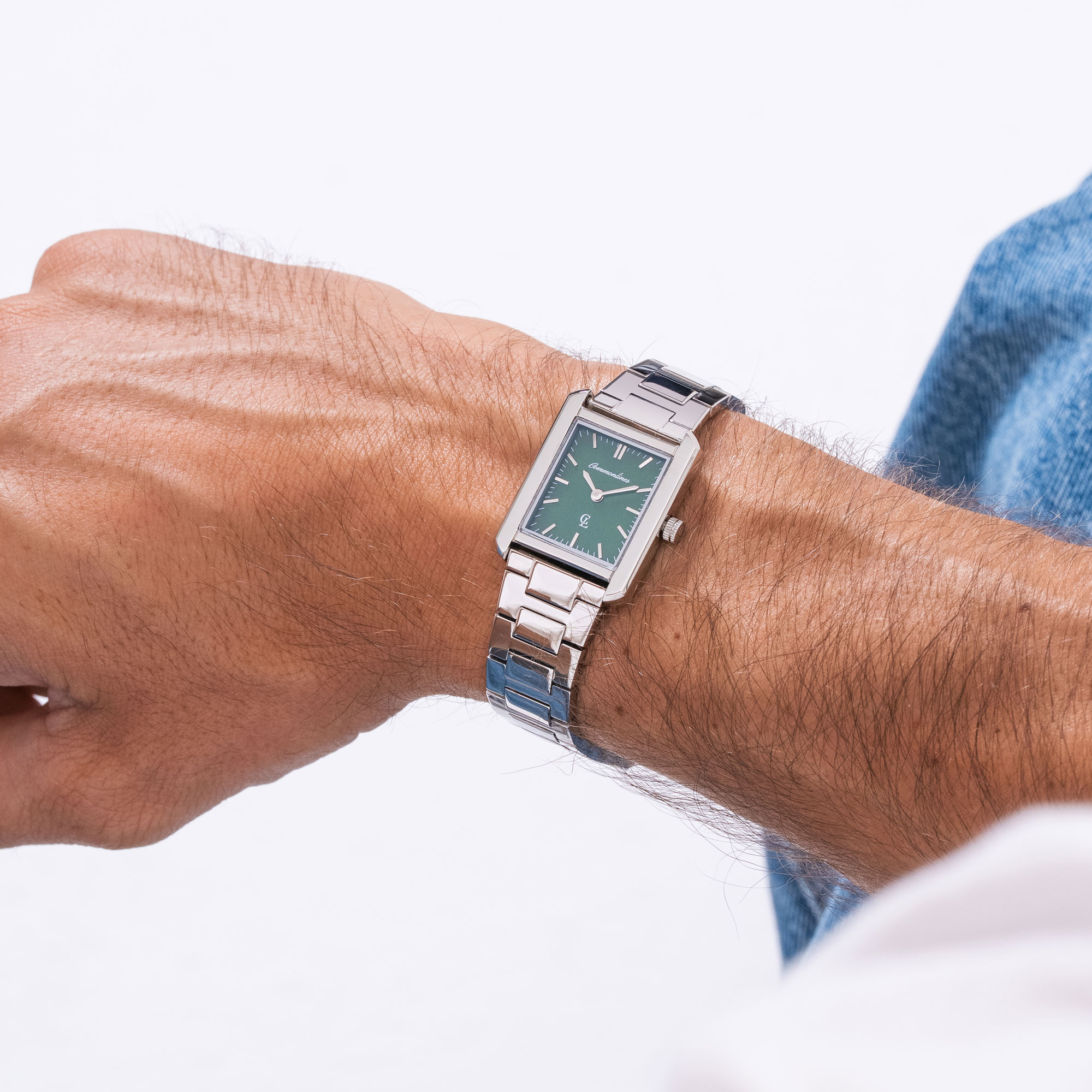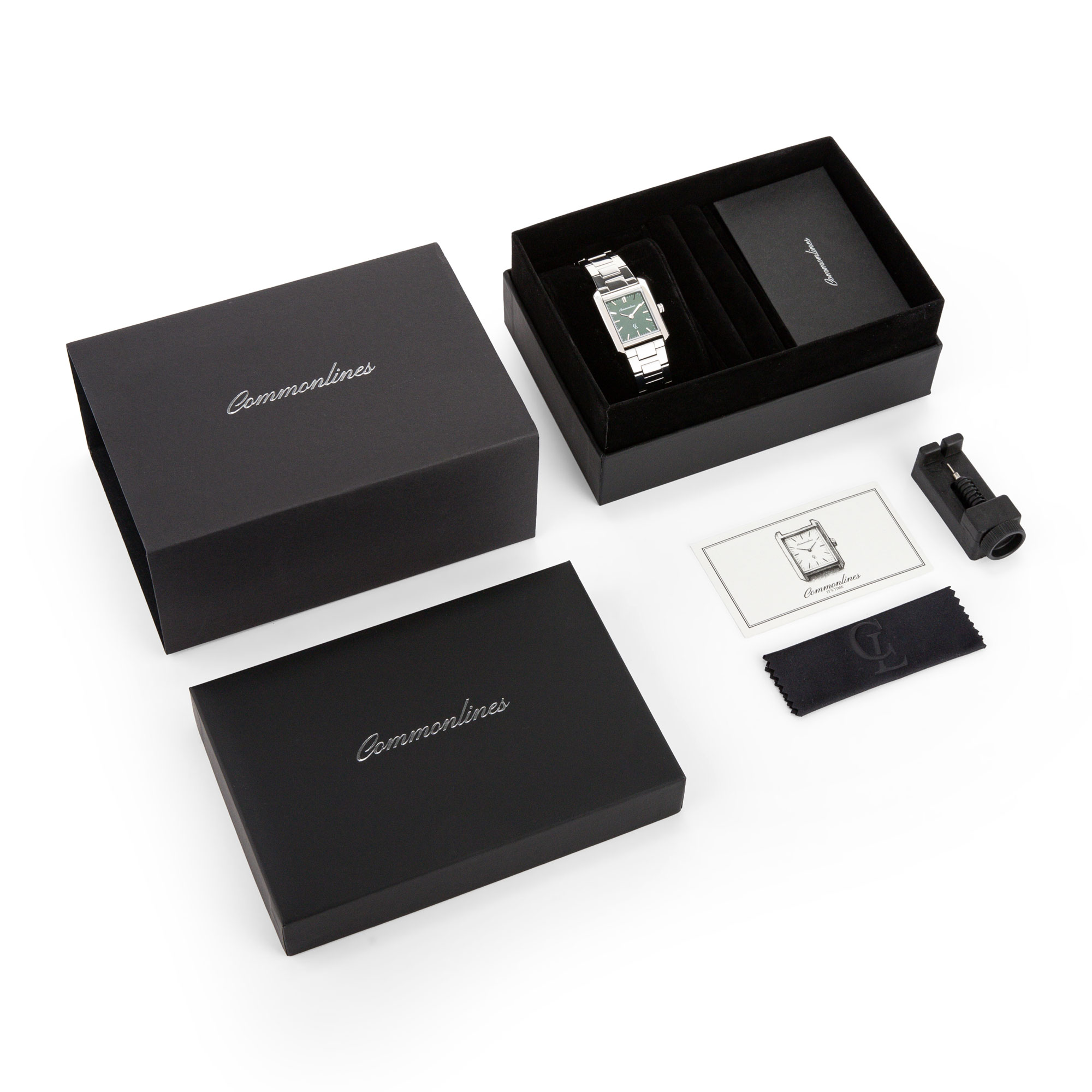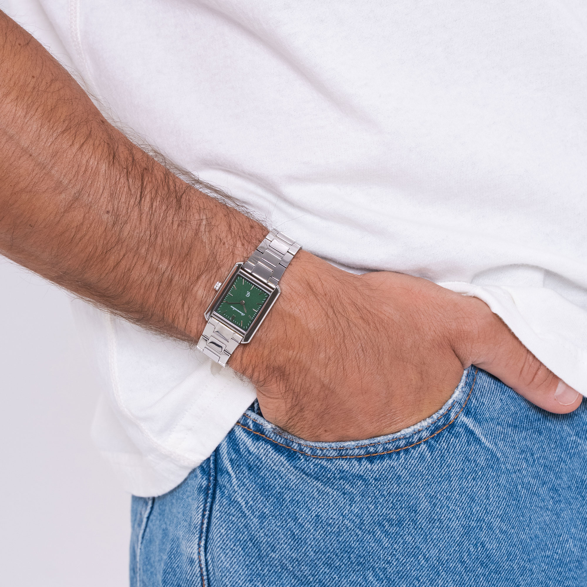 - Sterling silver construction, scratch-resistant sapphire crystal, anti-reflective coating, water-ready, removable links, Japanese Quartz movement, two-hand, battery powered, vintage-inspired rectangular silhouette, forest green dial, branding details, branded watch box, watch polish cloth, adjustment tool
