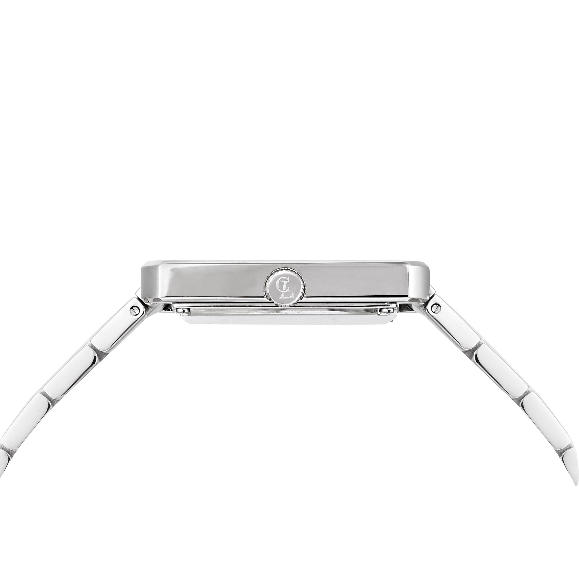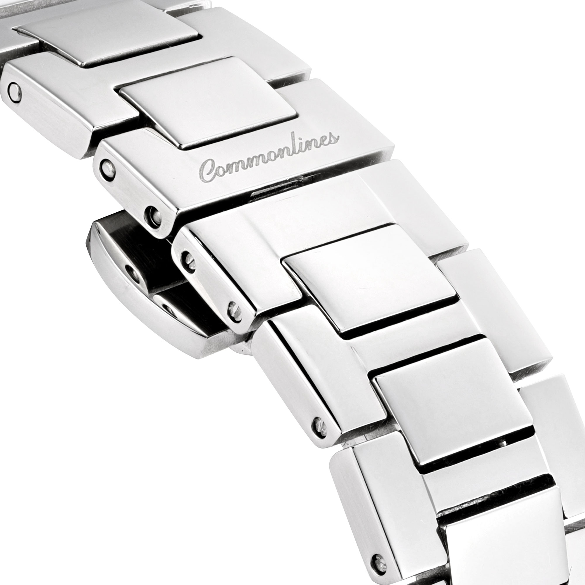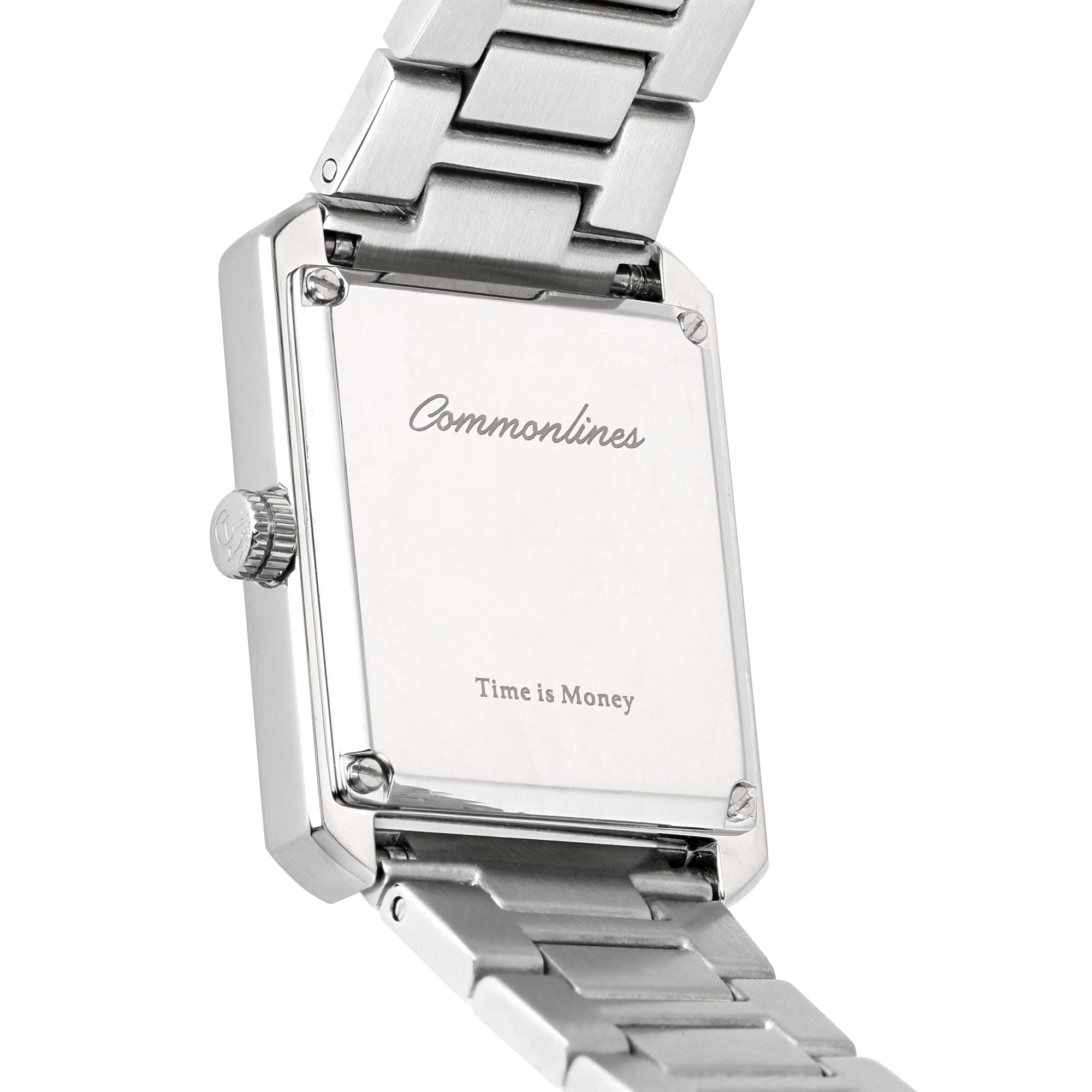 - Sterling silver construction, scratch-resistant sapphire crystal, anti-reflective coating, water-ready, removable links, Japanese Quartz movement, two-hand, battery powered, vintage-inspired rectangular silhouette, forest green dial, branding details, branded watch box, watch polish cloth, adjustment tool