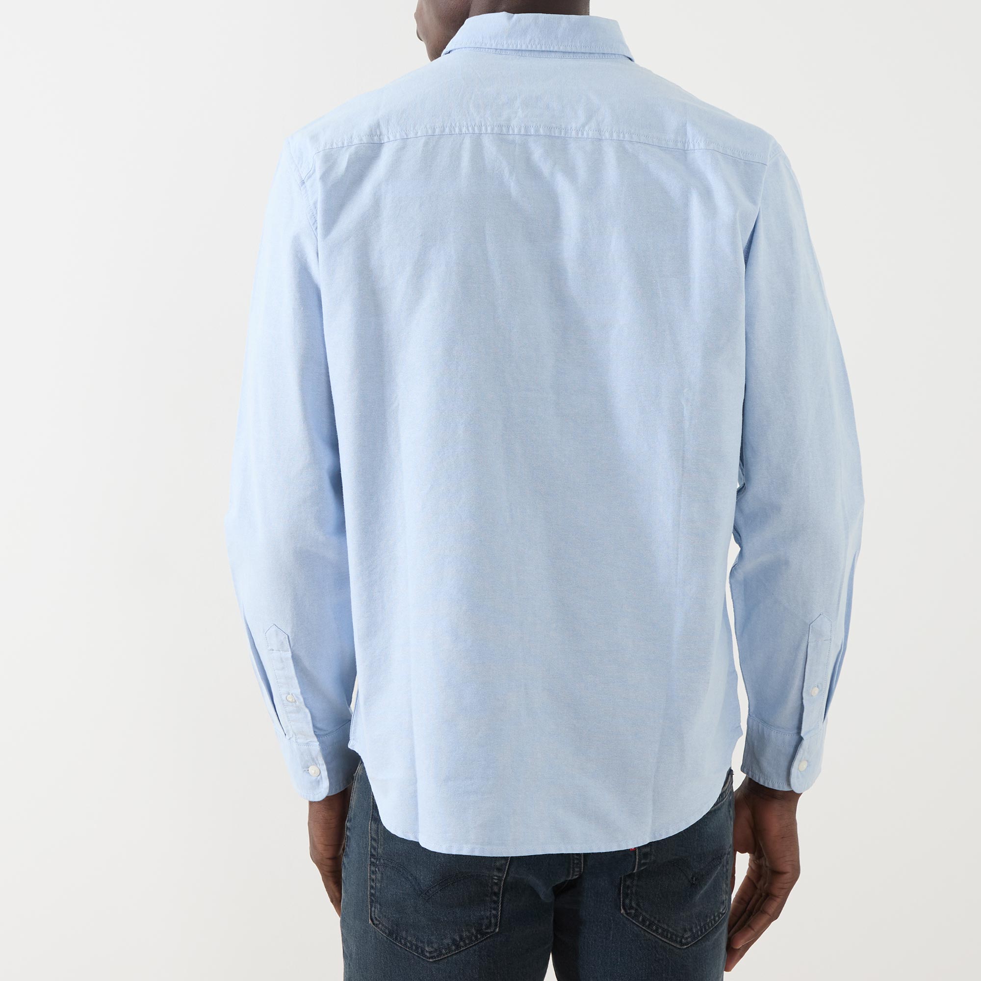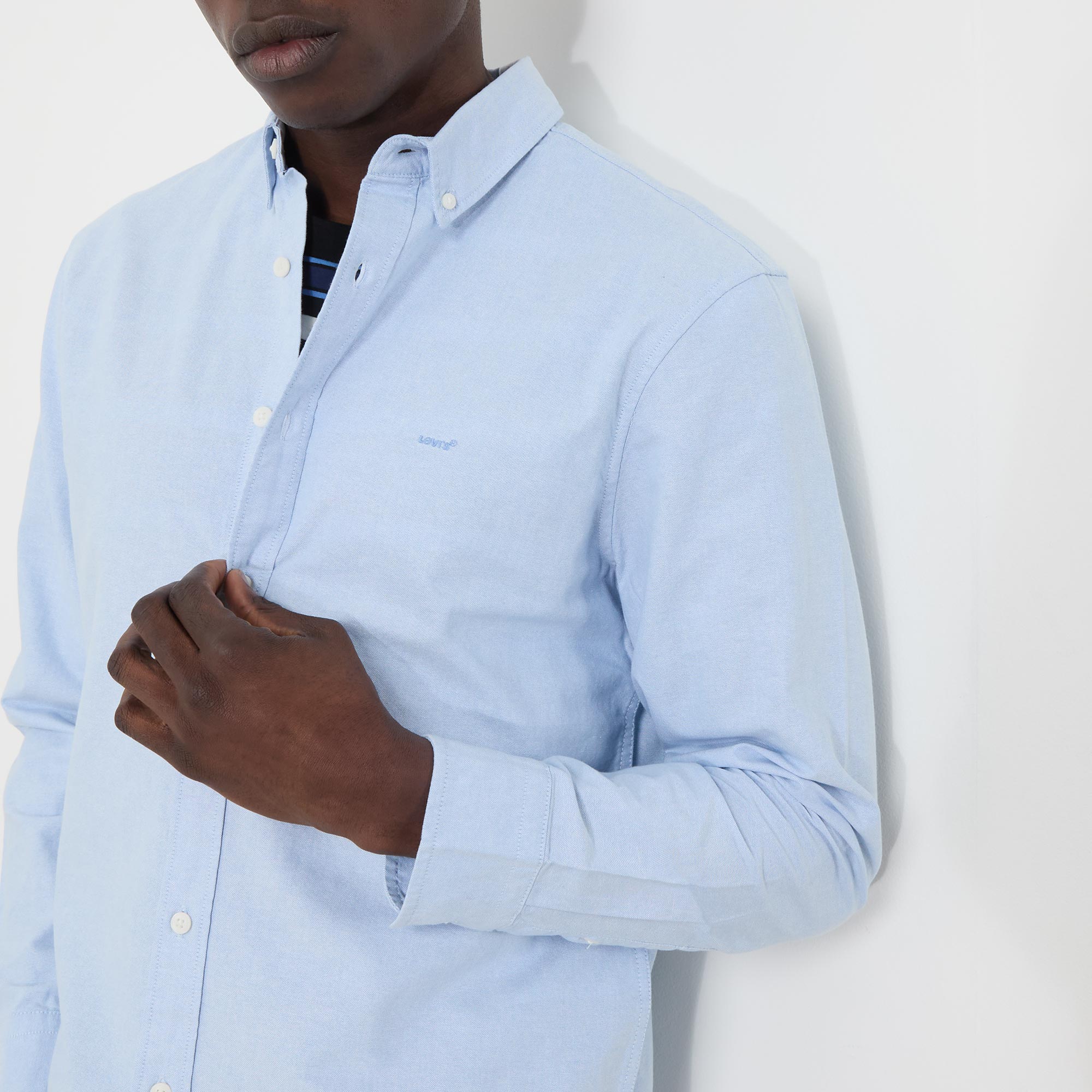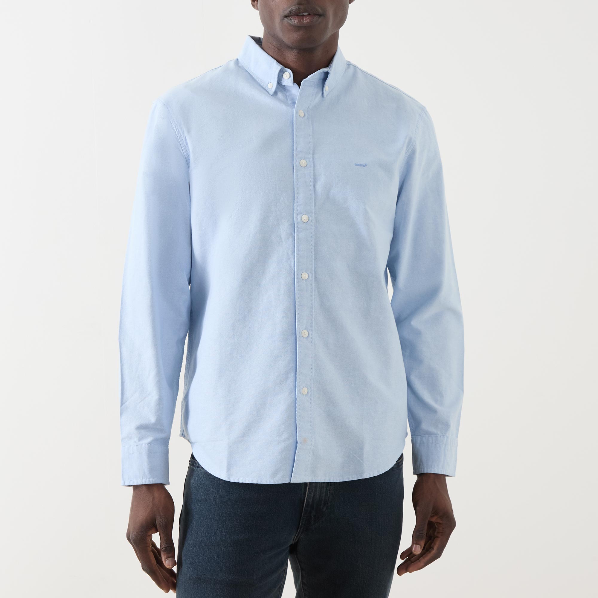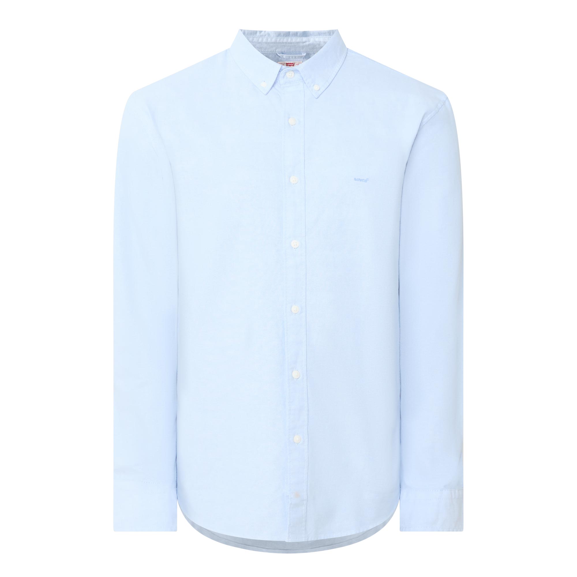 • Button-down collar, long sleeves, front button placket, logo embroidery, tonal stitching, single-button cuffs, curved hemline, smooth fabric