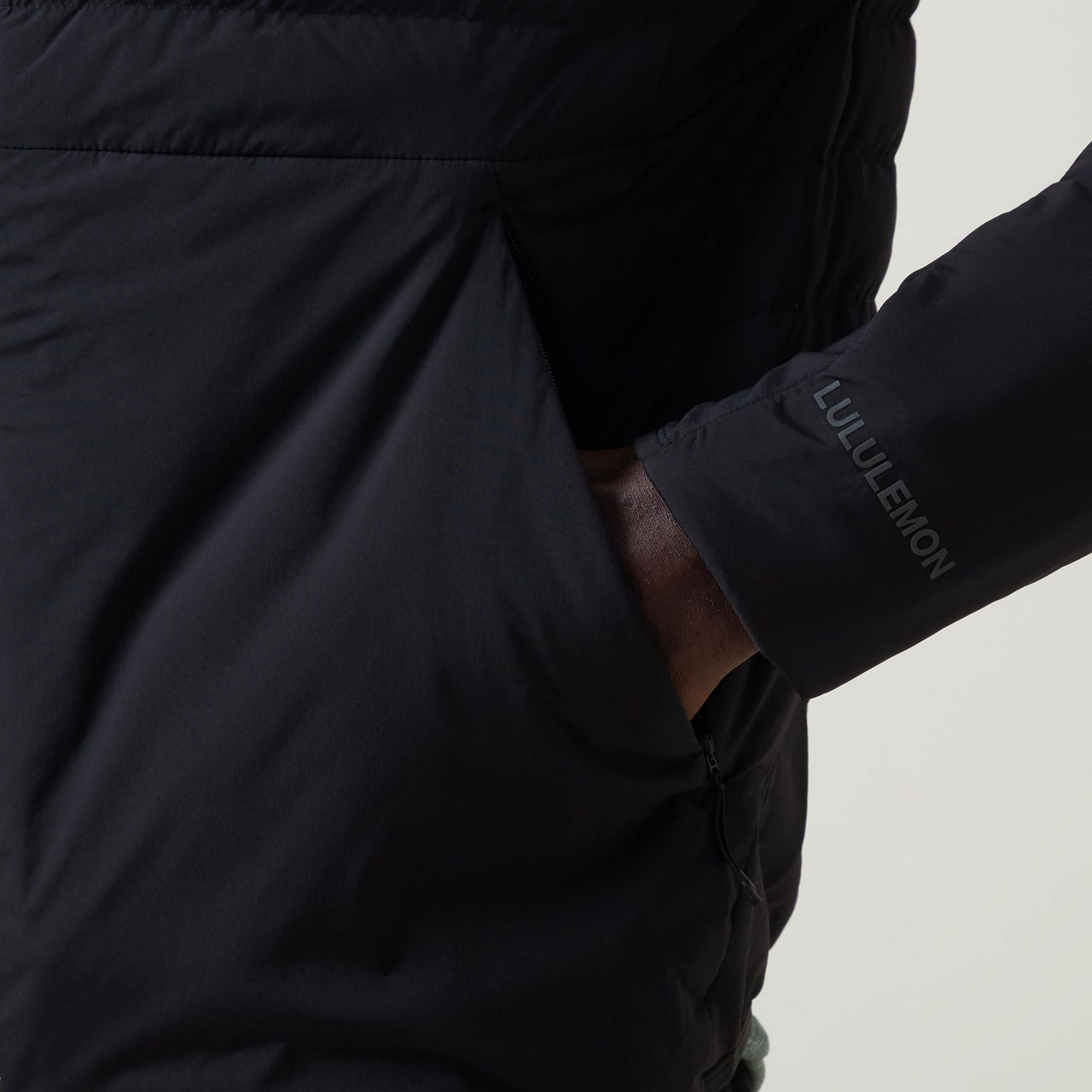 - Composition and Care: Knuckle side pocket: 100% polyester. Fabric 2: 82% nylon, 18% Lycra® elastane. Trim filling: 100% polyester. Mesh: 89% nylon, 11% elastane. Pocket lining: 100% recycled polyester. Sleeve lining: 90% nylon, 10% elastane. Filling: 85% Grey goose down, 15% grey goose Feathers. Lining: 100% recycled nylon. Body: 90% nylon, 10% elastane. Machine wash.
