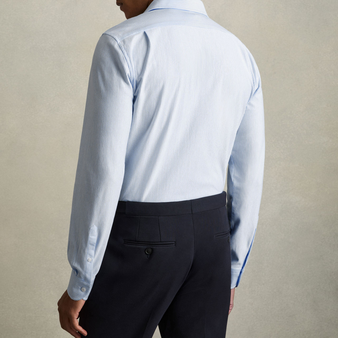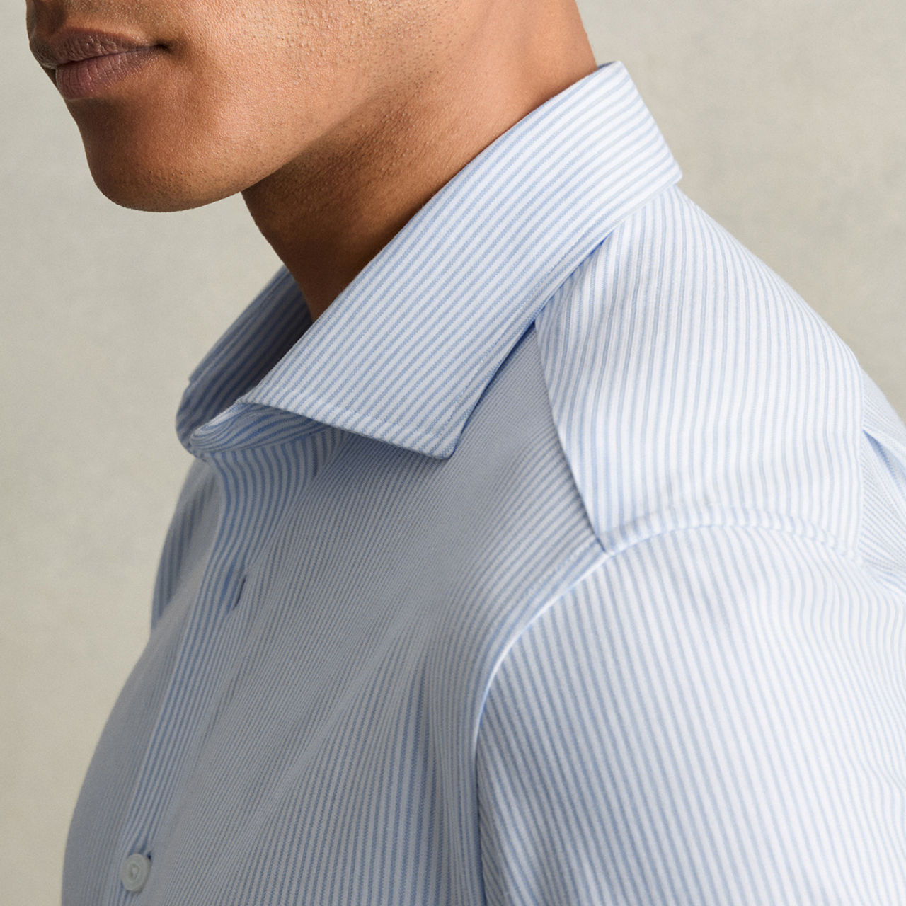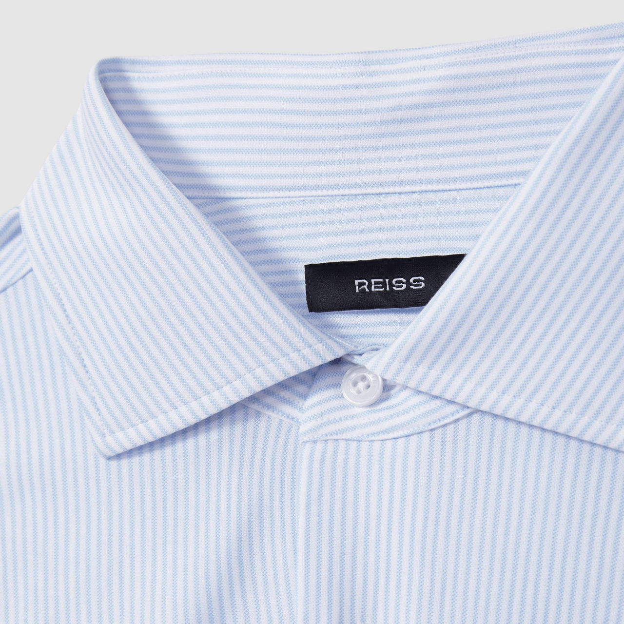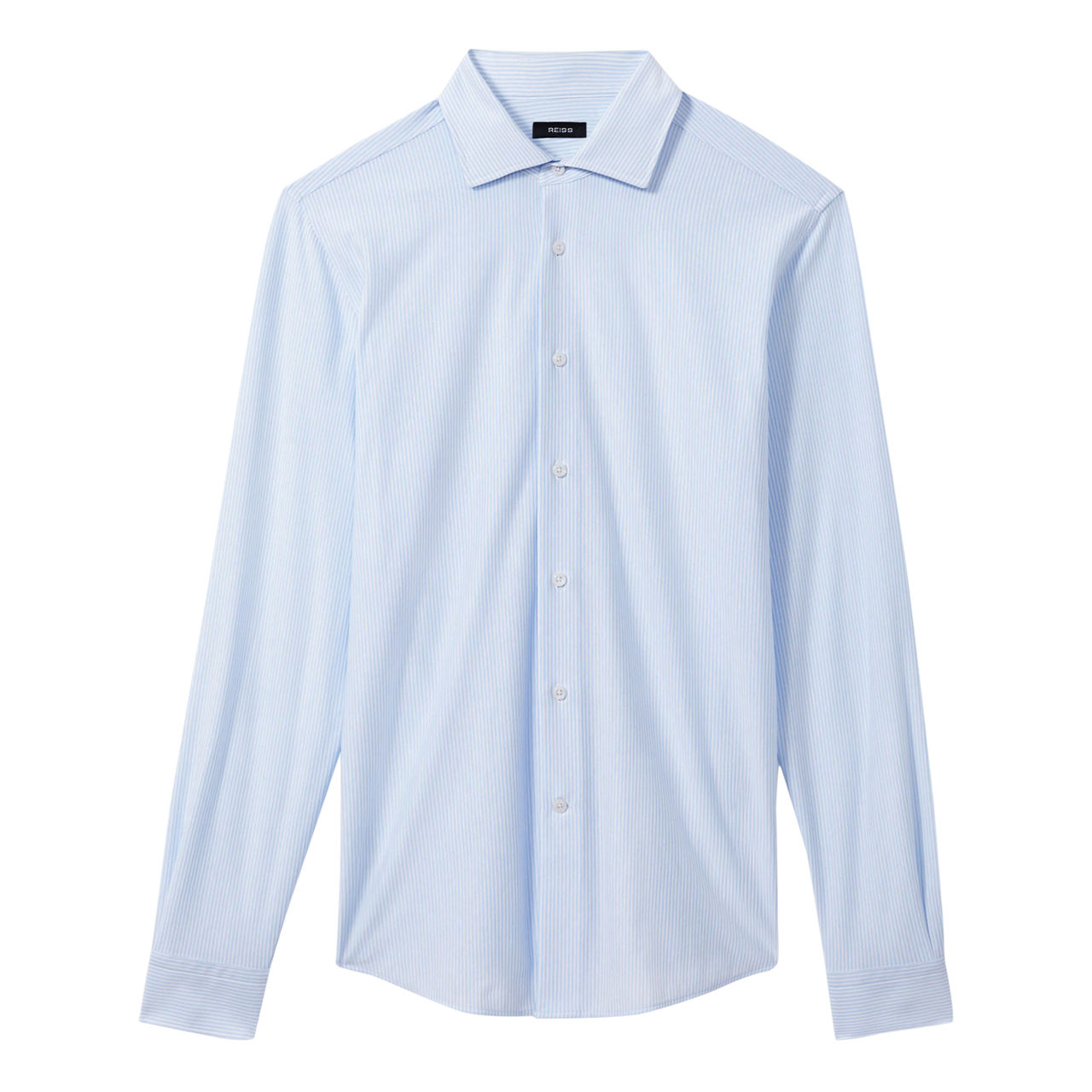 - Cutaway collar, long sleeves, buttoned cuffs, front button fastening, curved hem, striped pattern, slight sheen