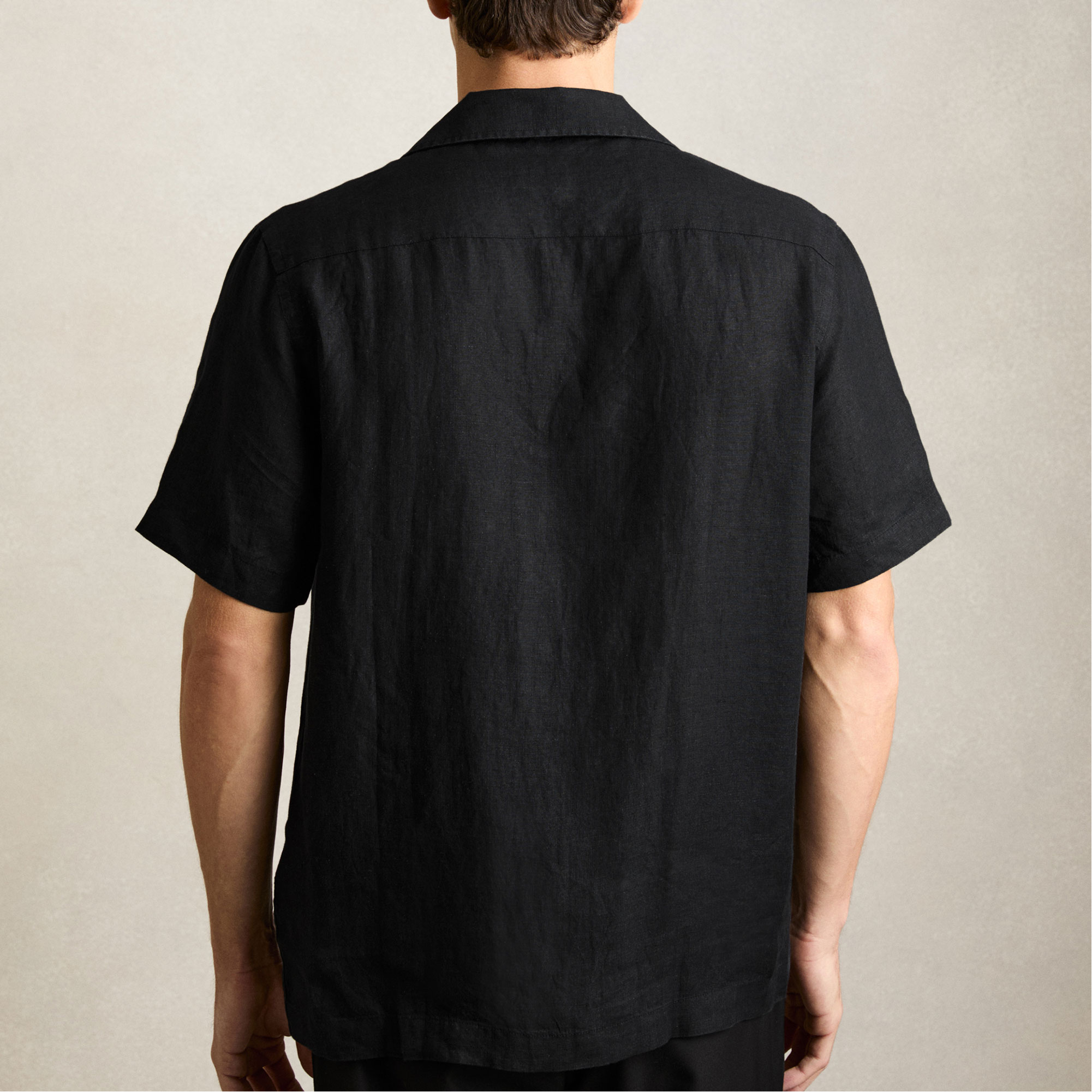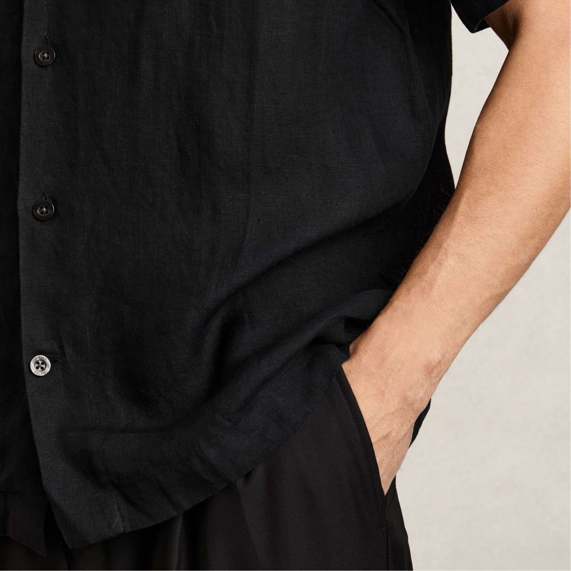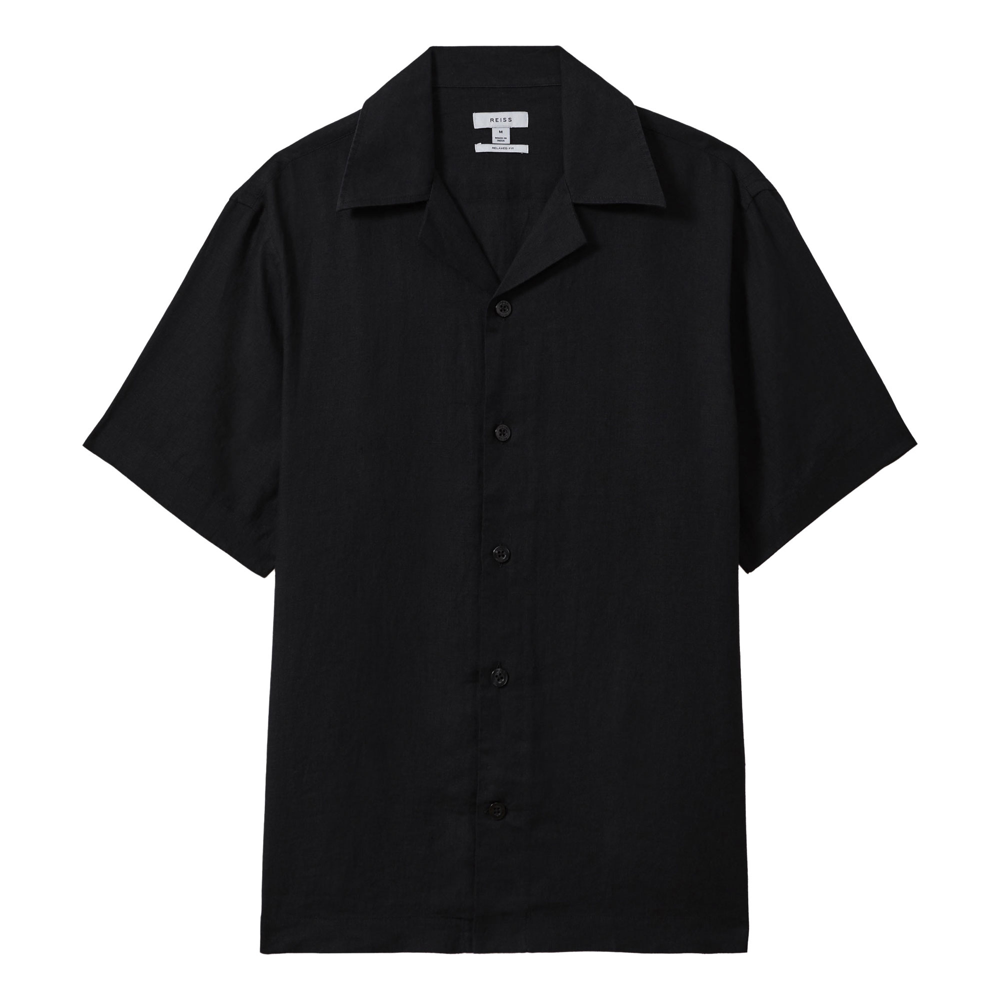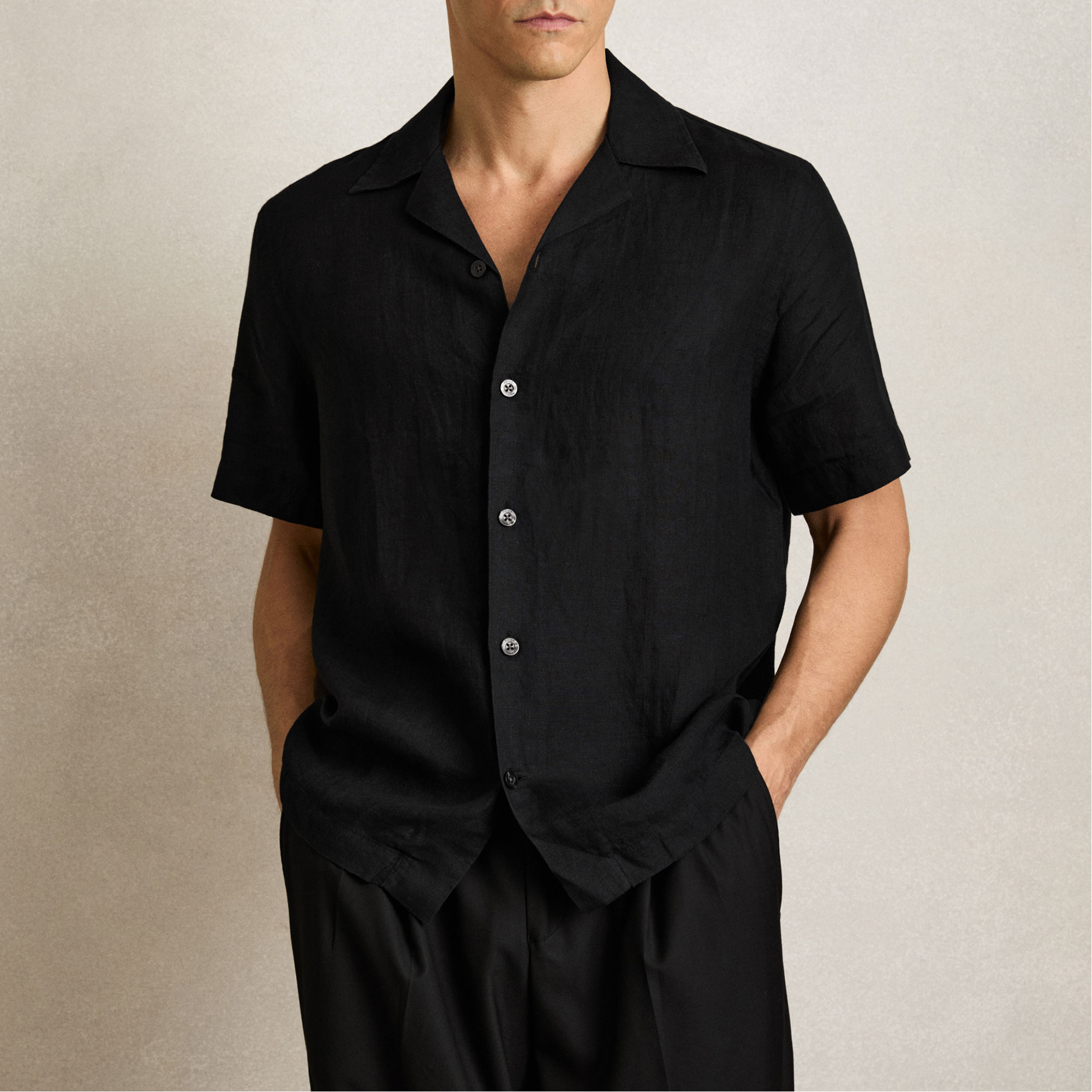 - Breathable linen fabric, Cuban collar, French button placket, short sleeves