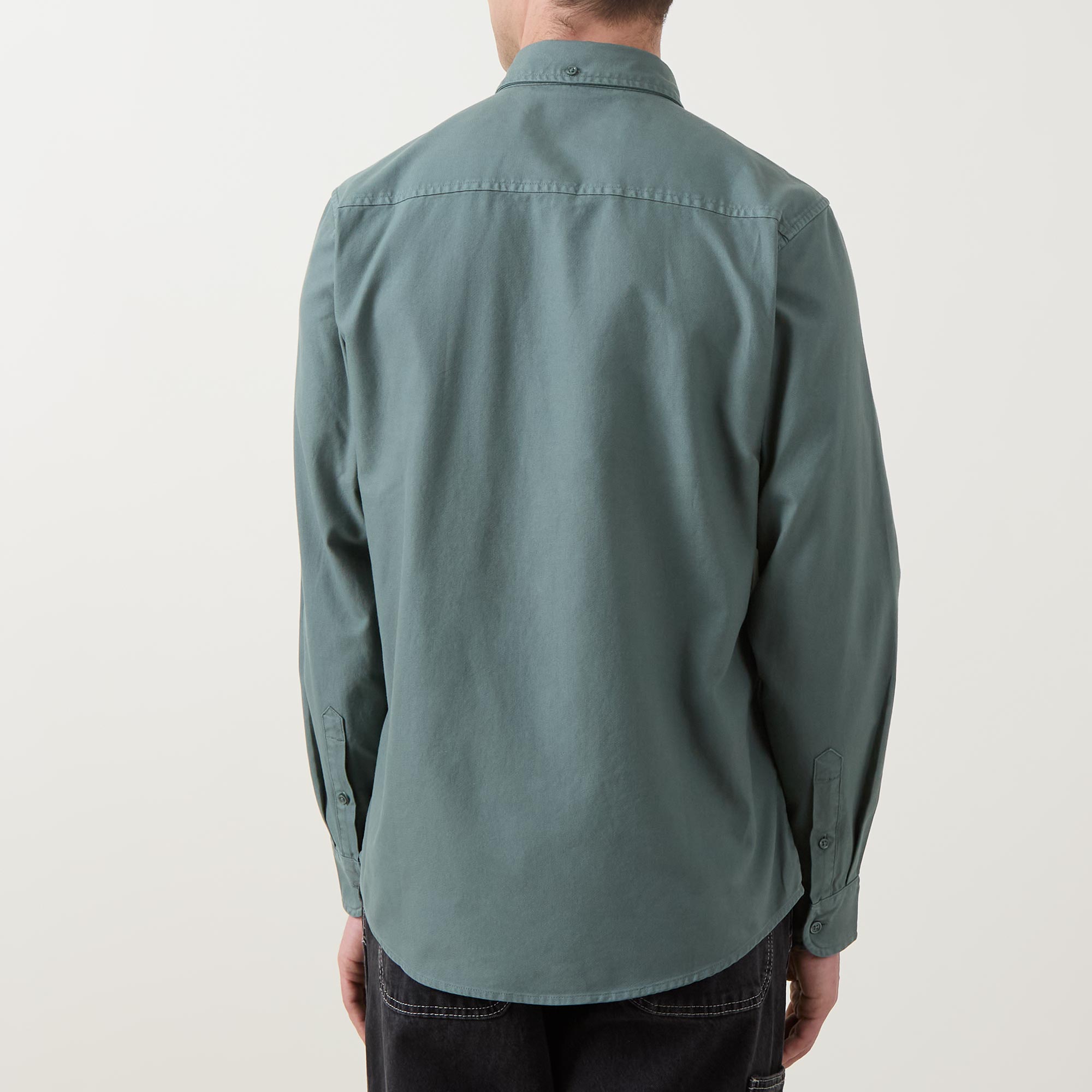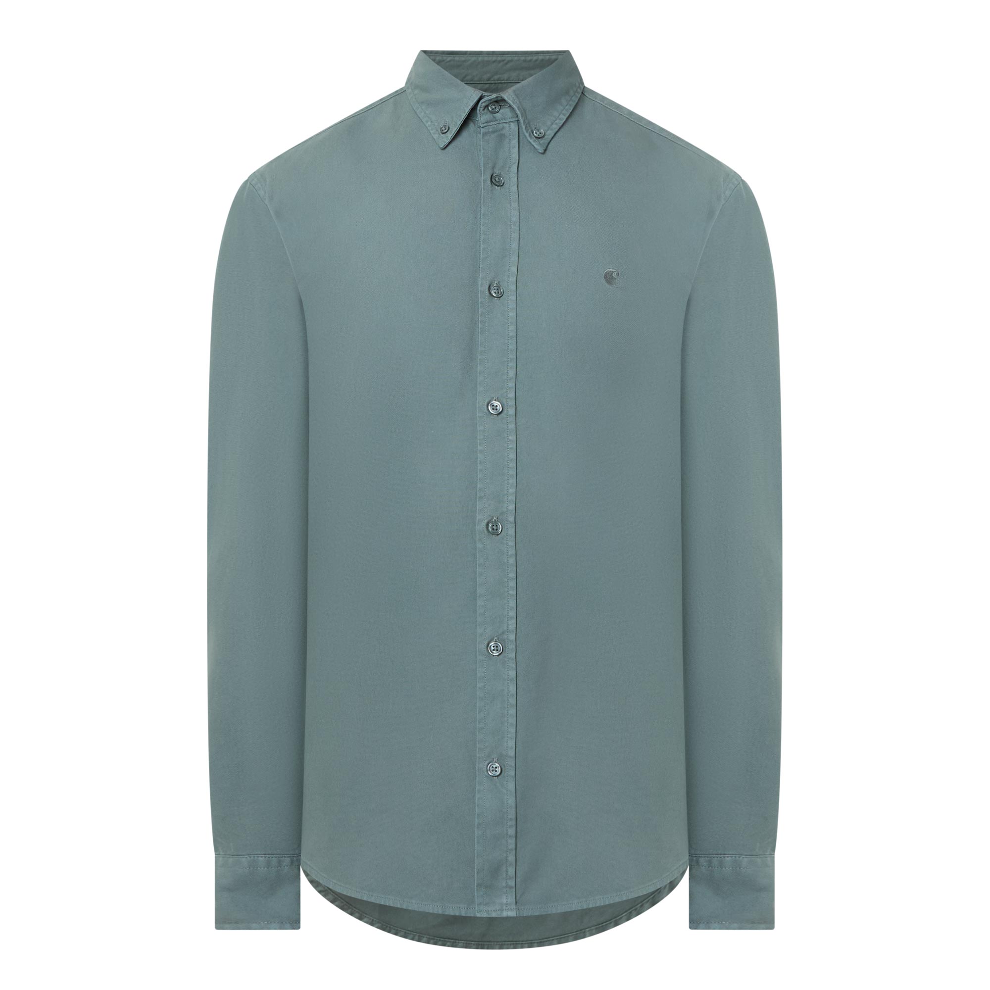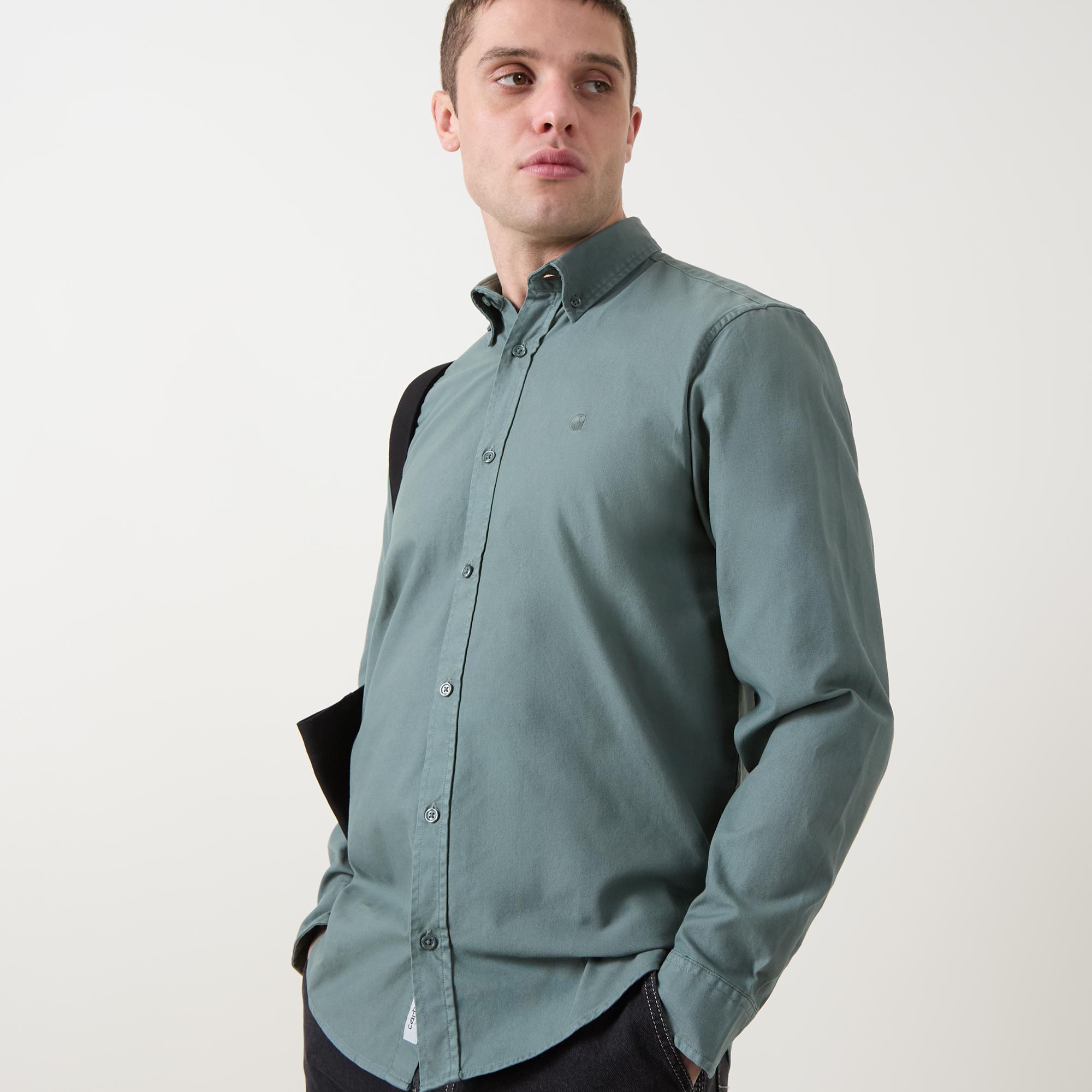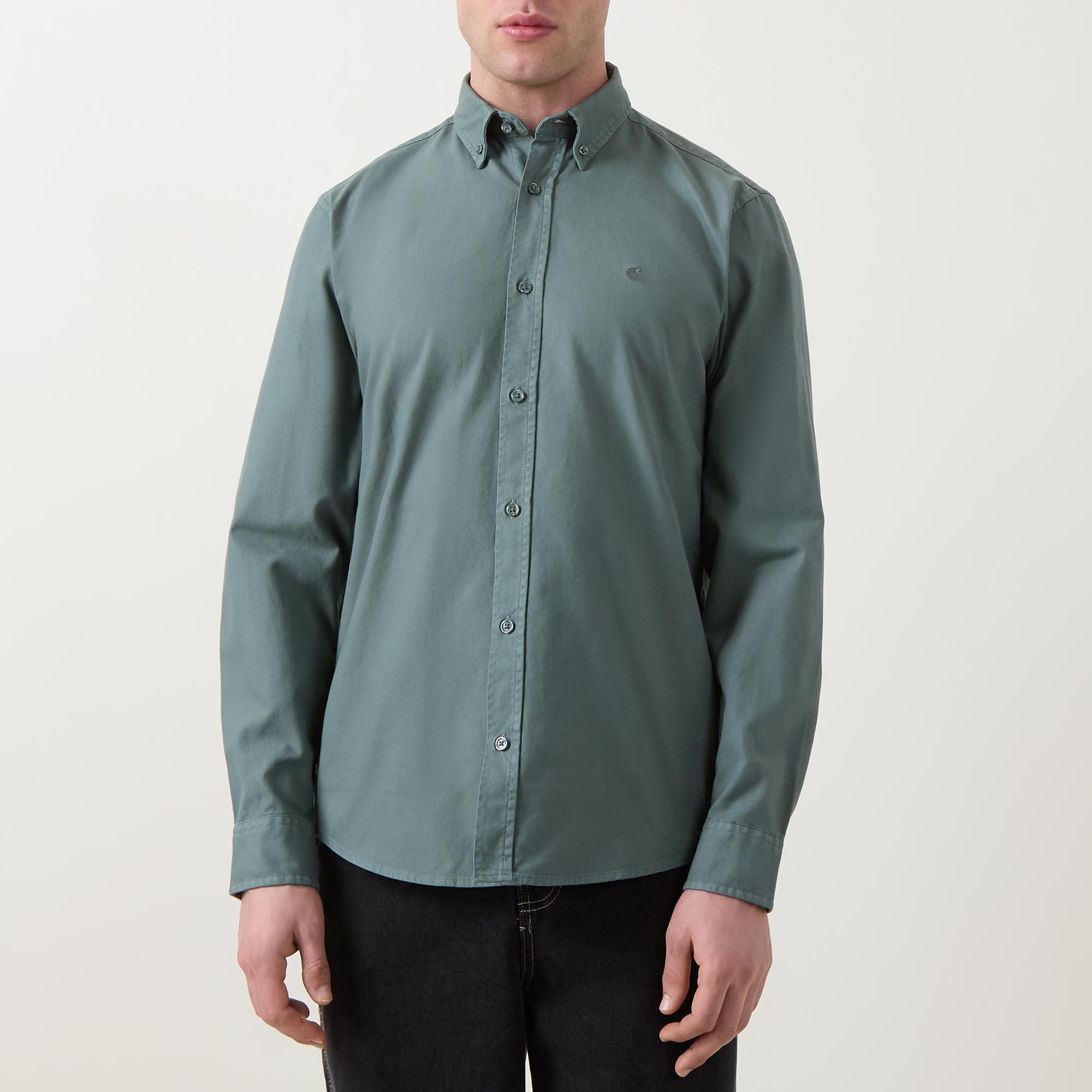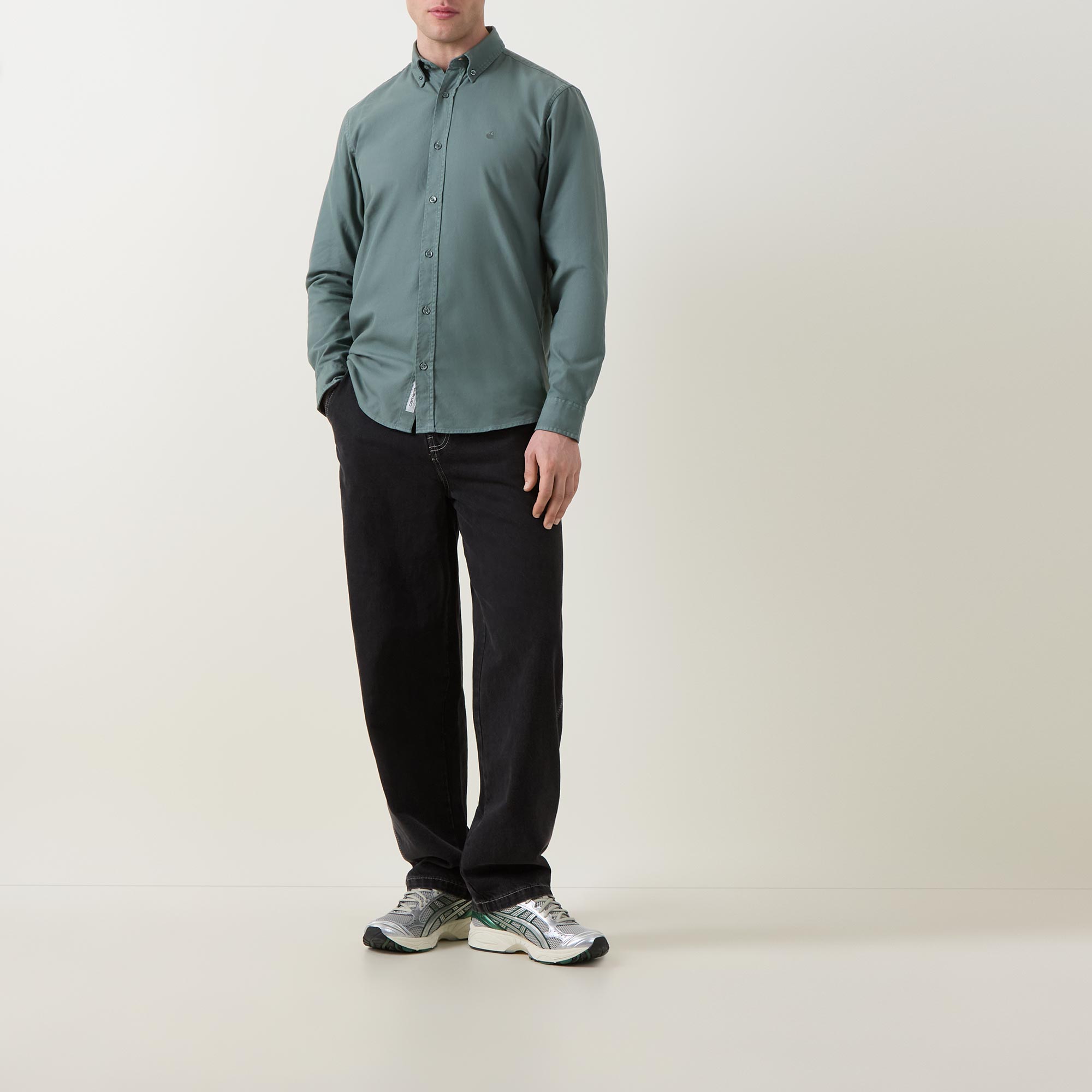 - Button-down collar, long sleeves, logo detail, curved hemline, button fastenings