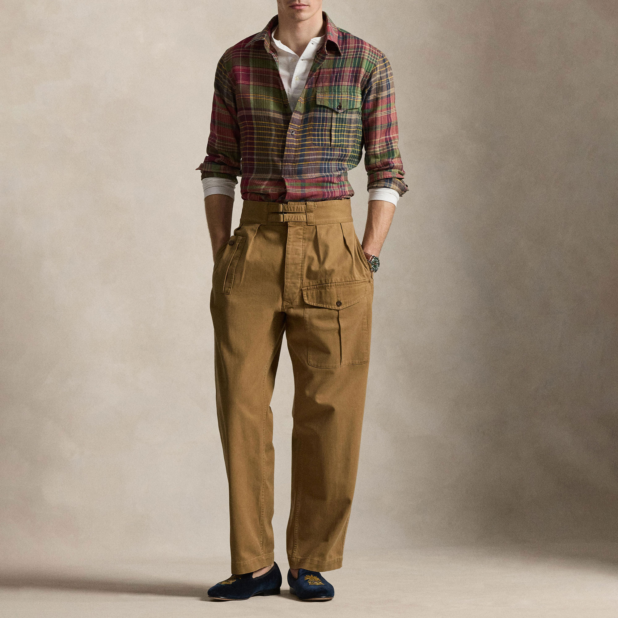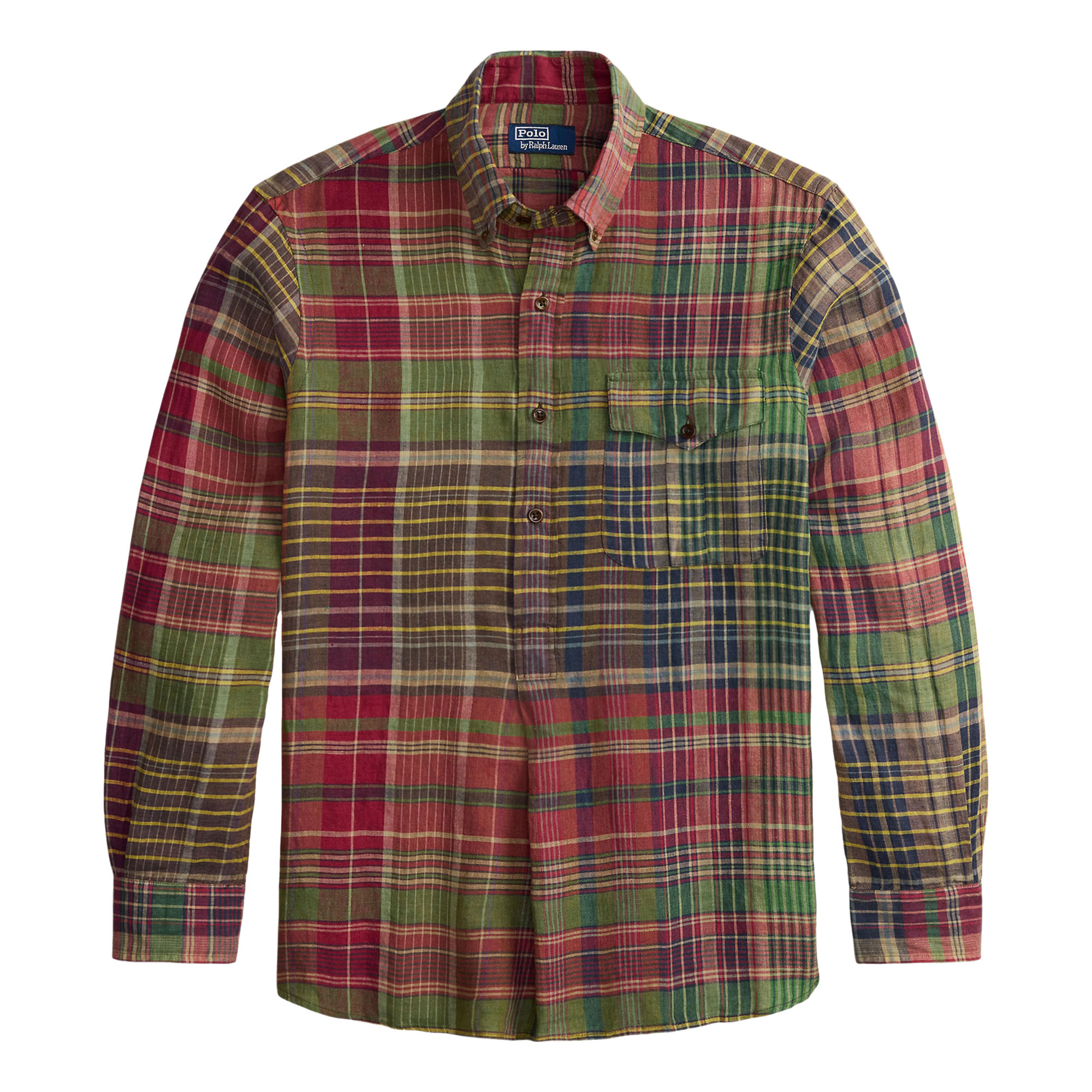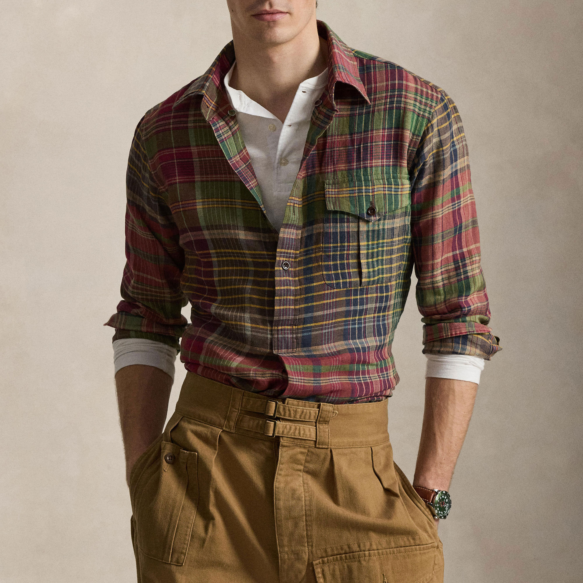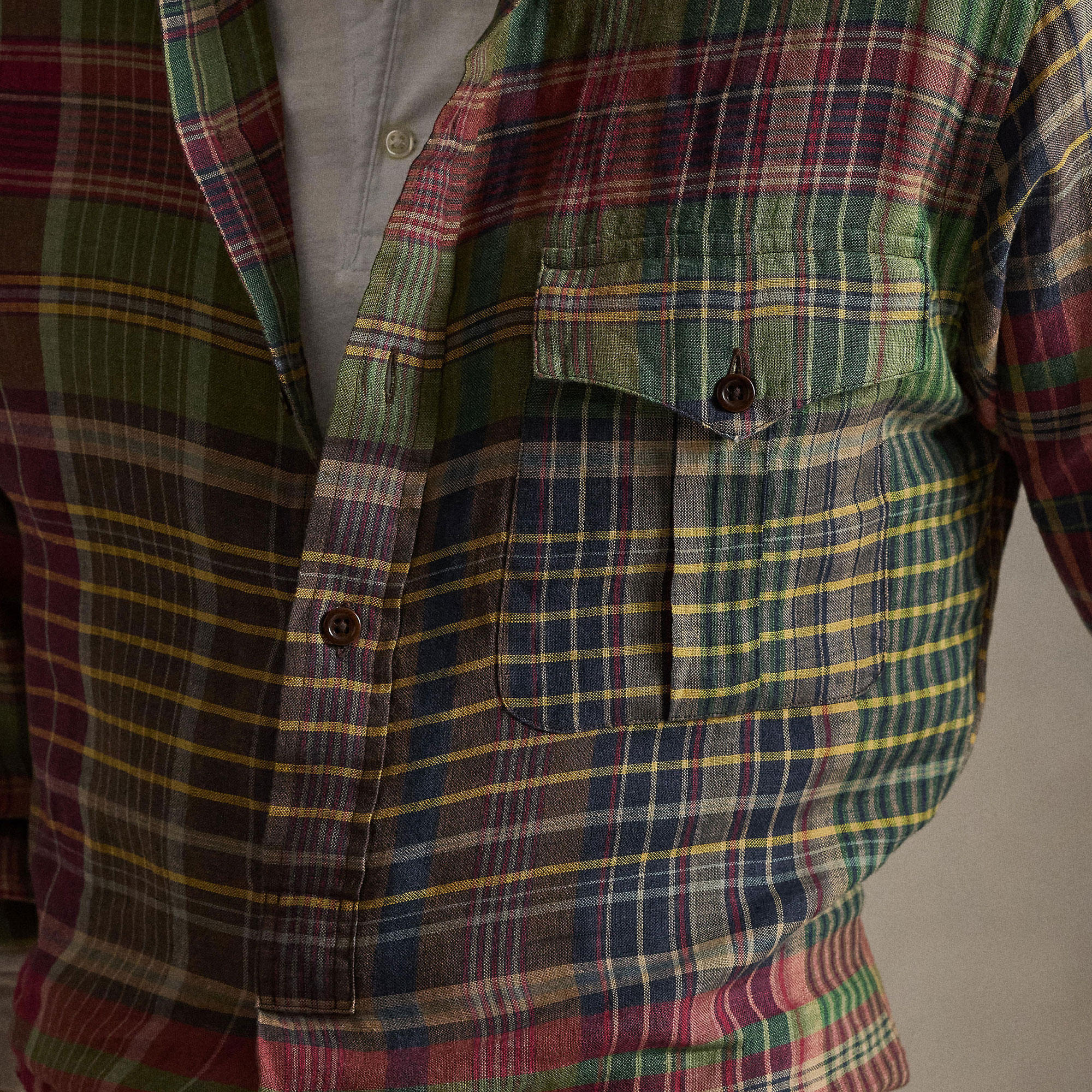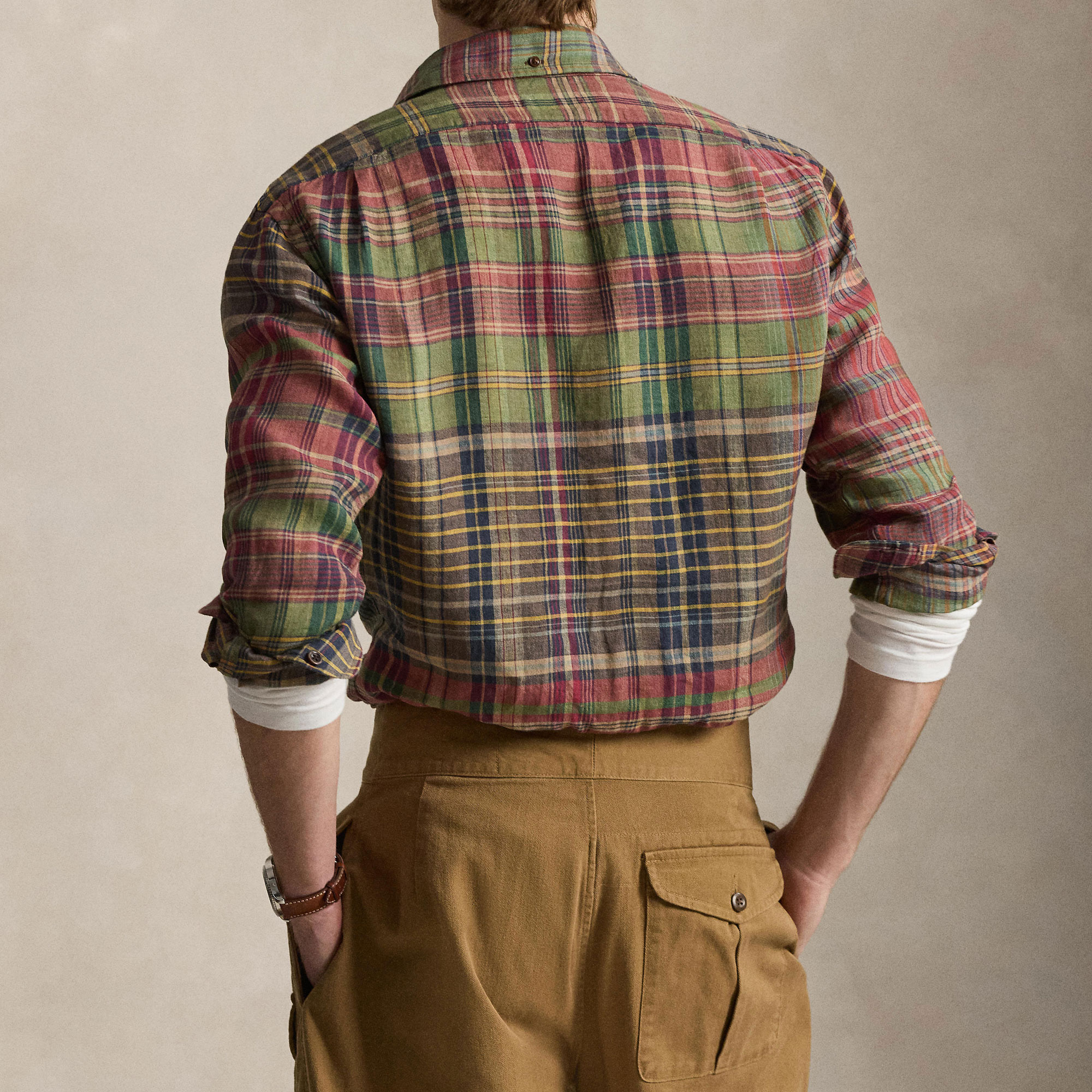• Slub linen fabric, plaid check pattern, corozo buttons, button-down collar, button at the back of the collar, half-buttoned placket, long sleeves, buttoned barrel cuffs, left chest buttoned patch pocket, pleated back yoke