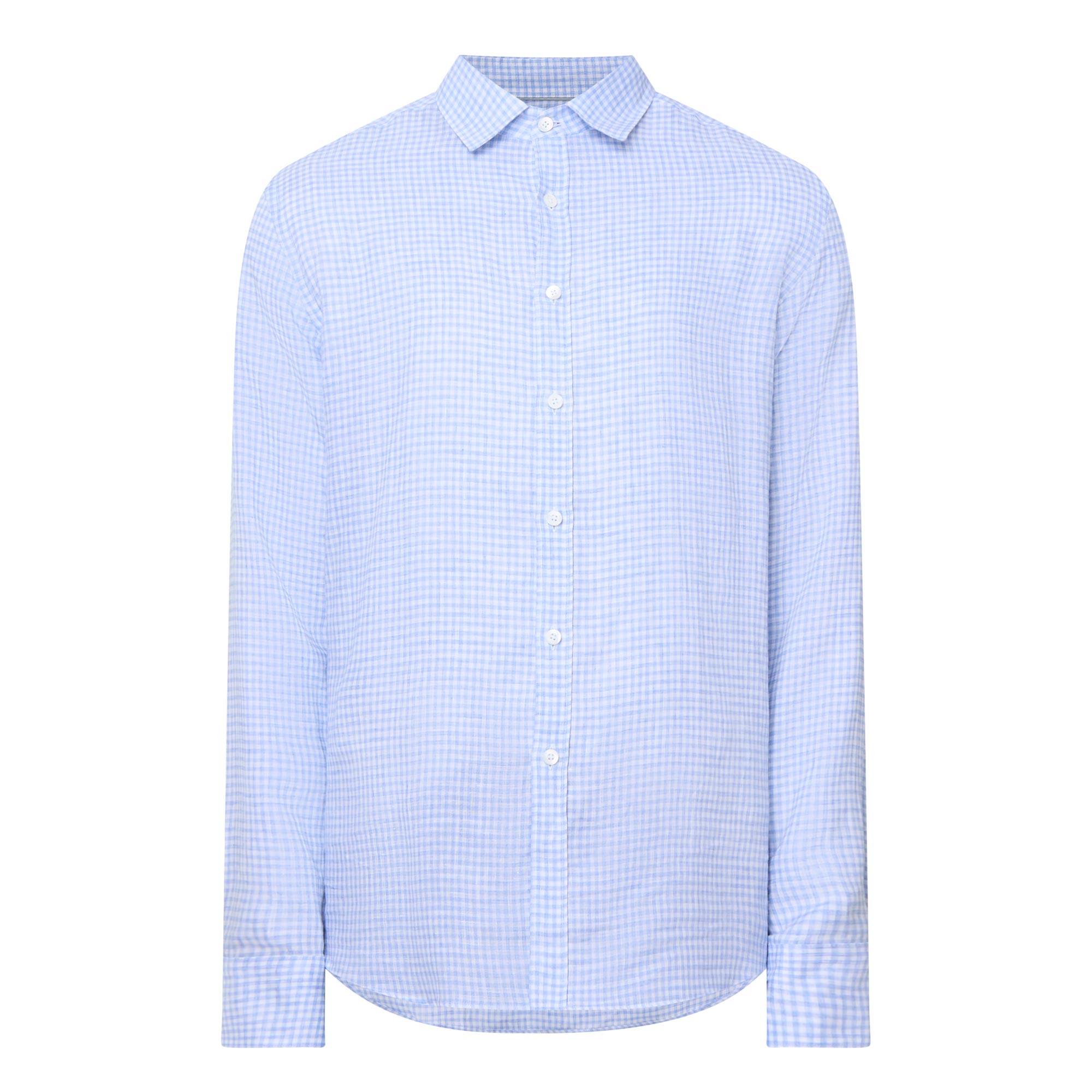 - Cut-away collar, long sleeves, single-cuff, curved hemline, button fastening, check pattern