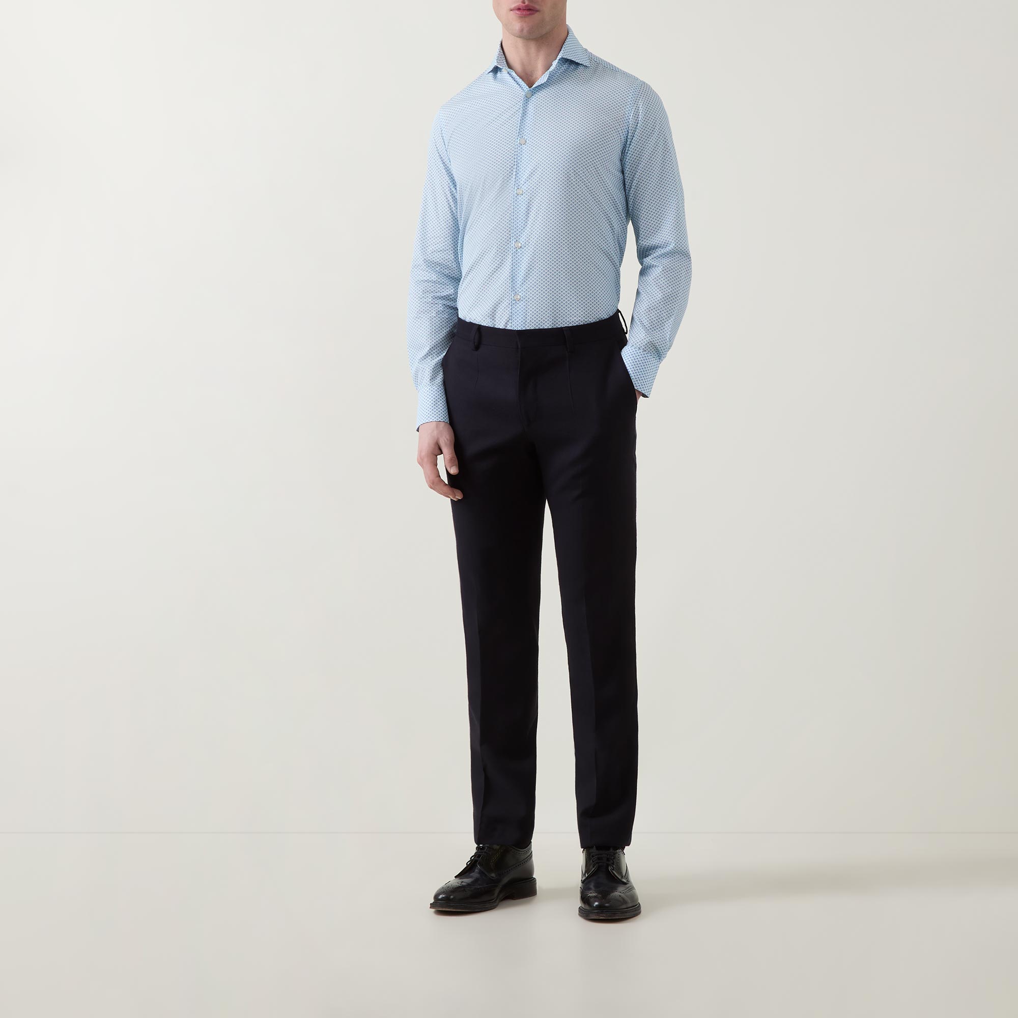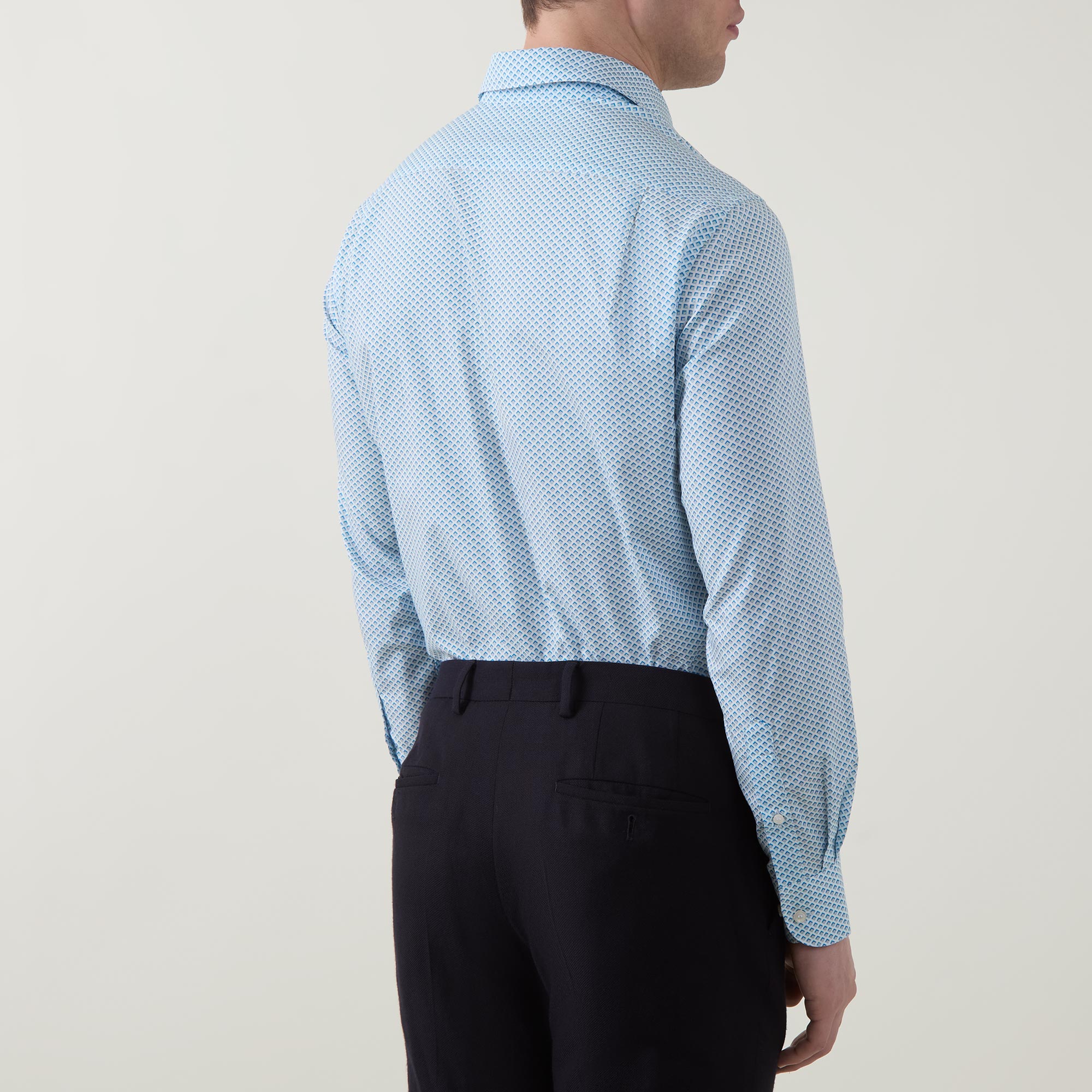 - Cutaway collar, long sleeves, button fastenings, geometric pattern, single-button cuffs, tonal stitching, curved hemline, smooth fabric