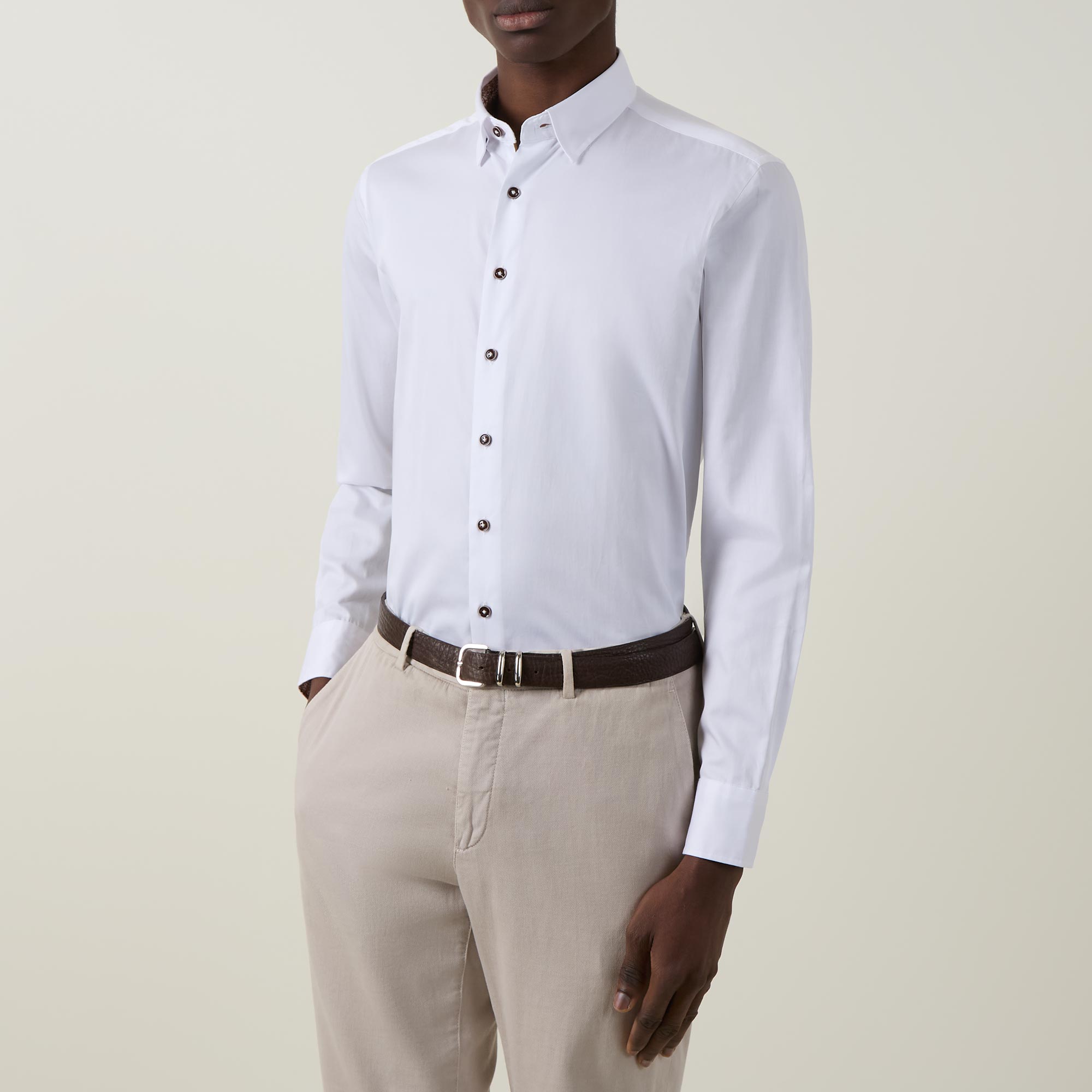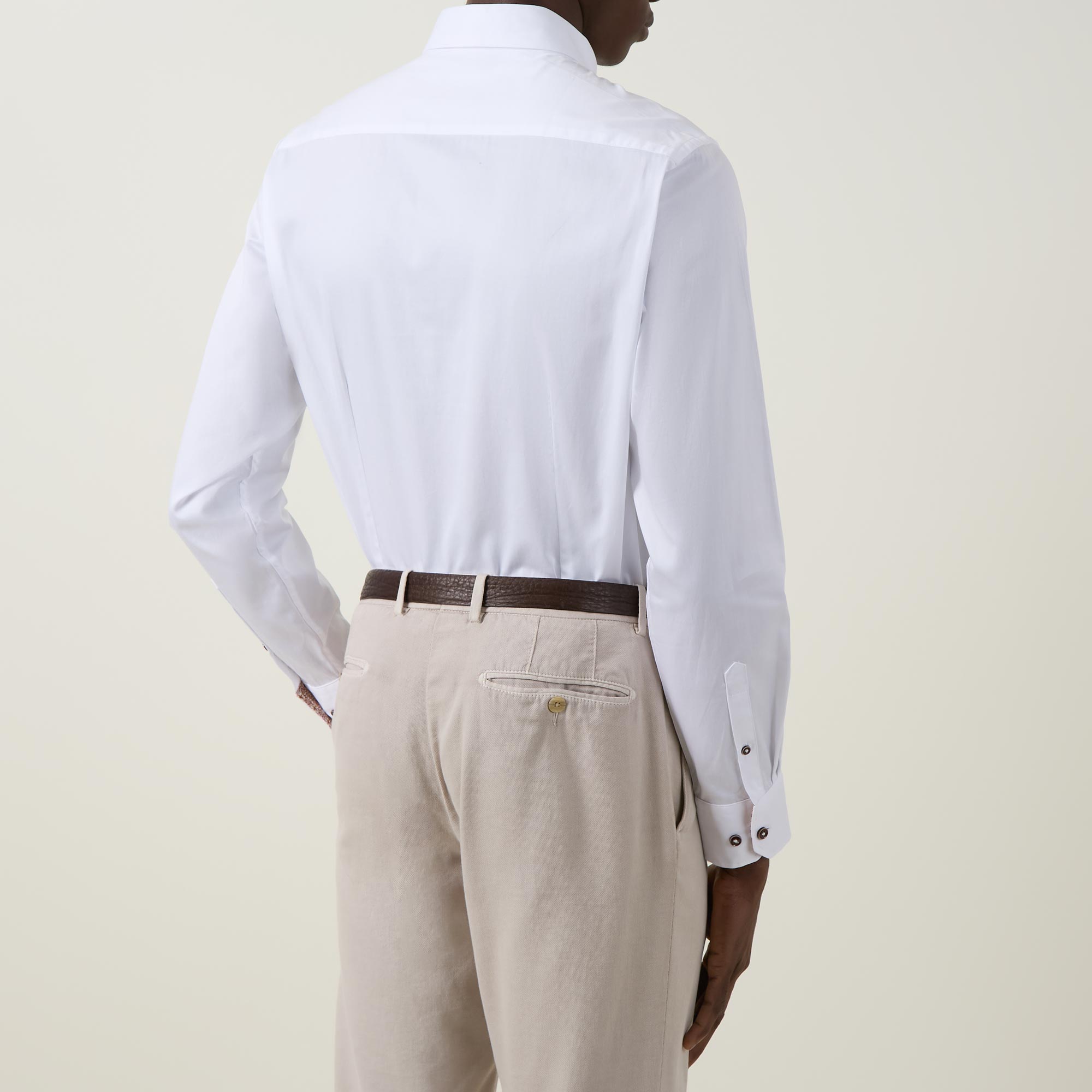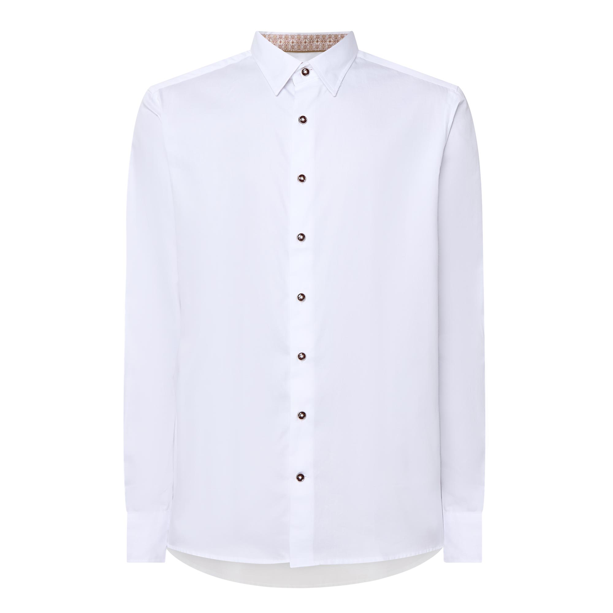 - Point collar, long sleeves, front button placket, geometric inner trim, single-button cuffs, darting to the back, tonal stitching, curved hemline, smooth fabric