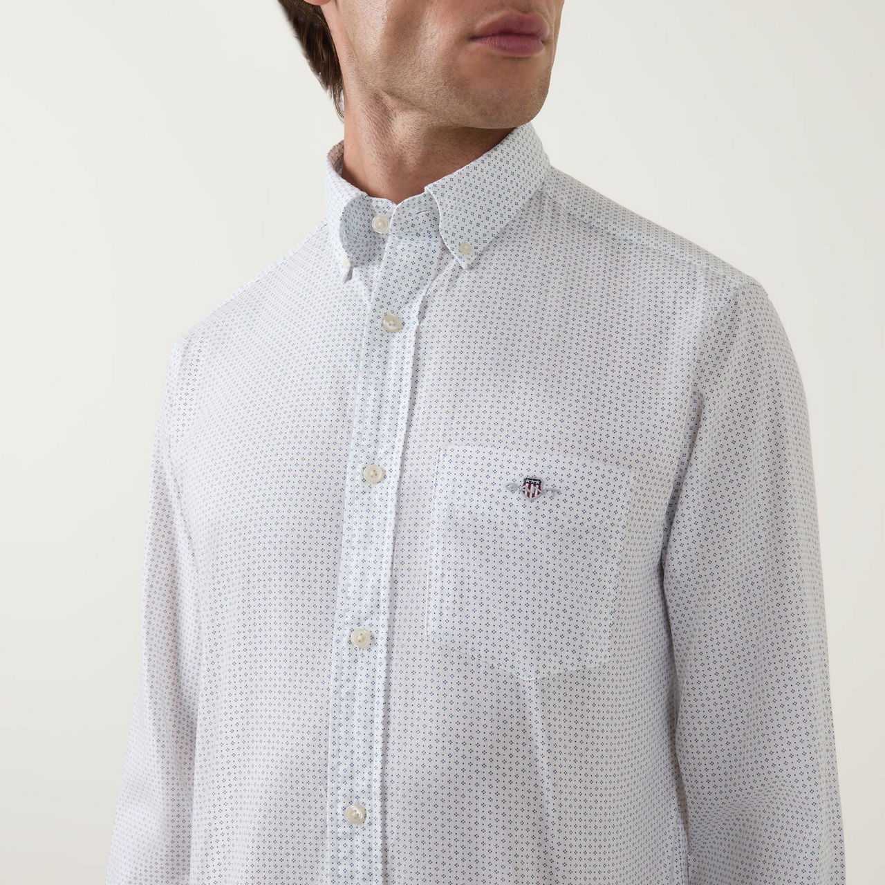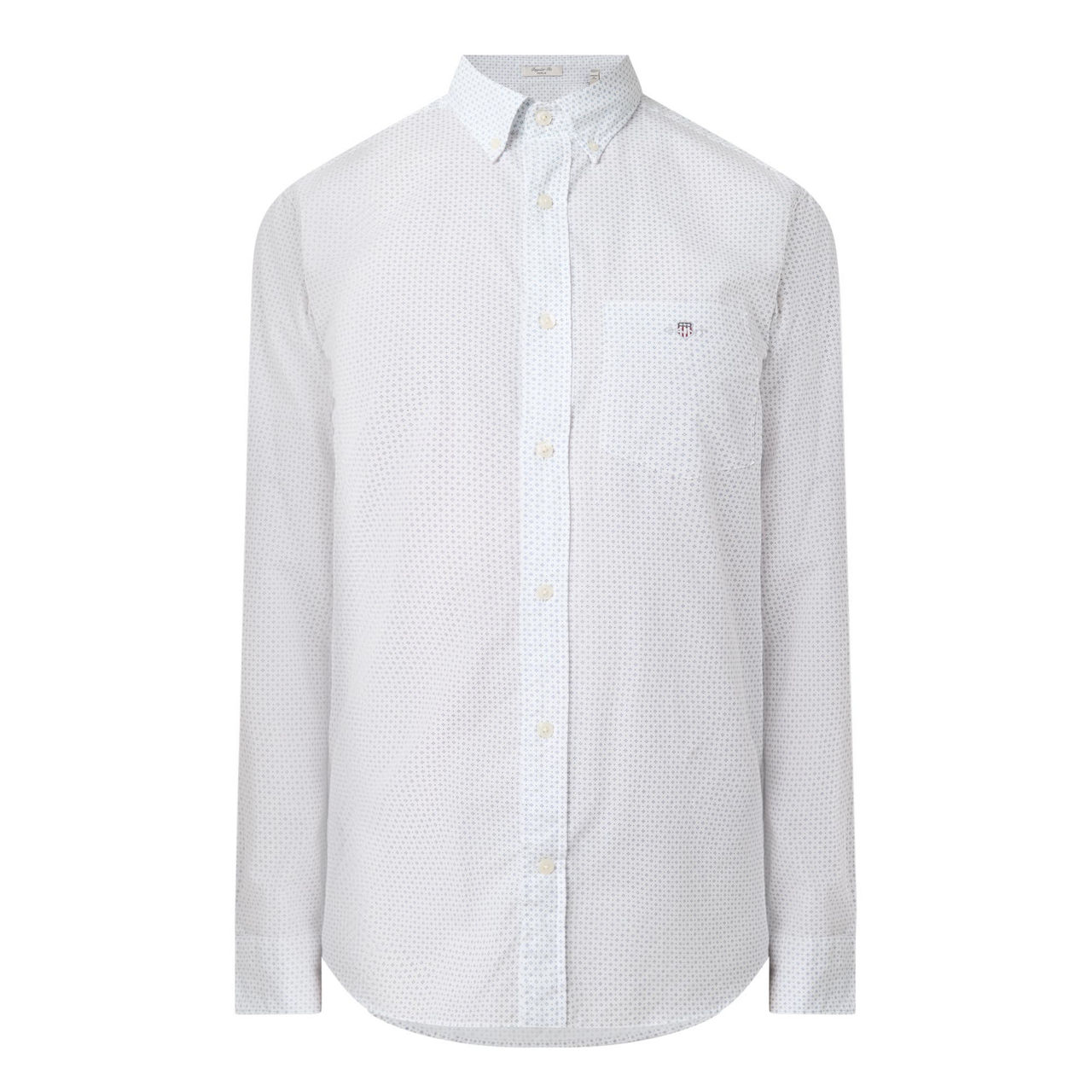 - Long sleeves, pointed collar with button detailing, button fastenings, curved hem, structured buttoned cuffs, micro check print, chest pocket with logo embroidery