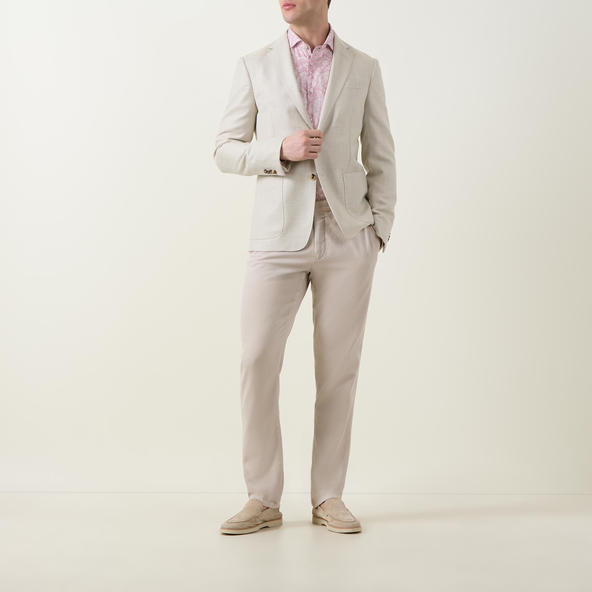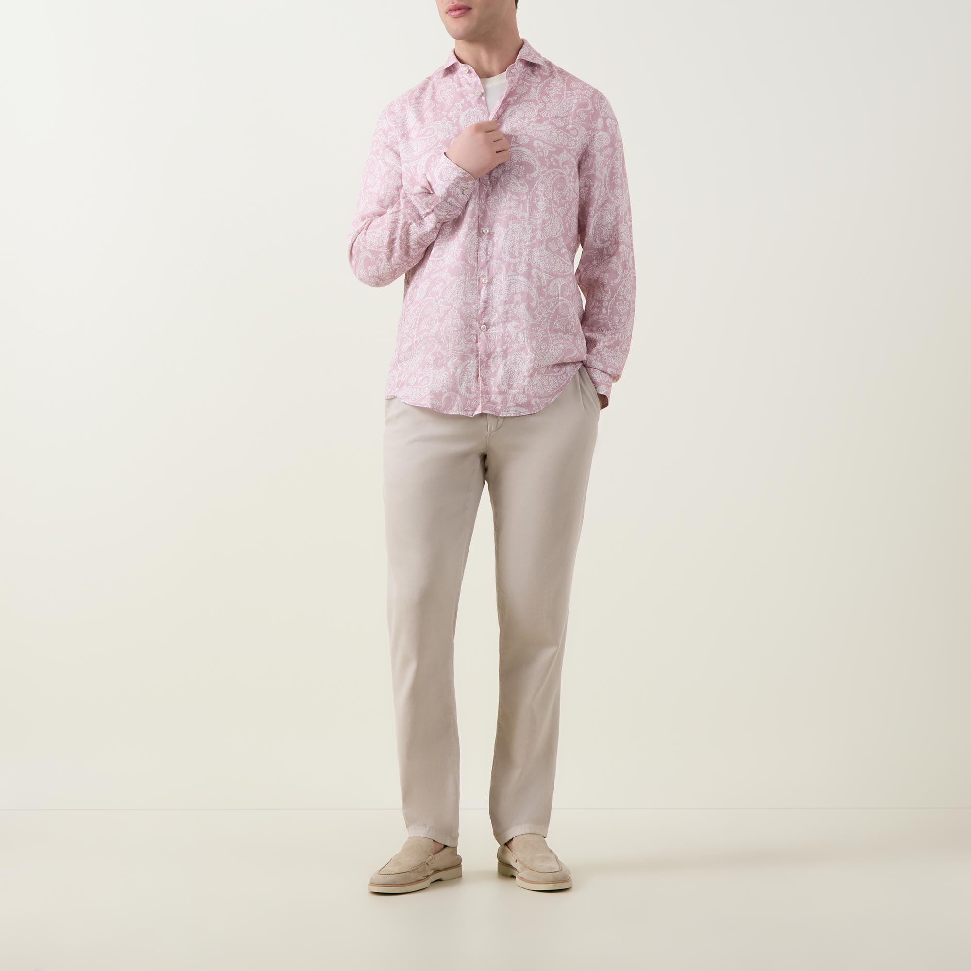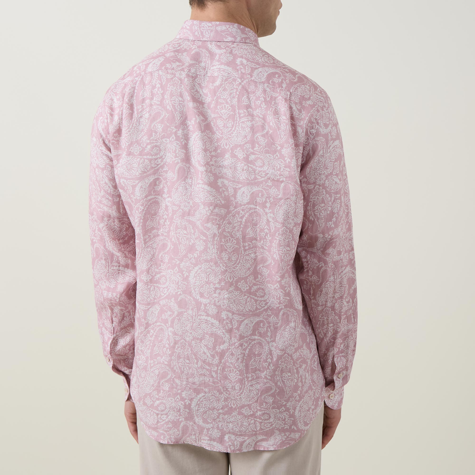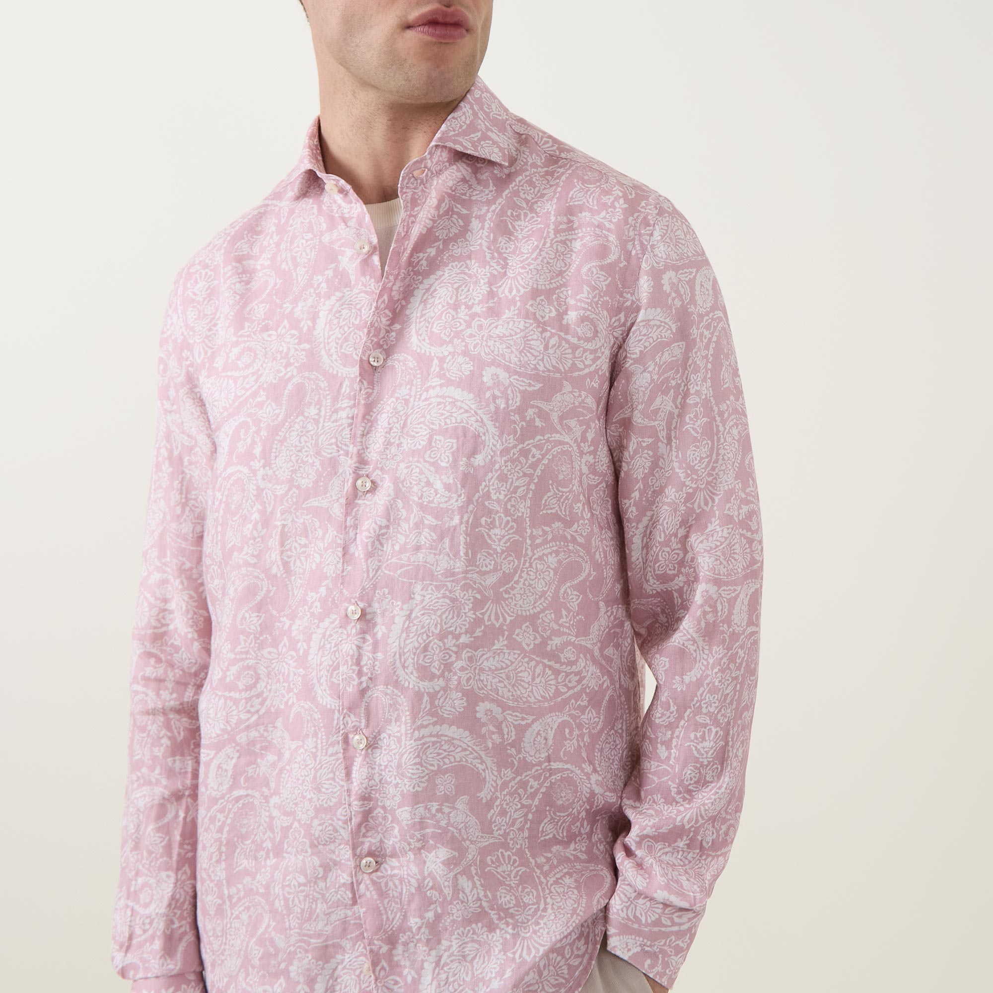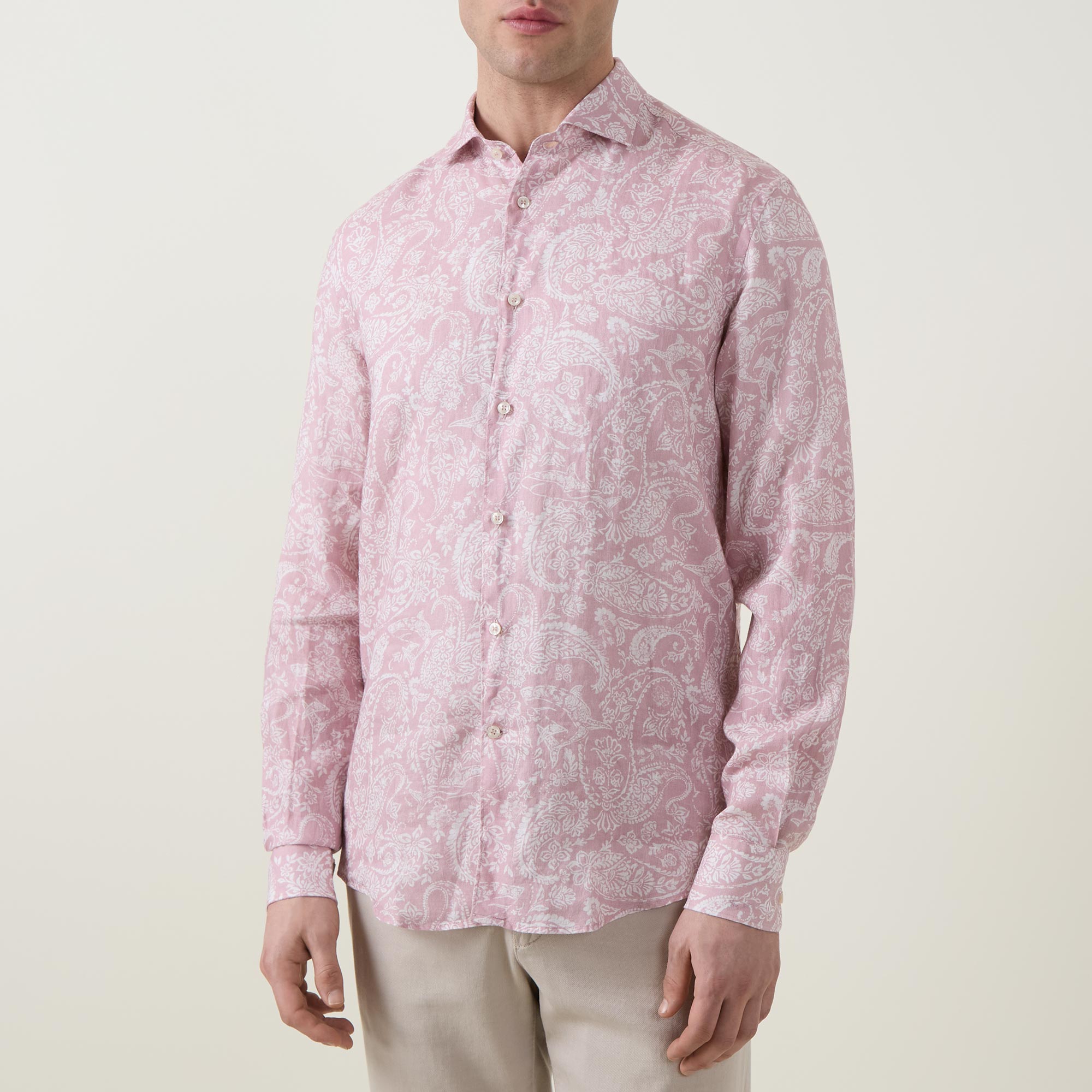 - Cutaway collar, long sleeves, front button placket, paisley pattern, tonal stitching, single-button cuffs, curved hemline, smooth fabric