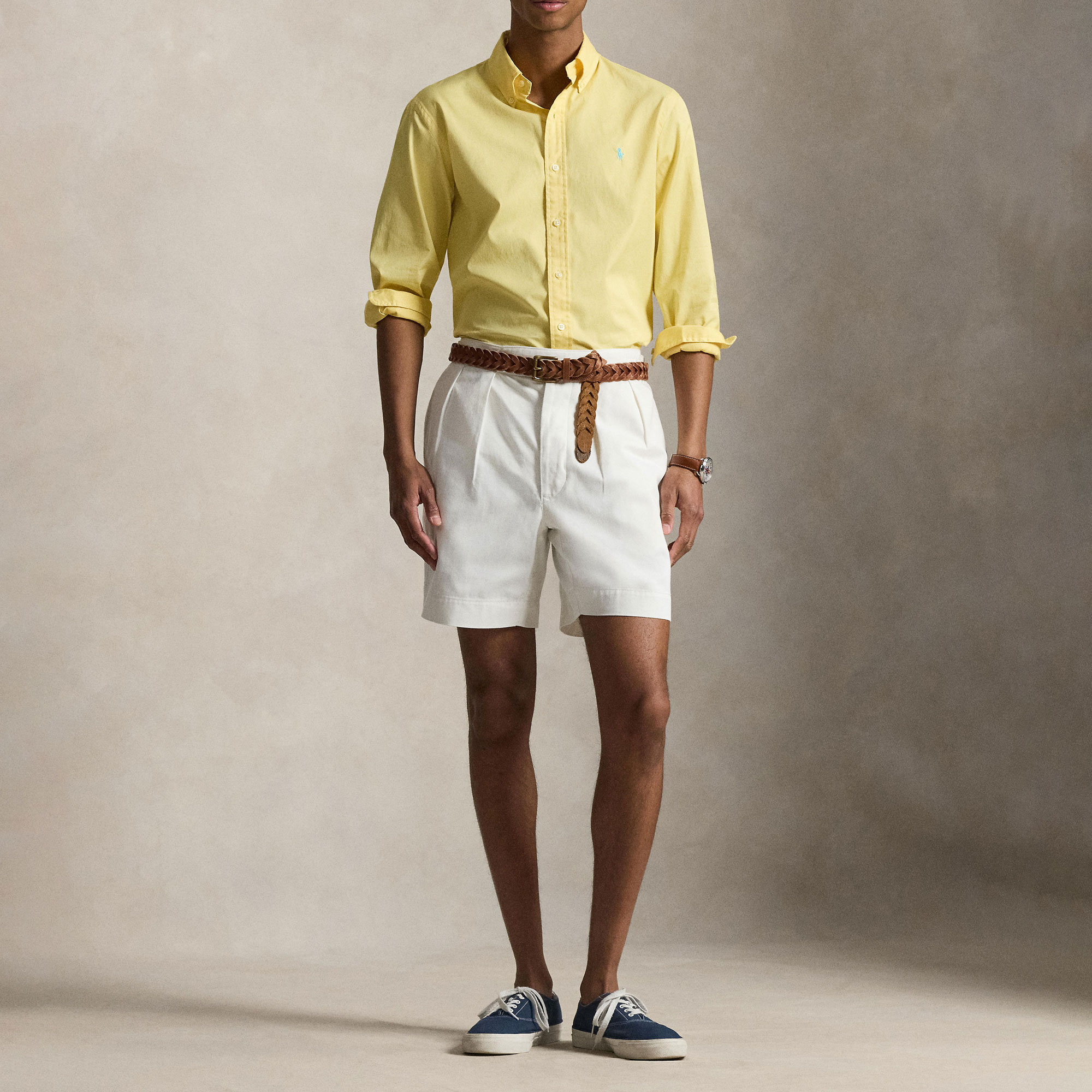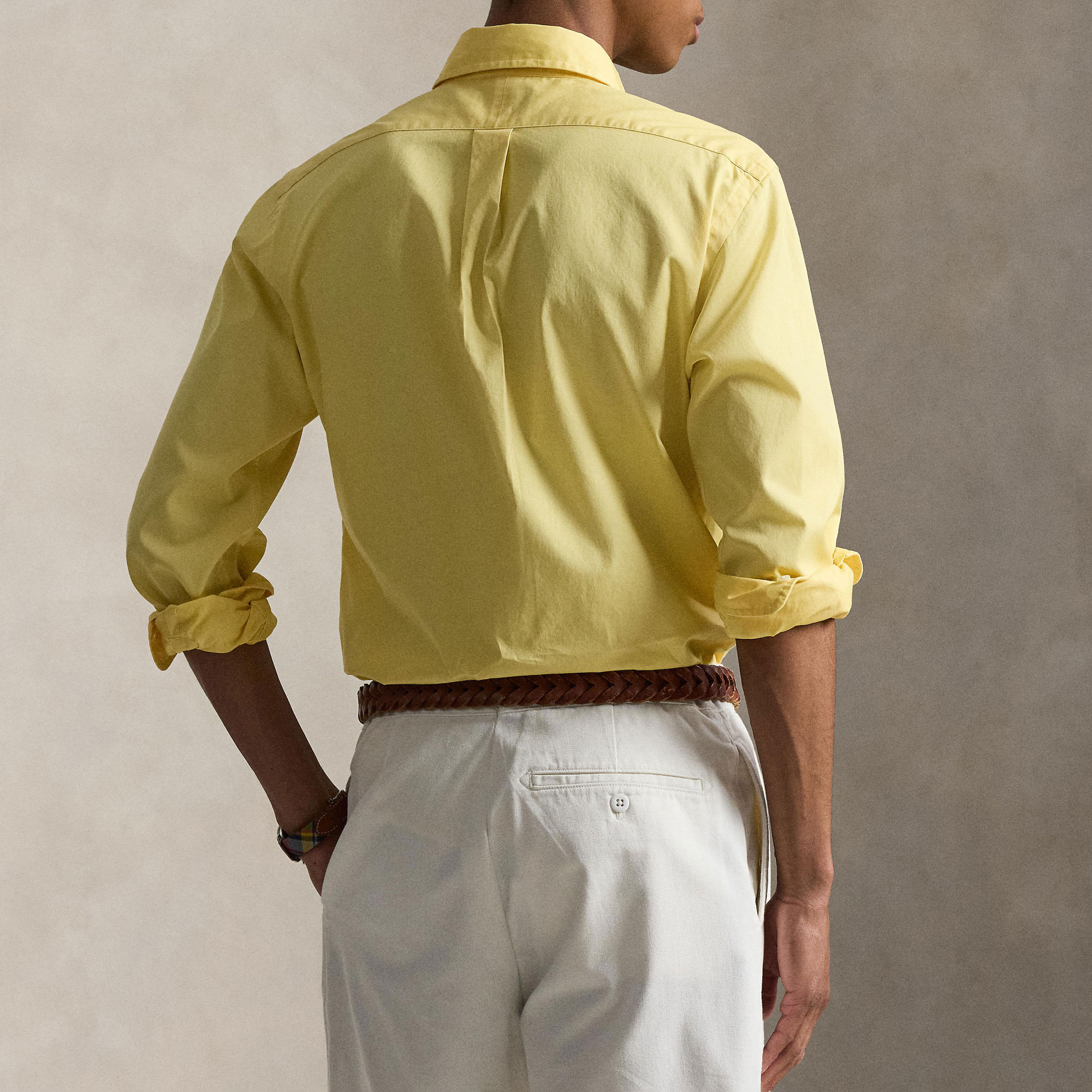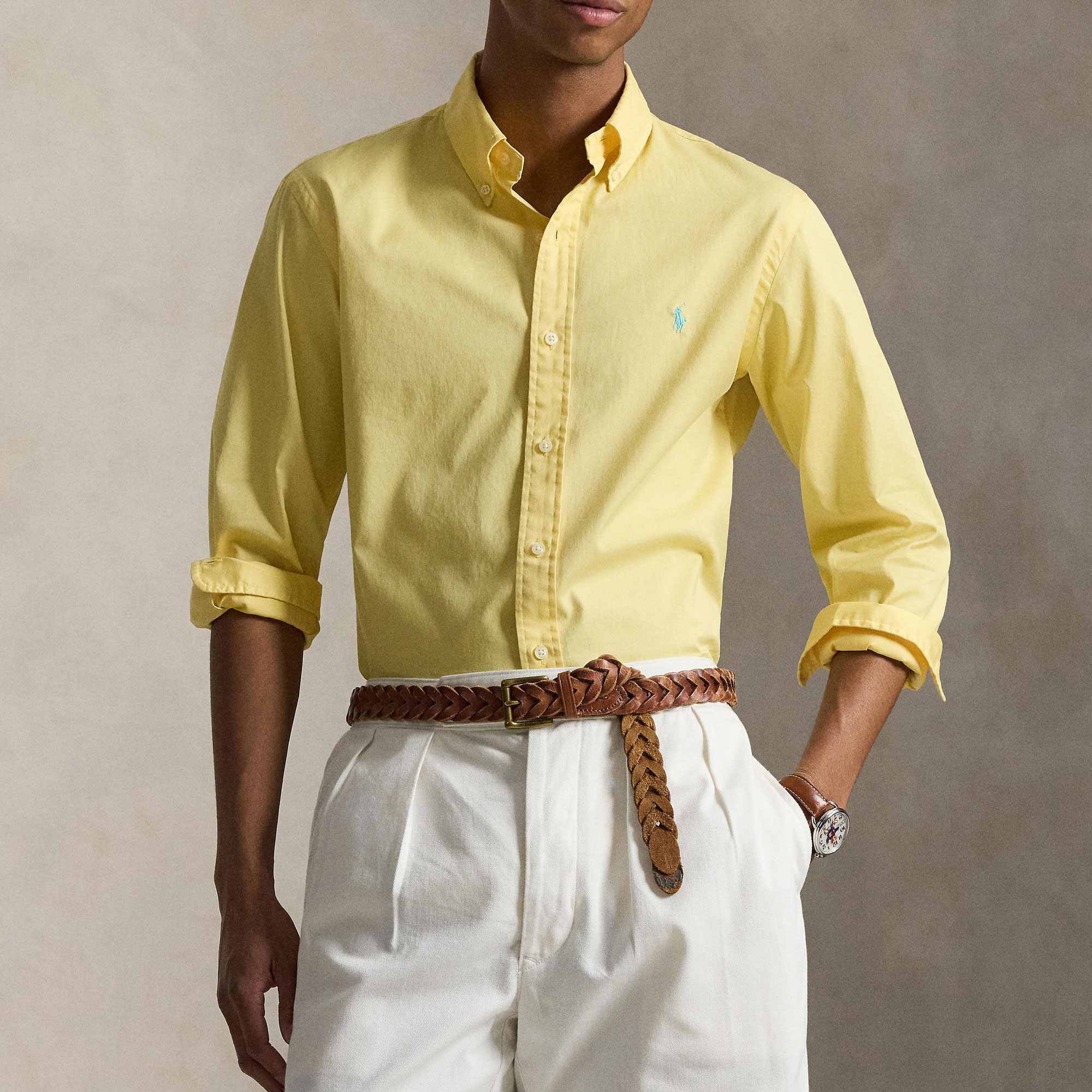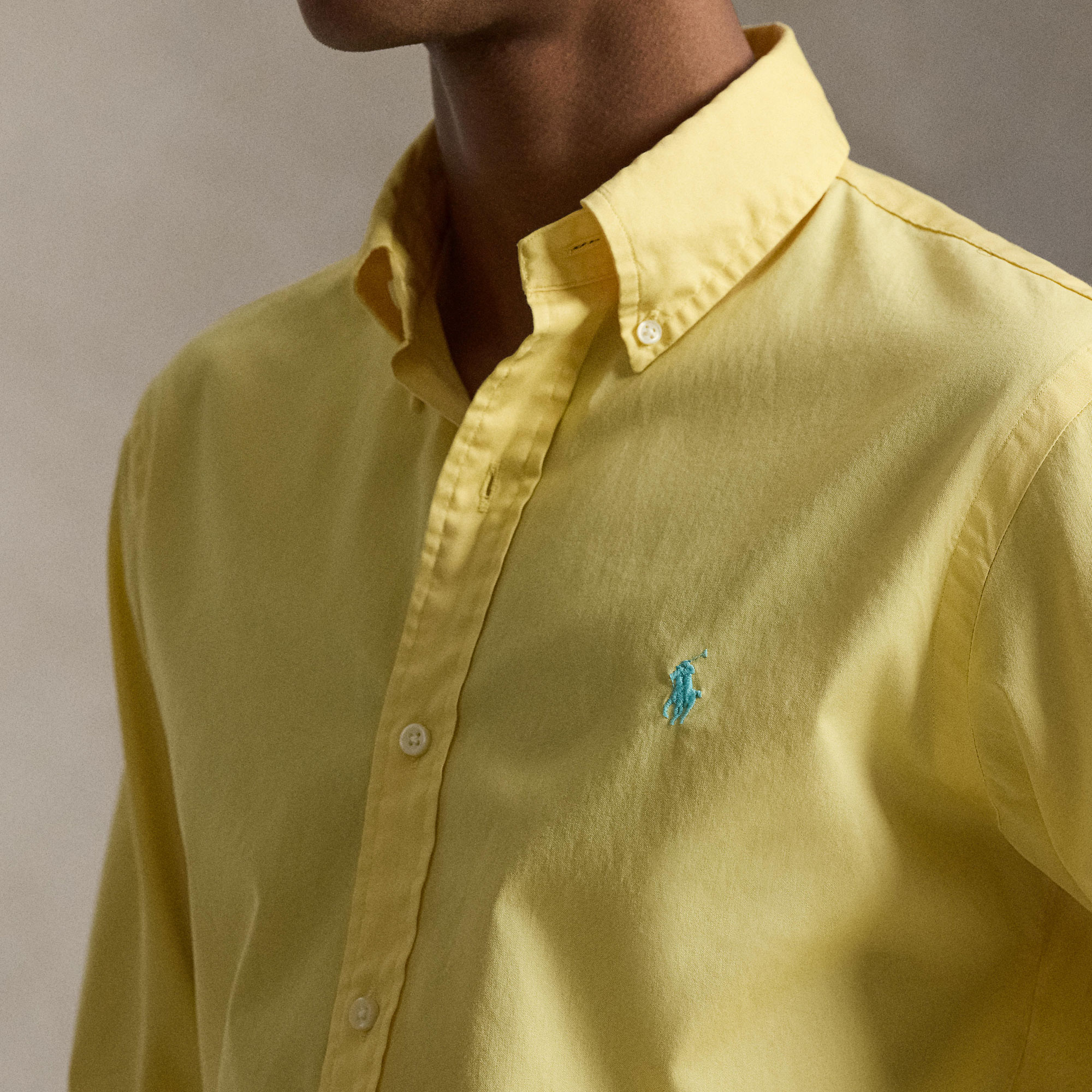 - Button-down collar, buttoned placket, long sleeves, buttoned barrel cuffs, split back yoke, box pleat, signature embroidered Pony logo detail, featherweight twill fabric