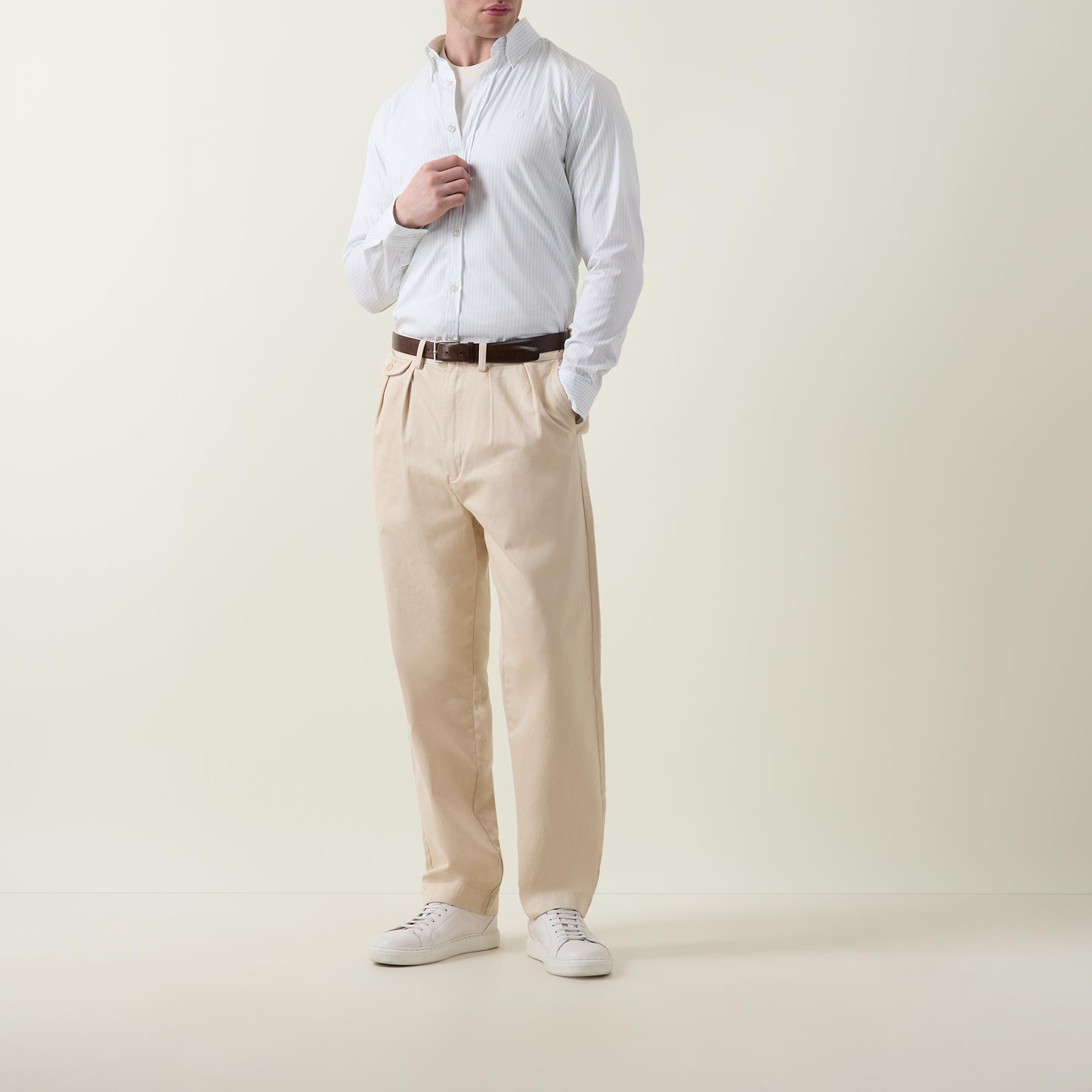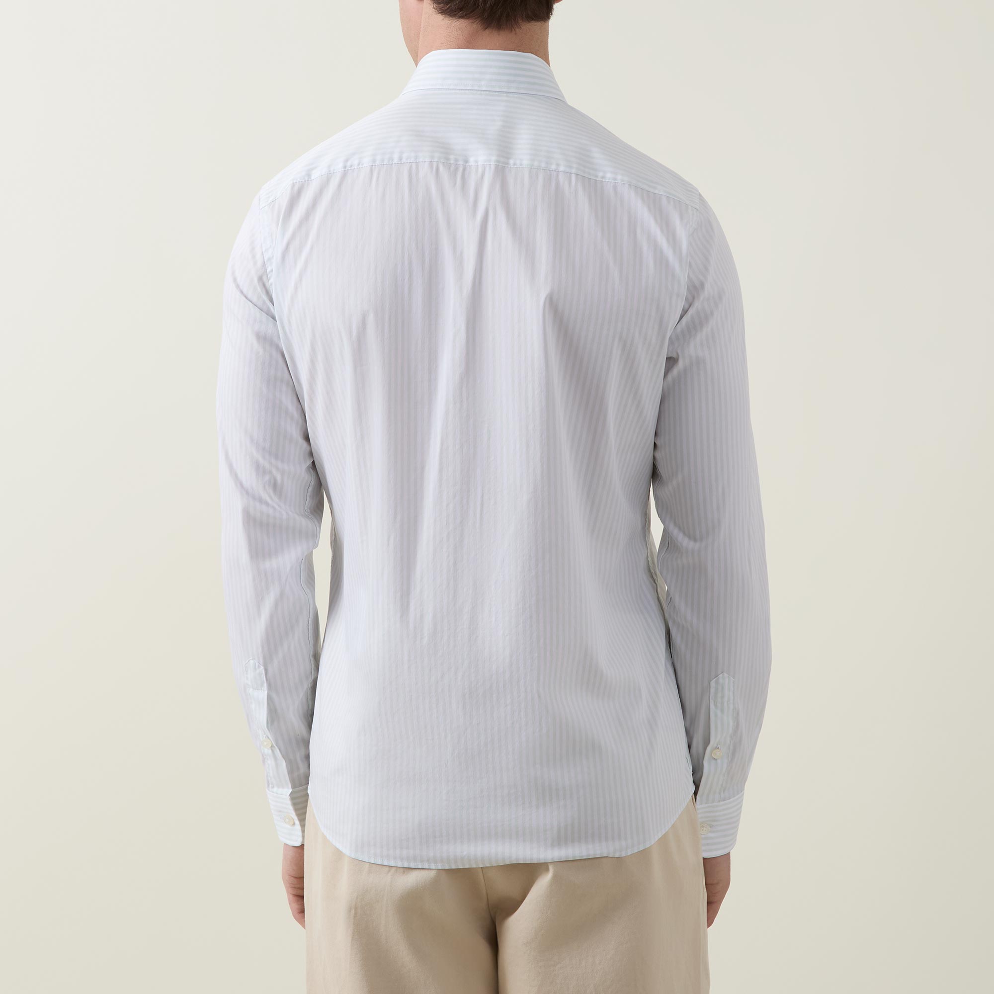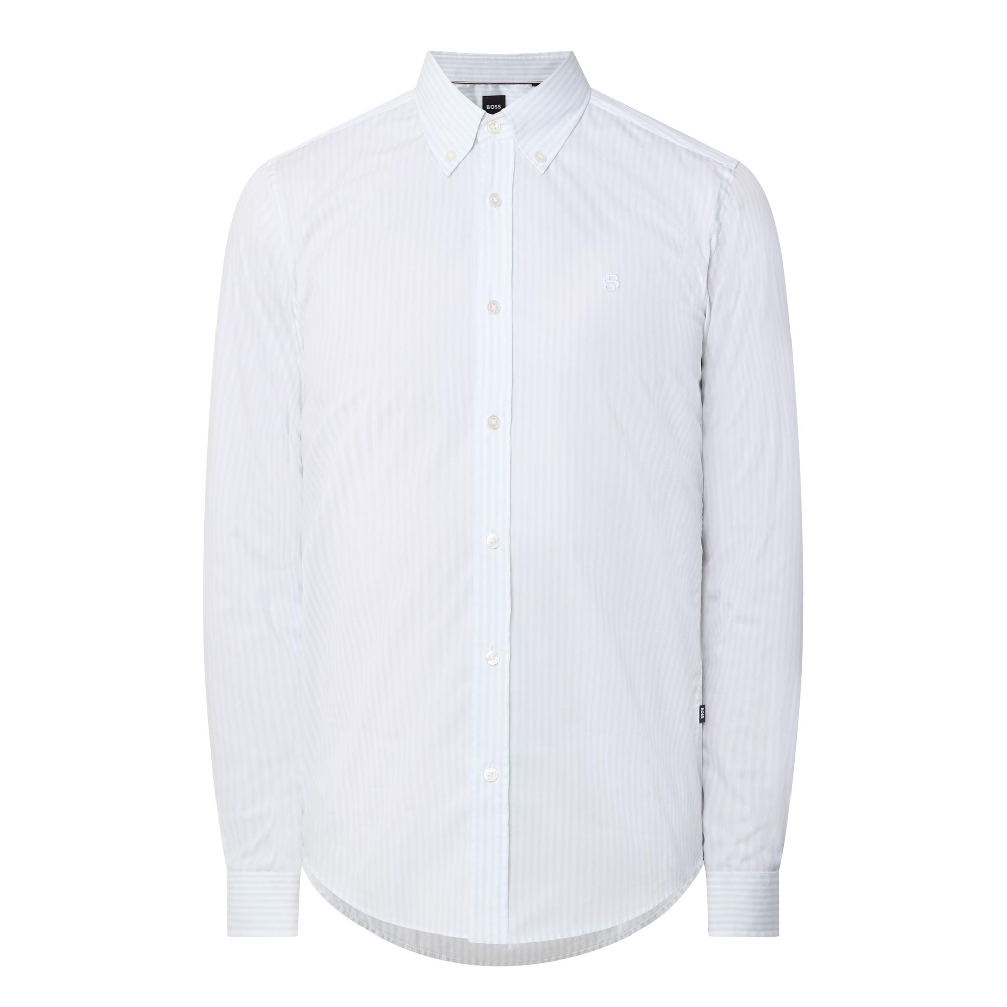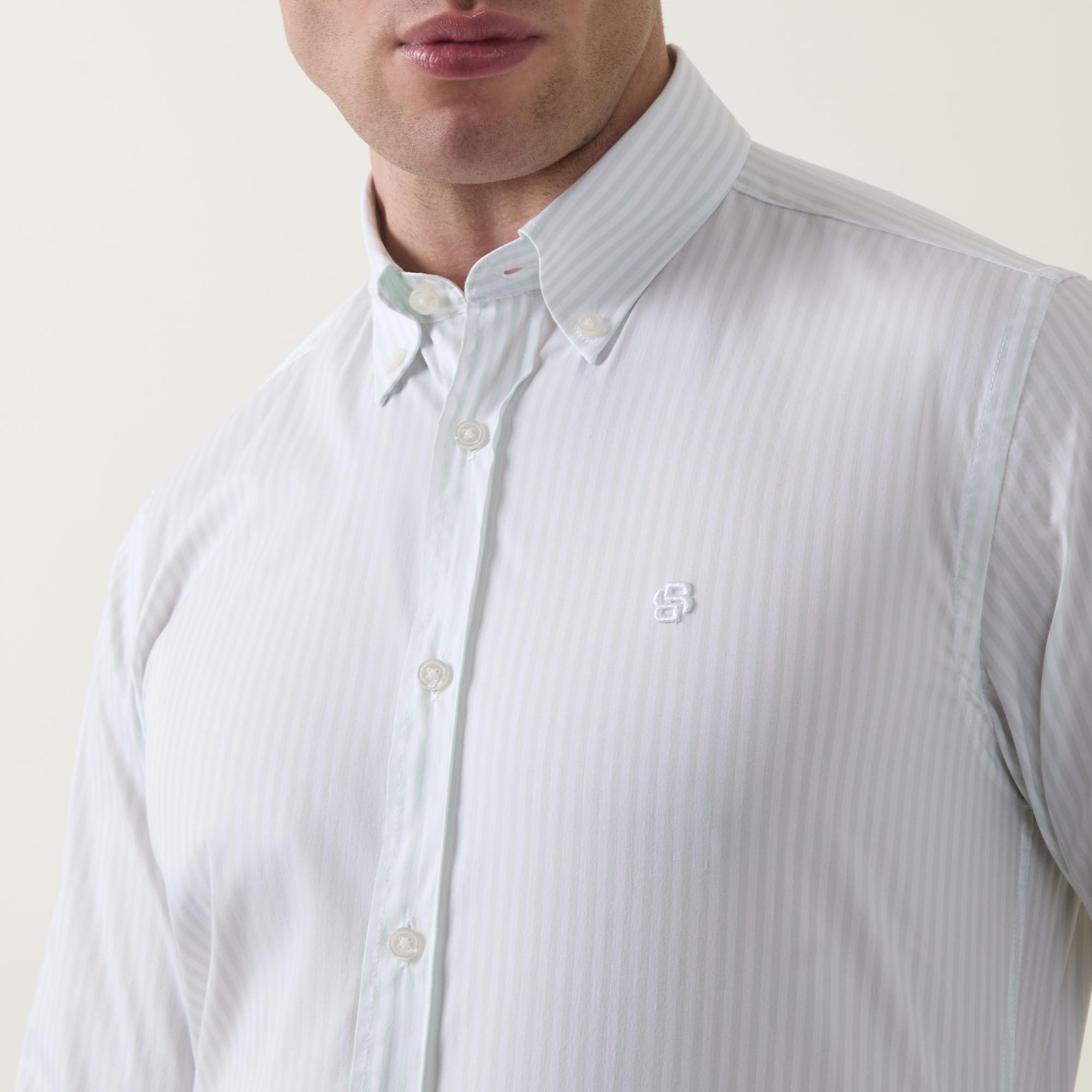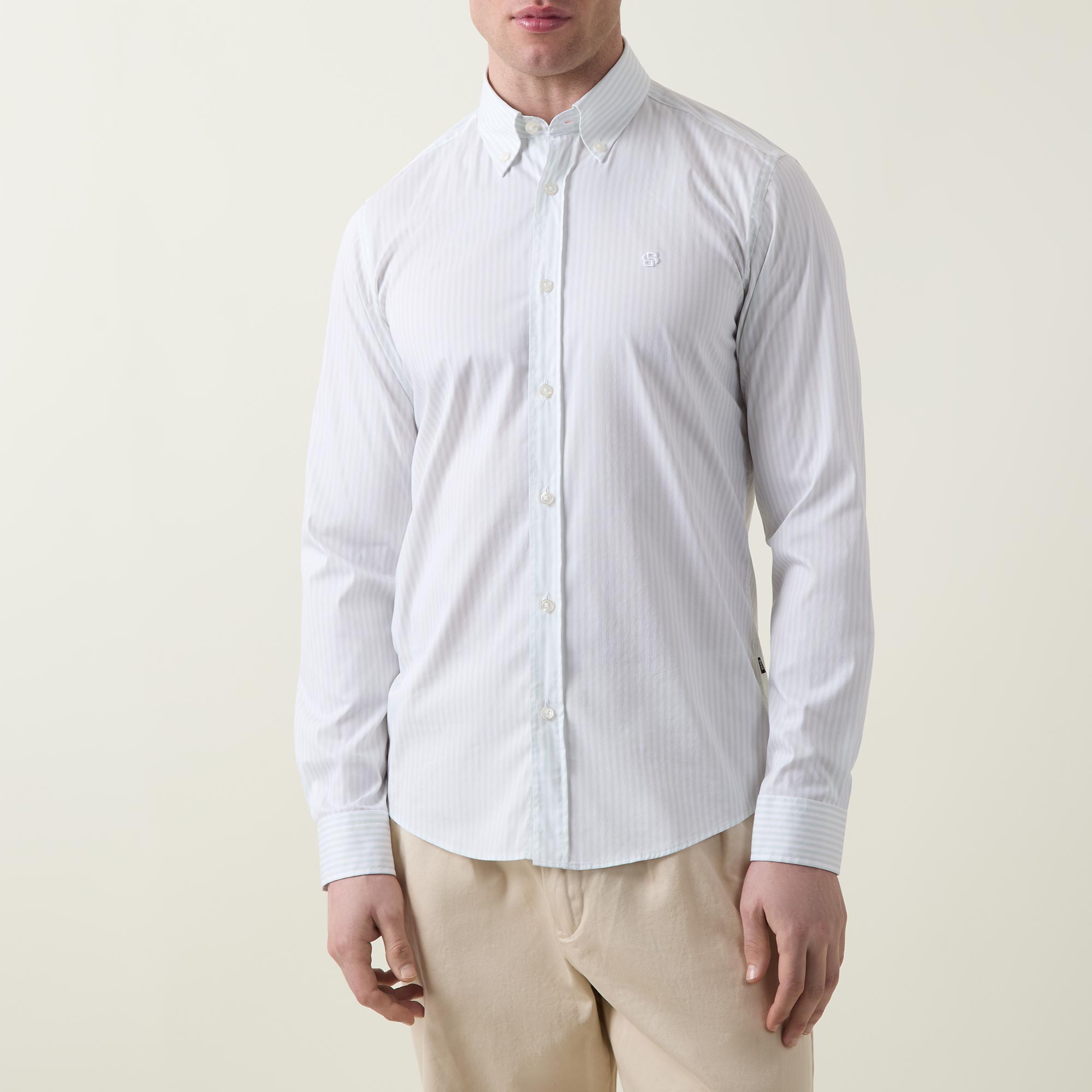 - Striped, button-down collar, long sleeves, curved hemline, button fastenings, logo detail